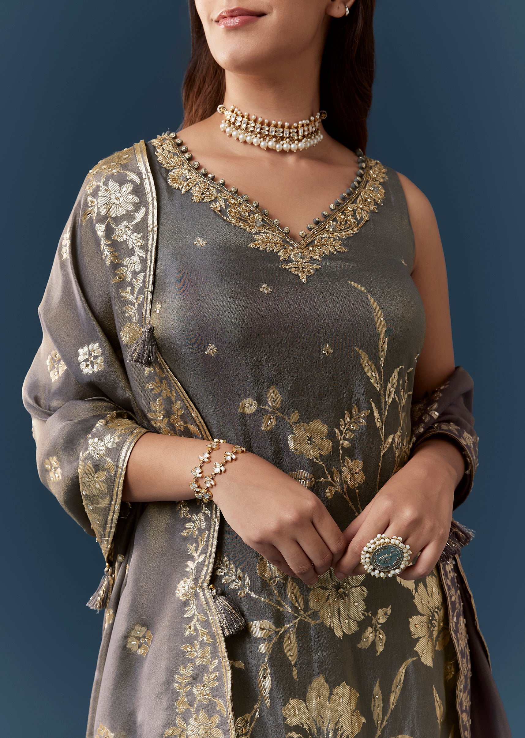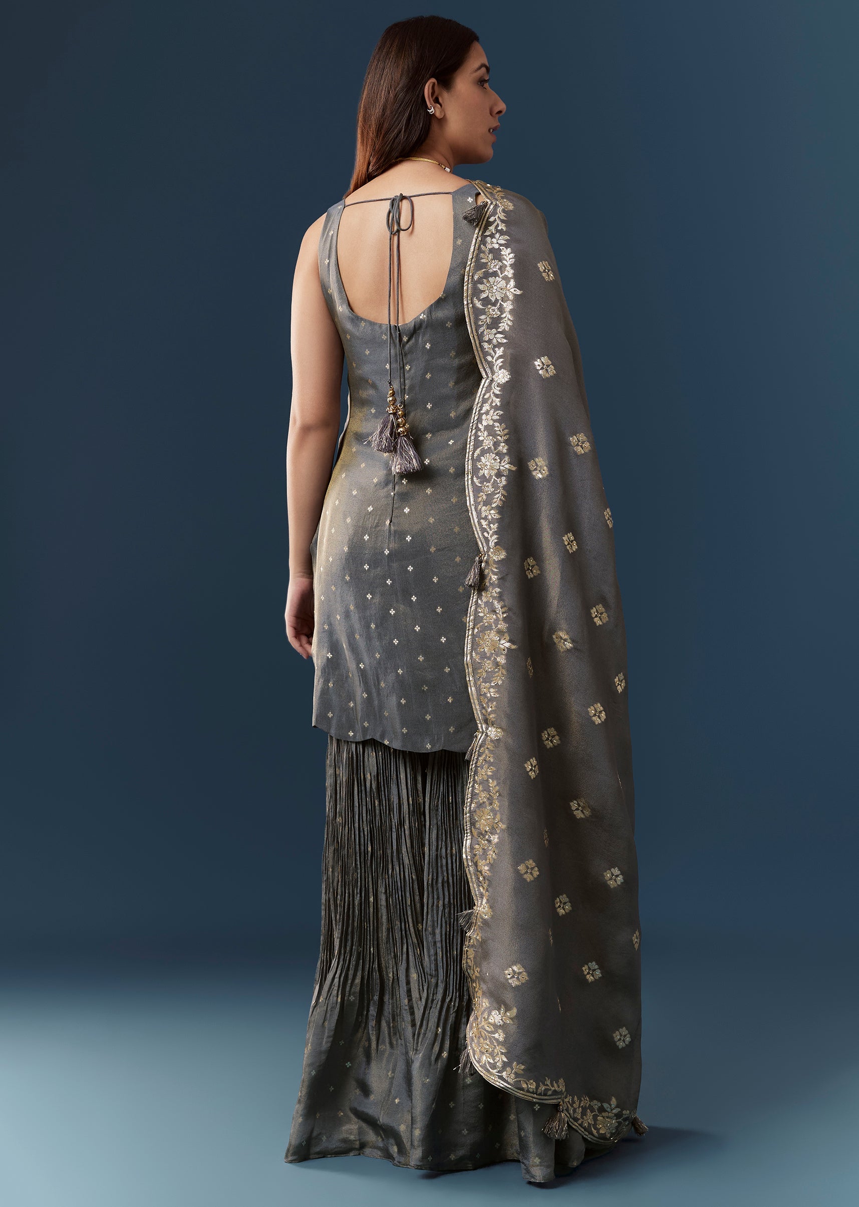 Grey Jacquard Weave Stone Work Kurta Sharara Set