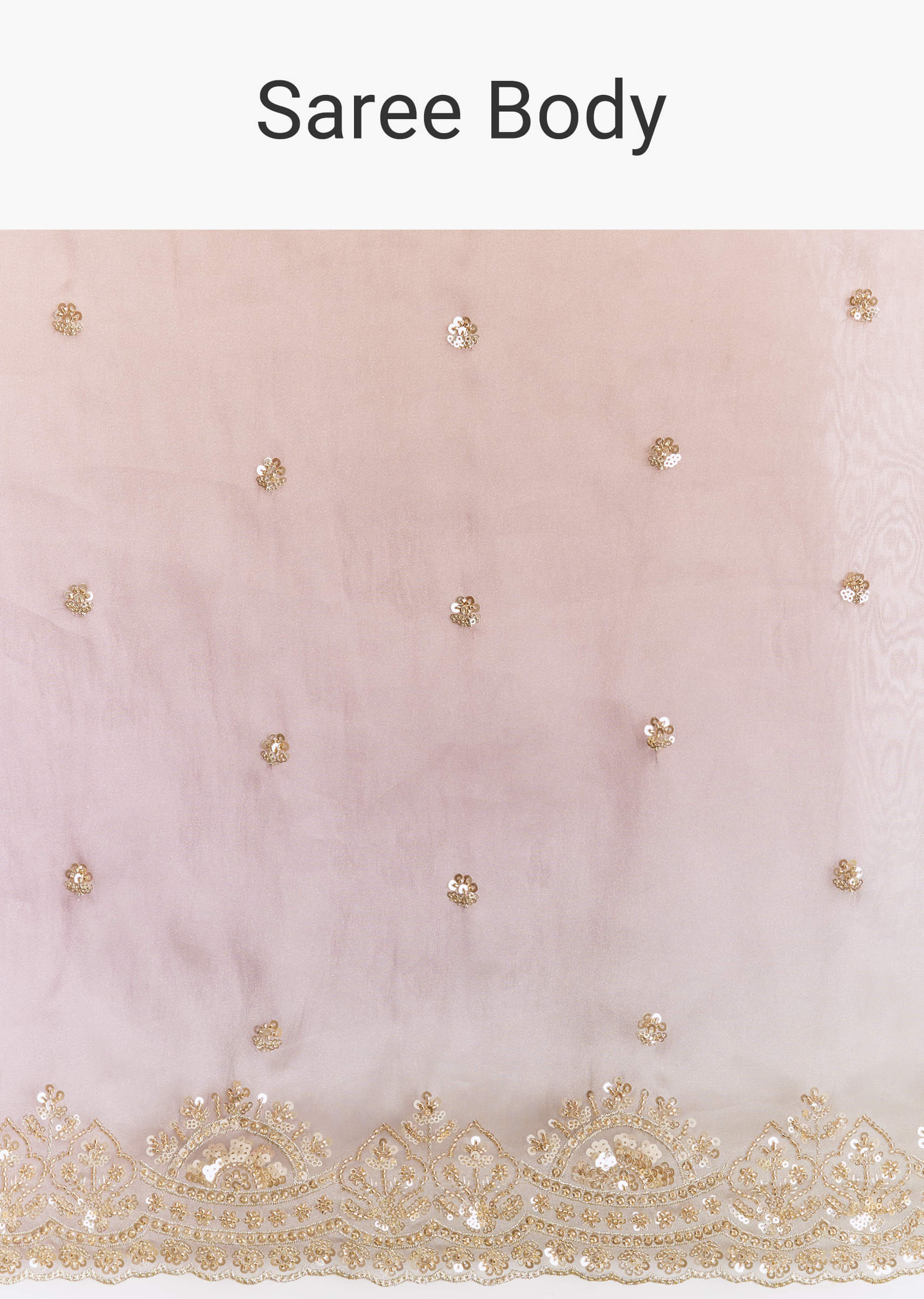 Shades of lavender dusk swirl through this tissue saree. Heavily embroidered scallops and a dreamy blouse catch the light in sequins, beads, and cutdana – like a pastel dream draped... More Product Details