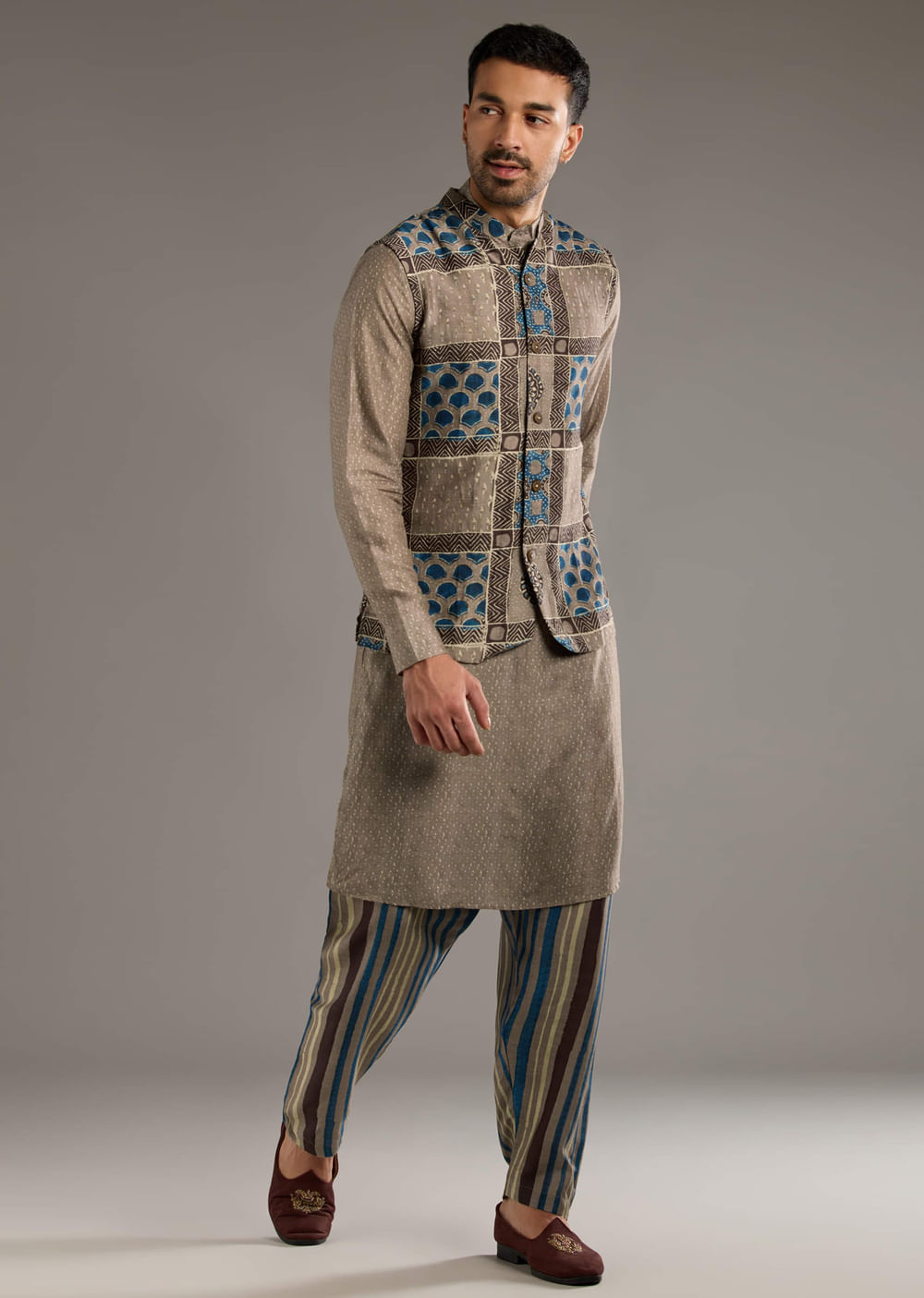 Fit Tips:The jacket sits tidy at the shoulders with a gentle waist, while the men’s kurta beneath falls straight and breathable for easy movement.