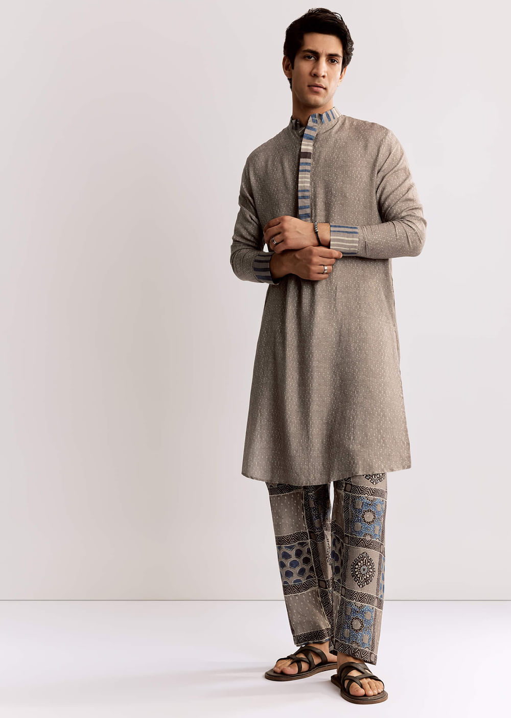 Understated Elegance Meets Ethnic Craft In This Grey Linen Kurta Adorned In Ajrakh Motifs Crafted For Cultural Poise And Comfort.Awarded As The Most Trusted Brand We'Re Delivering Styles You Love Just As Promised.