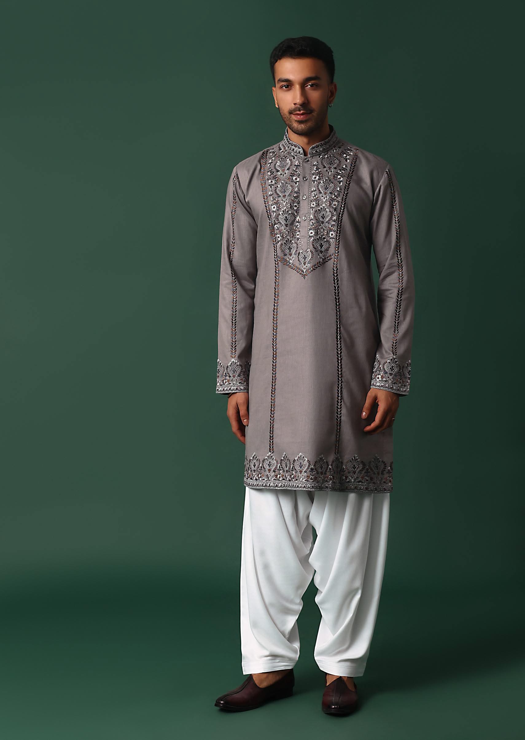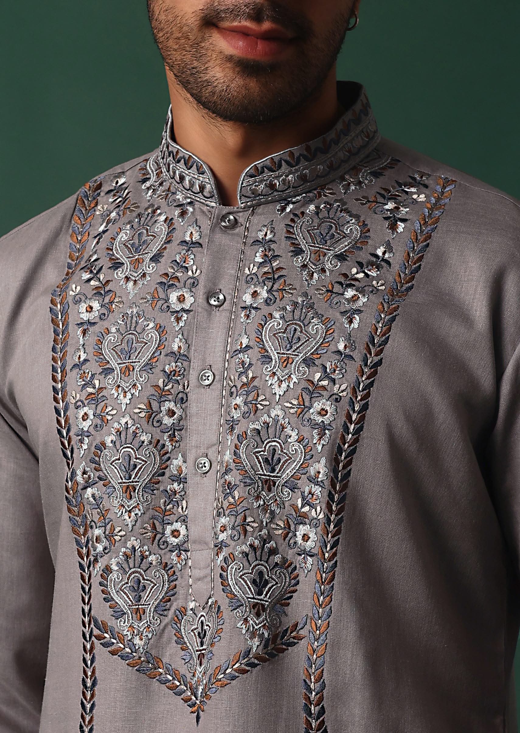 Elevate your festive look with our Grey Linen Kurta Set. It showcases exquisite handwork on the yoke for a touch of artisanal charm. Crafted from premium linen fabric, this ensemble ensures both comfort and style for your celebrations. Complete with a matching bottom, this set offers a cohesive and refined look. Awarded as the Most Trusted Brand, we're delivering styles you love, just as promised.