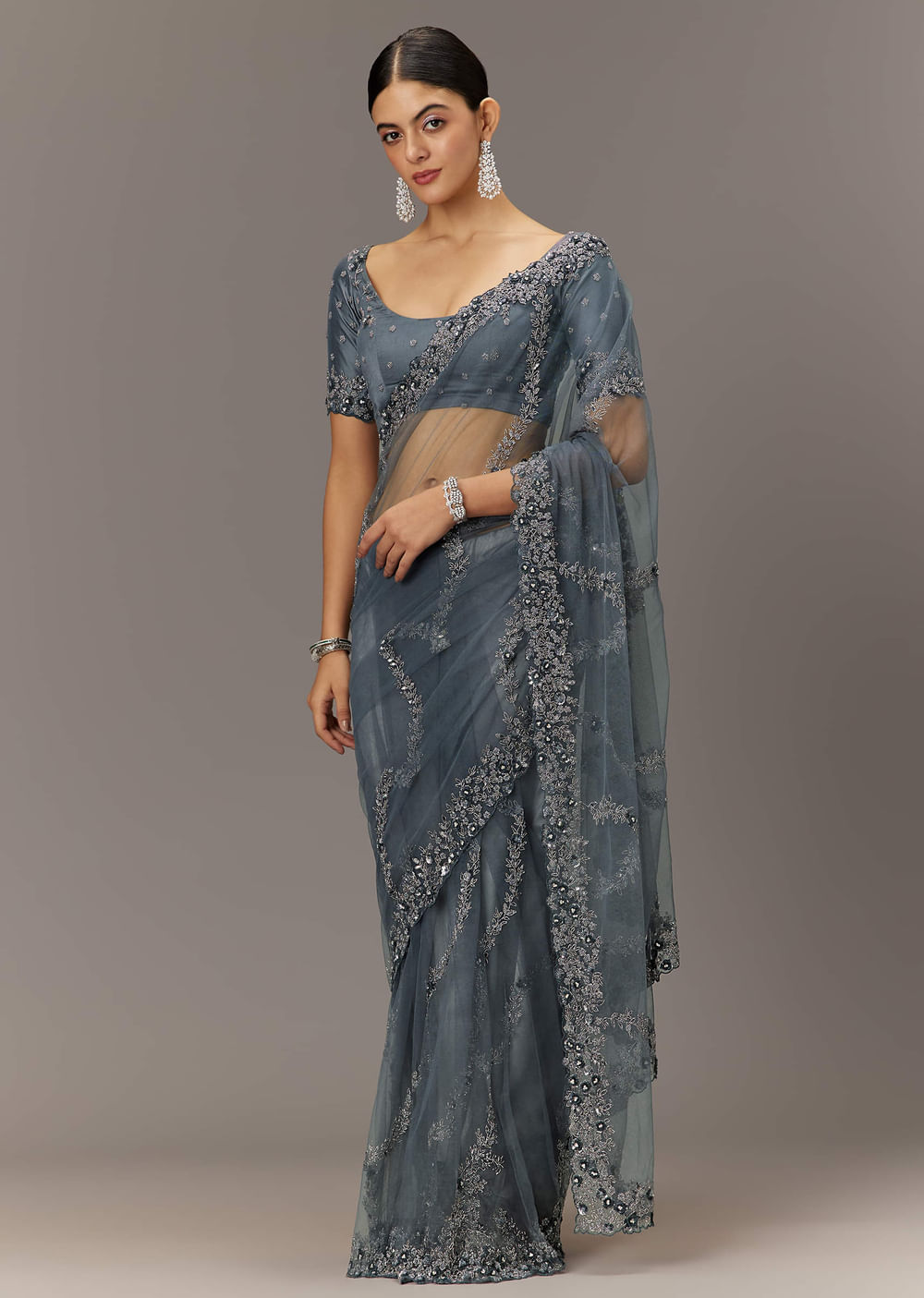 Grey Net Saree With All Over Heavy Embroidery And Net Blouse