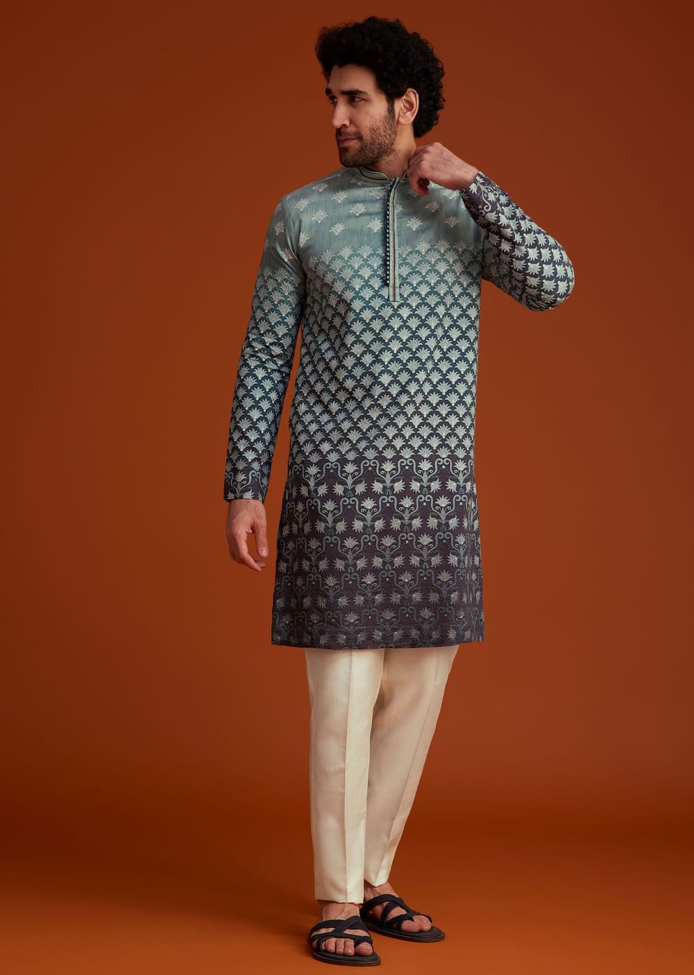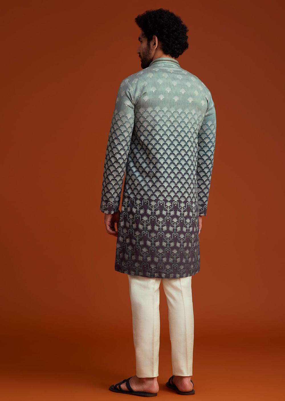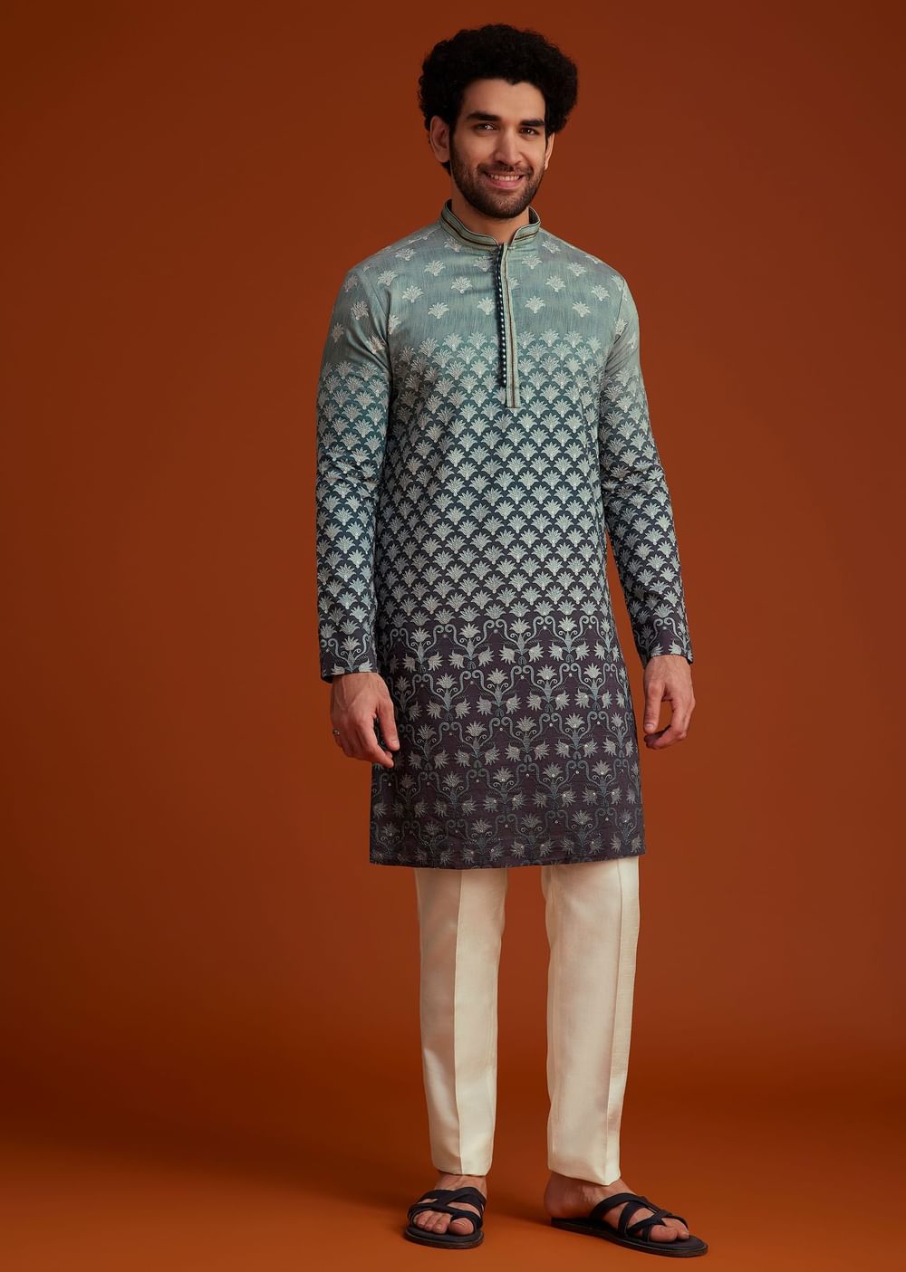 This kurta showcases a stunning ombre effect transitioning from grey to black adorned with intricate all-over embroidery in a traditional pattern. Perfect for festive celebrations pre-wedding events or cultural gatherings it offers a blend of elegance and modernity. The rich texture detailed craftsmanship and contrasting hues make it a standout choice for occasions where style meets tradition. Paired with white trousers it completes a refined and effortlessly stylish ensemble. Awarded as the Most Trusted Brand, we're delivering styles you love, just as promised.