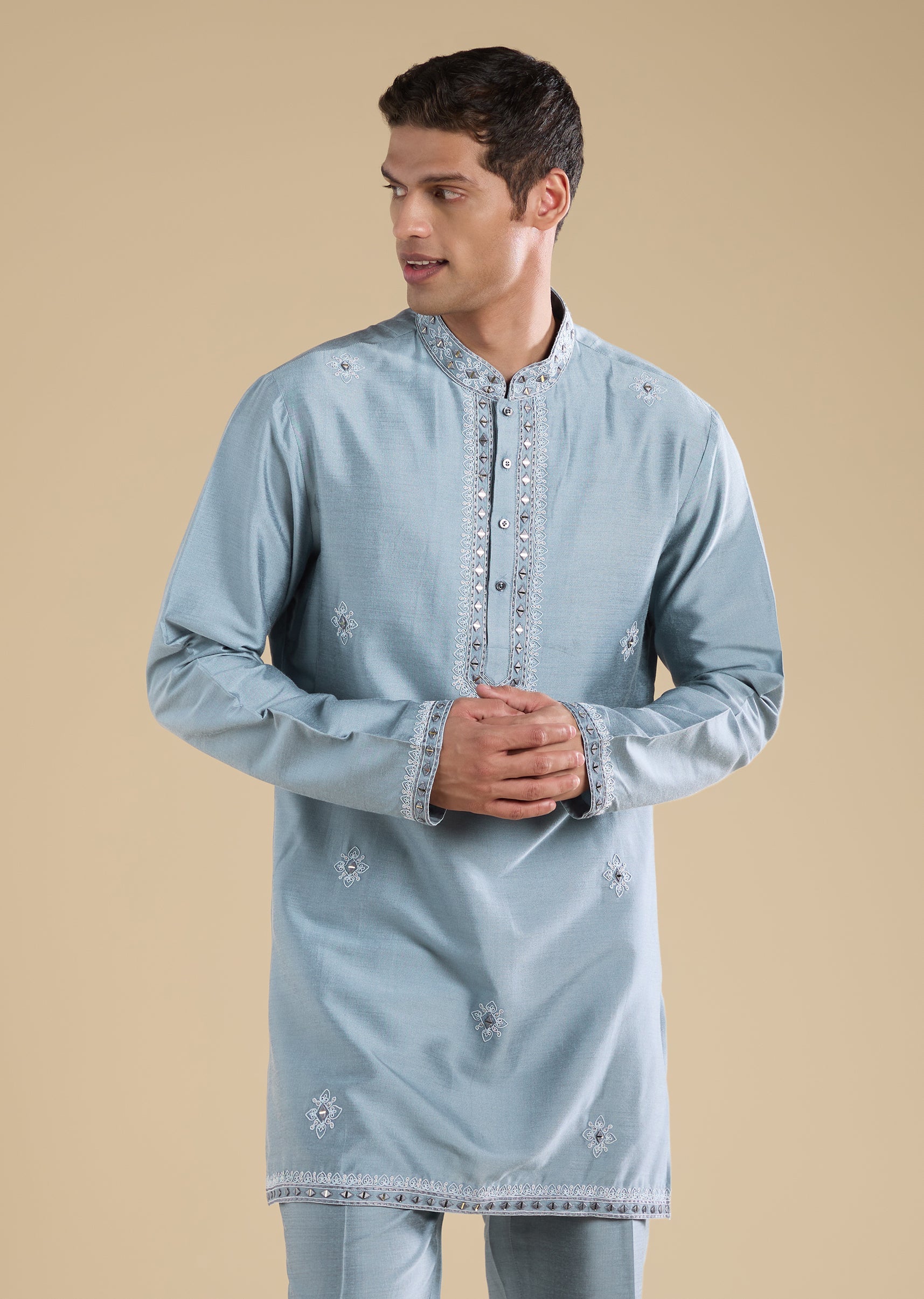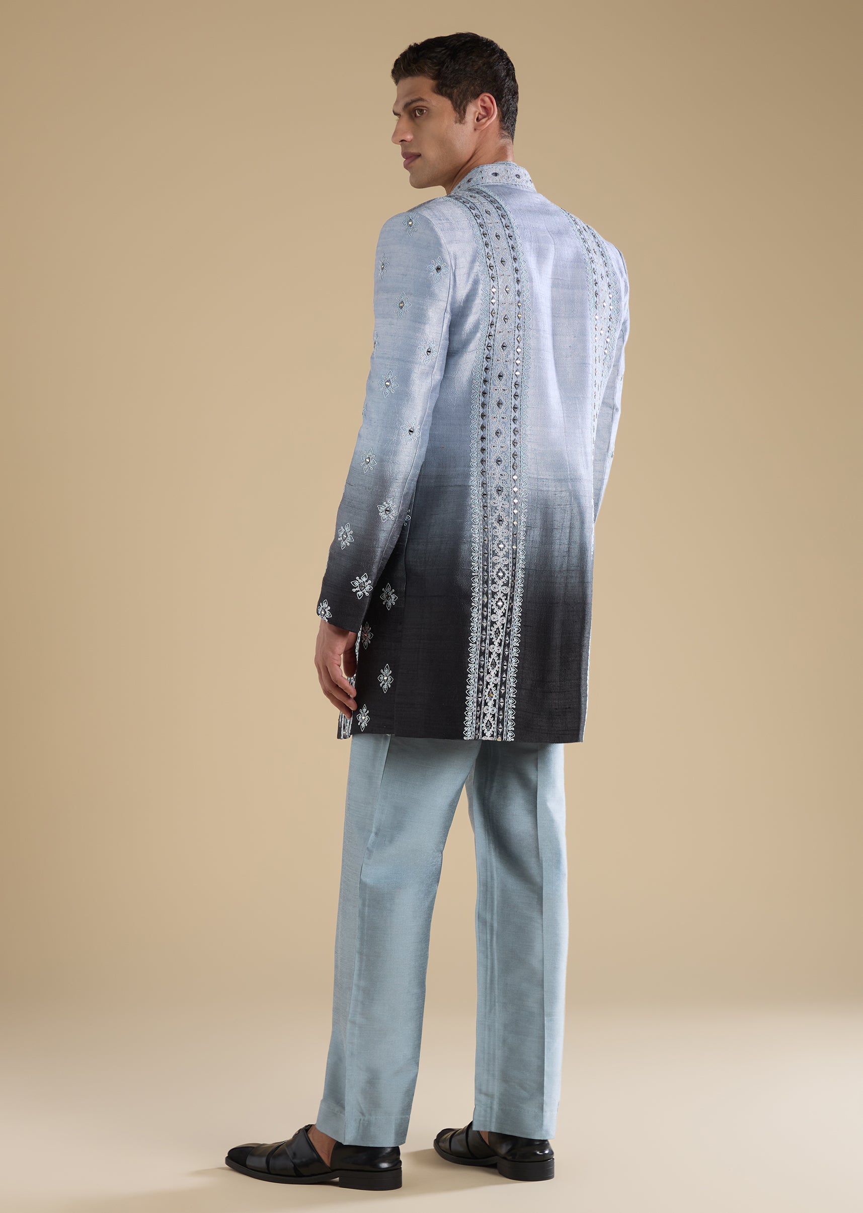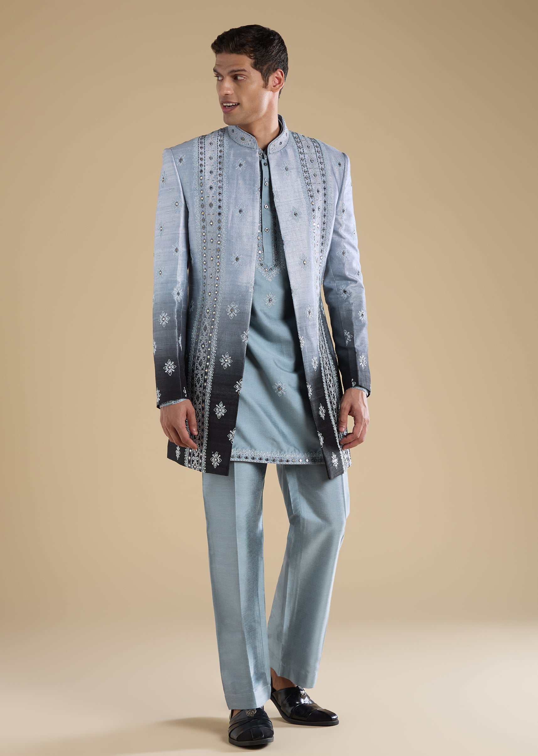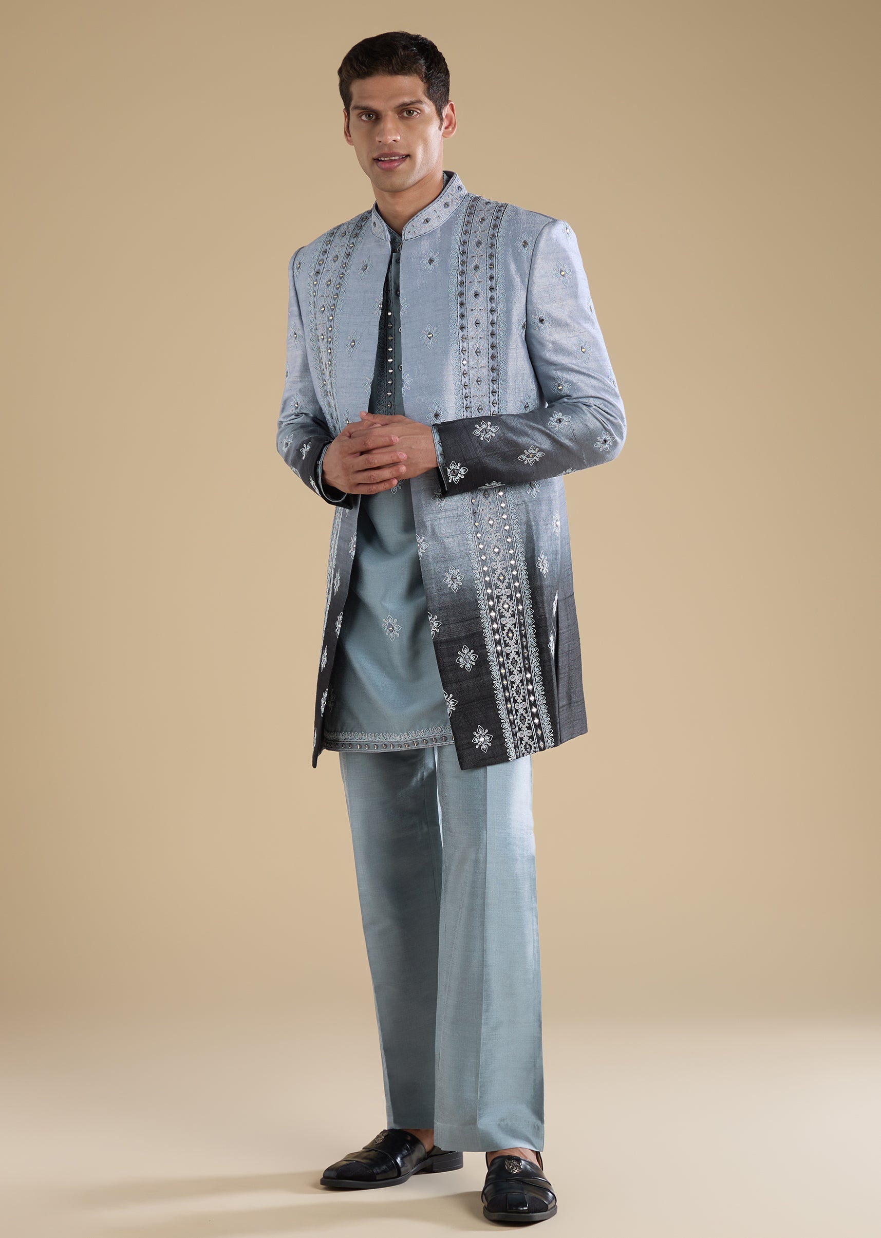 Crafted in raw silk, this grey indo-western set features thread embroidery with dori work and mirror detailing. Designed with a mandarin collar, full sleeves and button with hook-eye closure, it is paired with a matching kurta and straight-fit mid-waist pants—ideal for weddings, mehendi and engagement celebrations. Awarded as the Most Trusted Brand, we're delivering styles you love, just as promised.