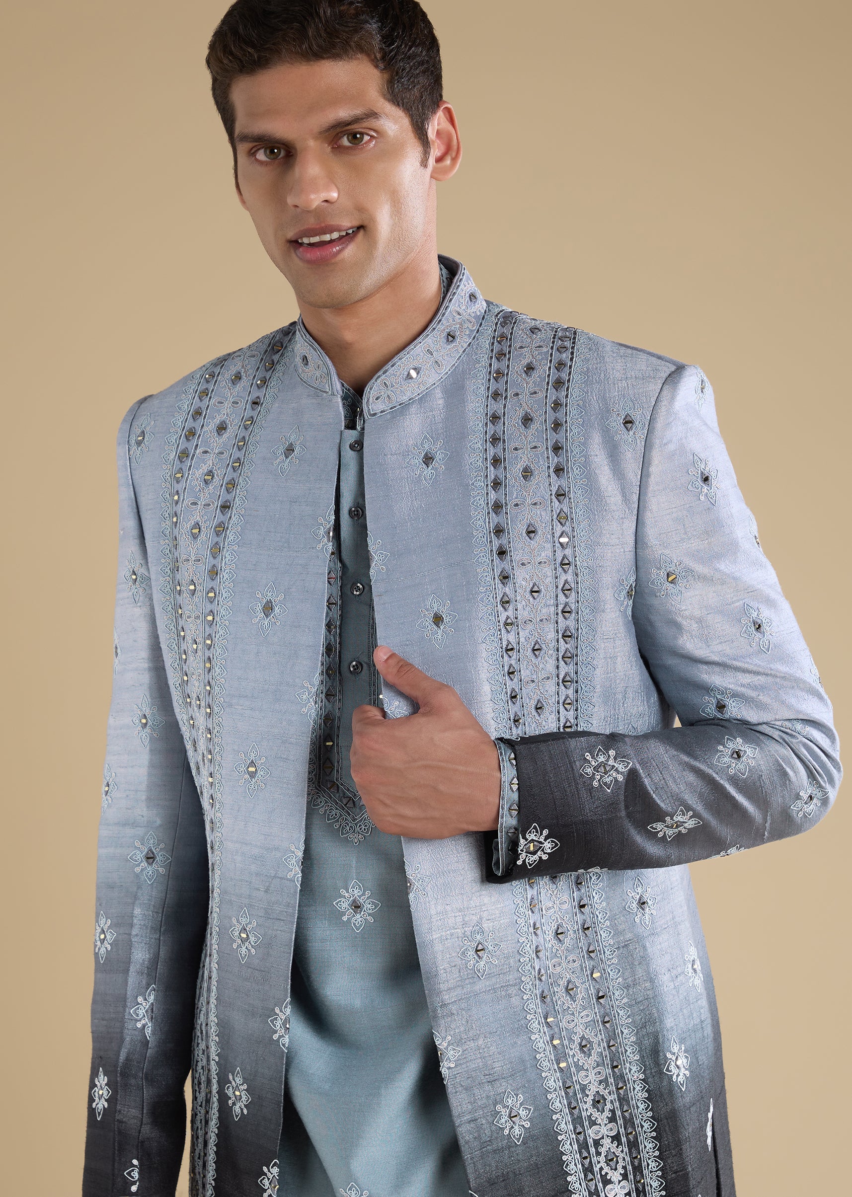 Crafted in raw silk, this grey indo-western set features thread embroidery with dori work and mirror detailing. Designed with a mandarin collar, full sleeves and button with hook-eye closure, it... More Product Details