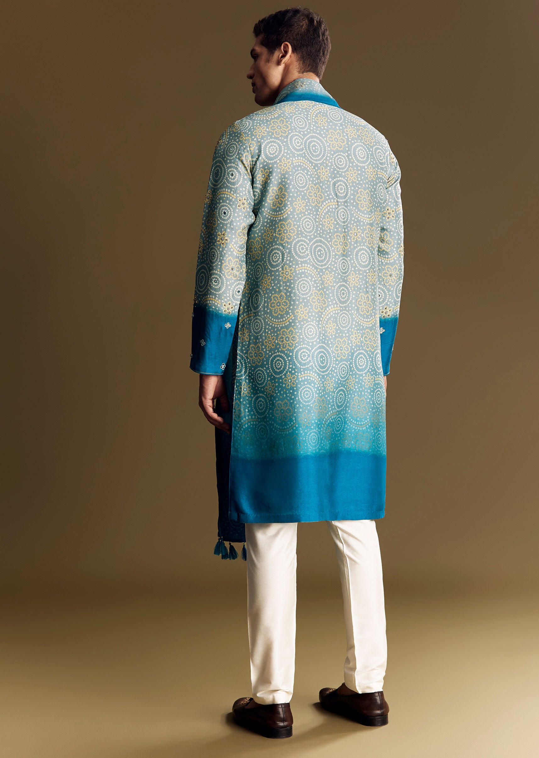 Blending tradition with trend, this ombré silk kurta set features subtle mirror accents and a rich tonal fade. Designed for festive mehendi and wedding events, it offers both contemporary style... More Product Details