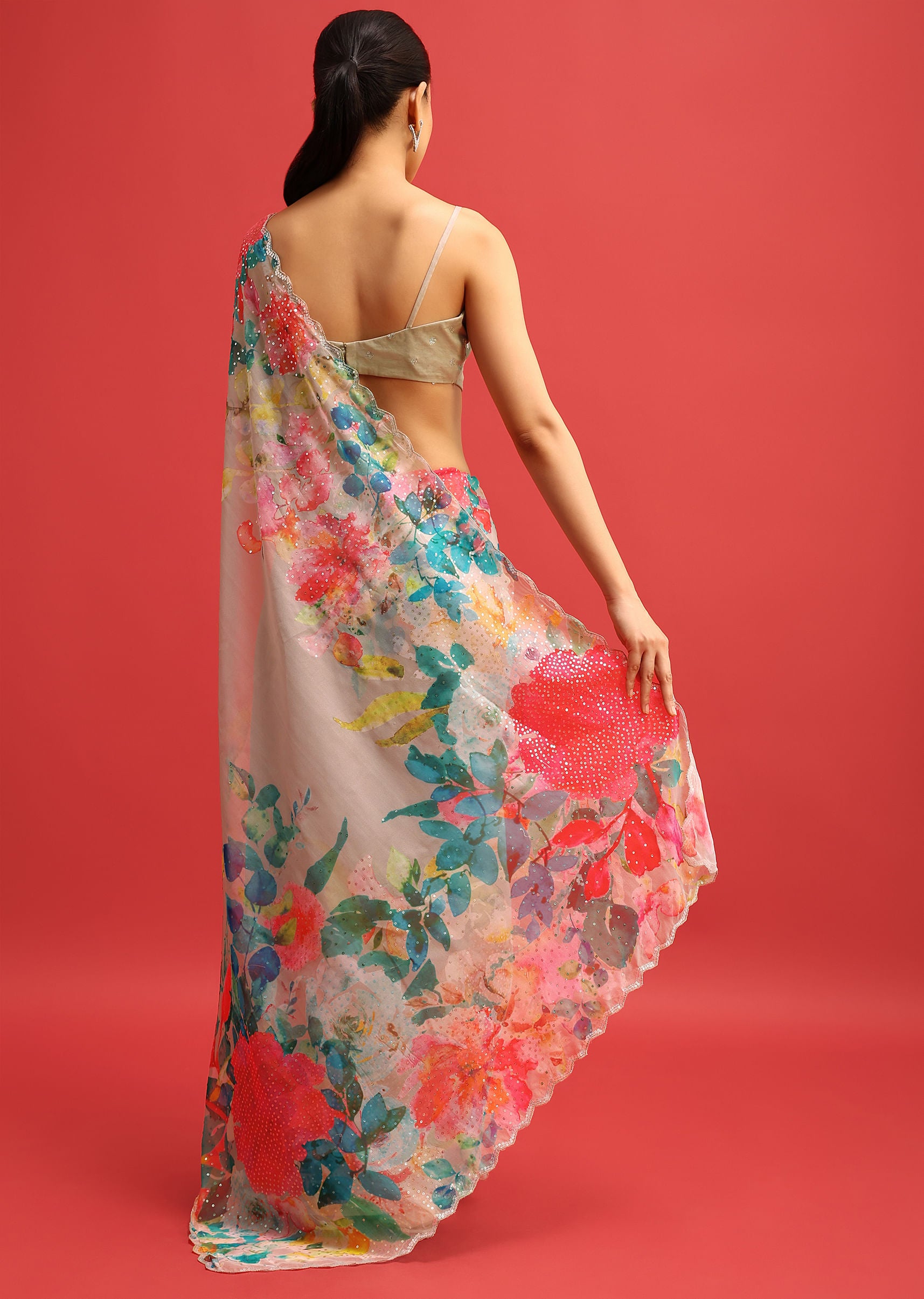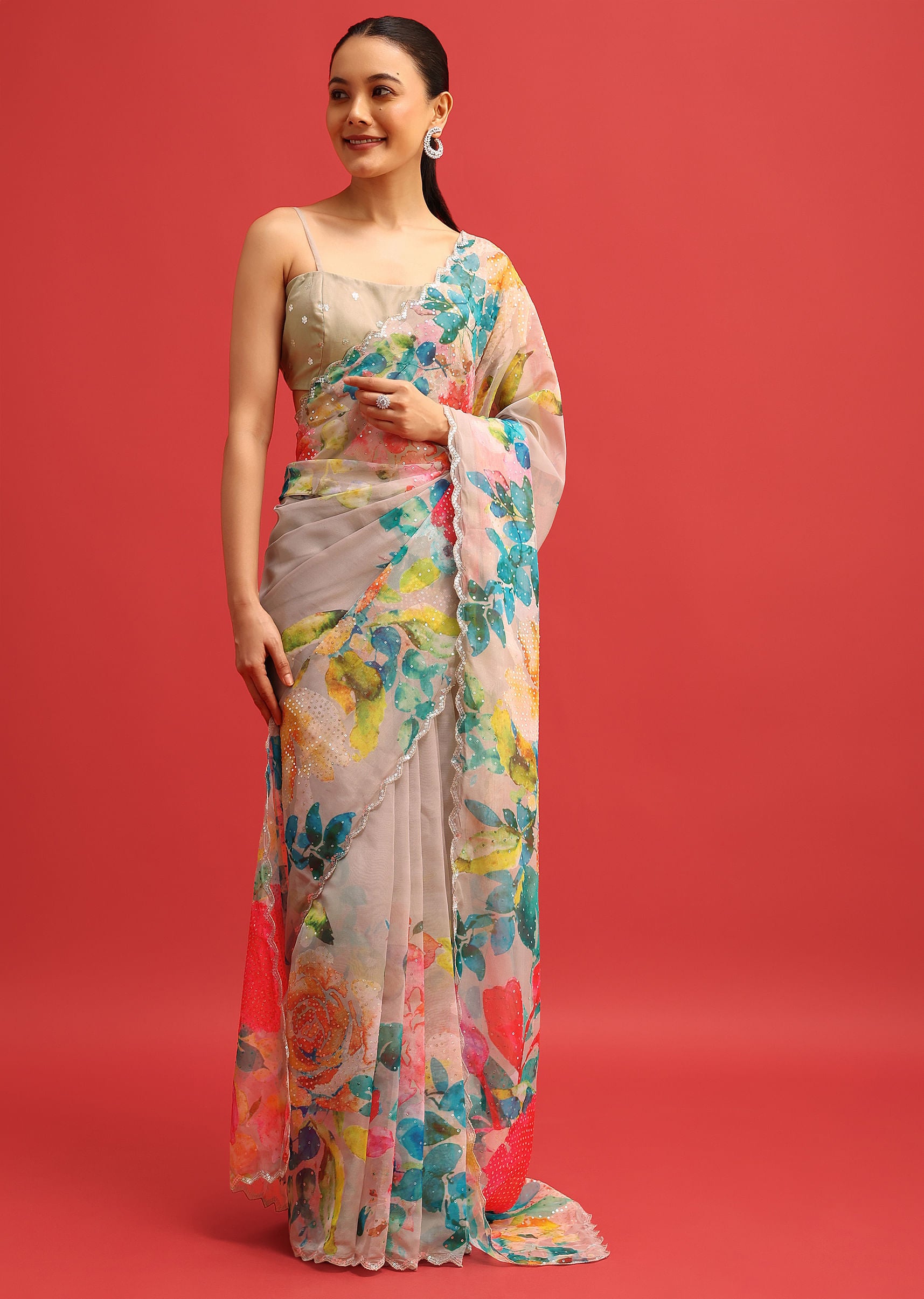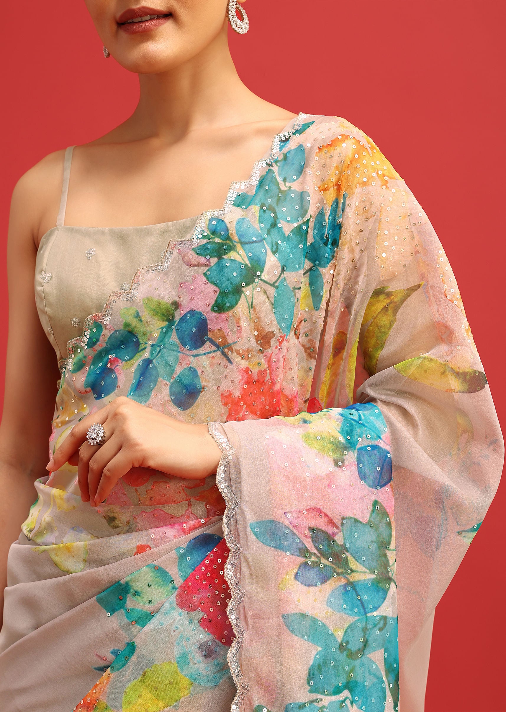 Grey Organza Floral Printed Saree In Sequin With Unstitched Blouse