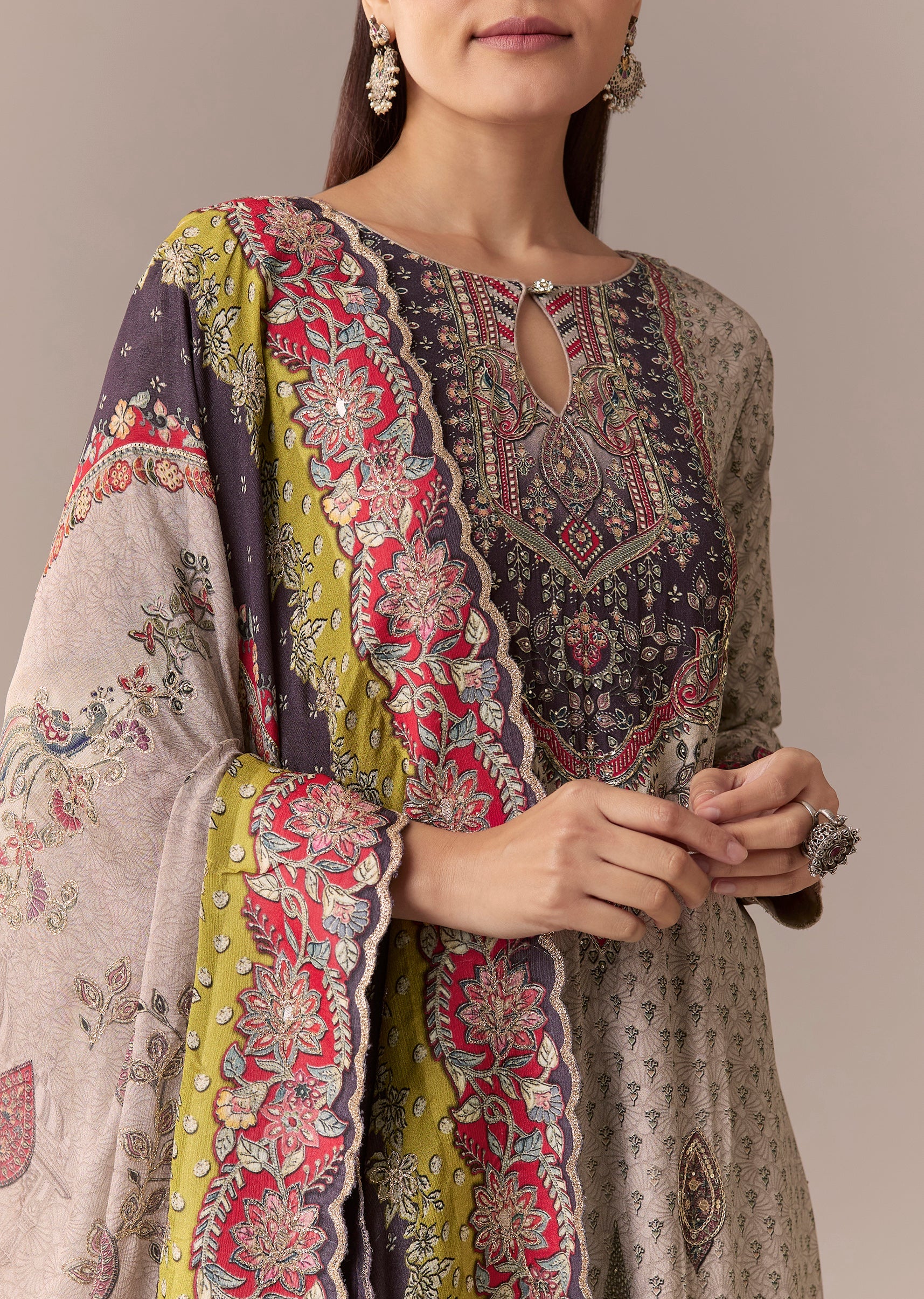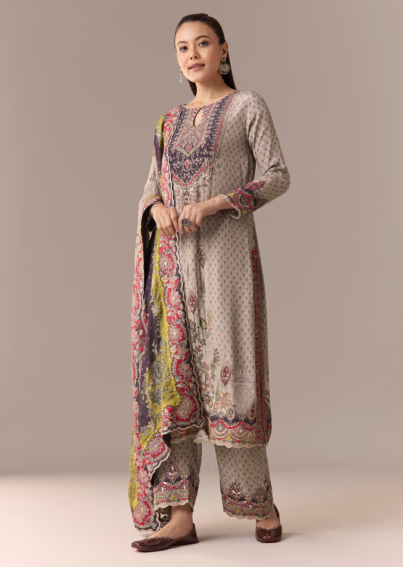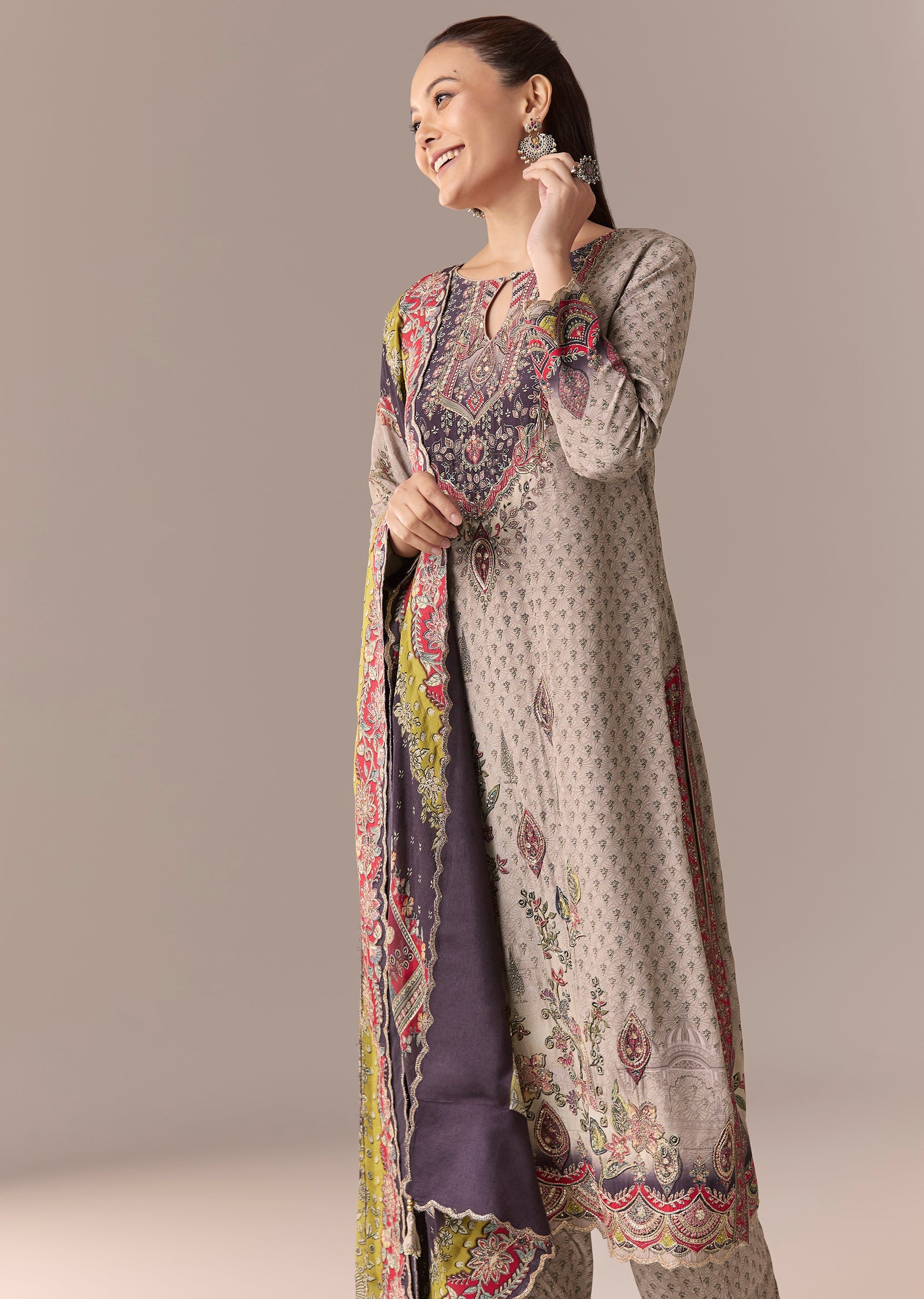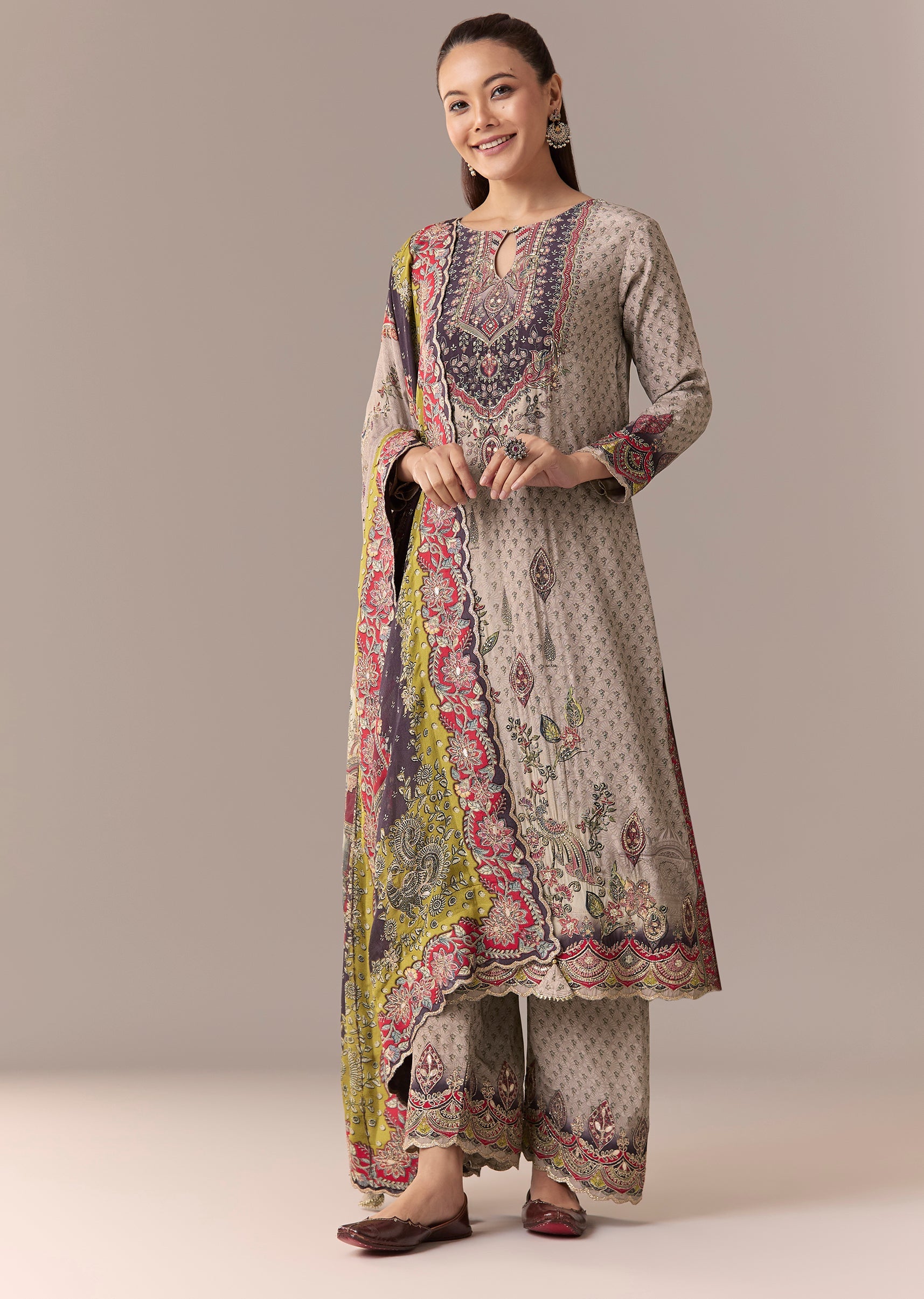 Grey Printed Kurta Set With Pant And Dupatta