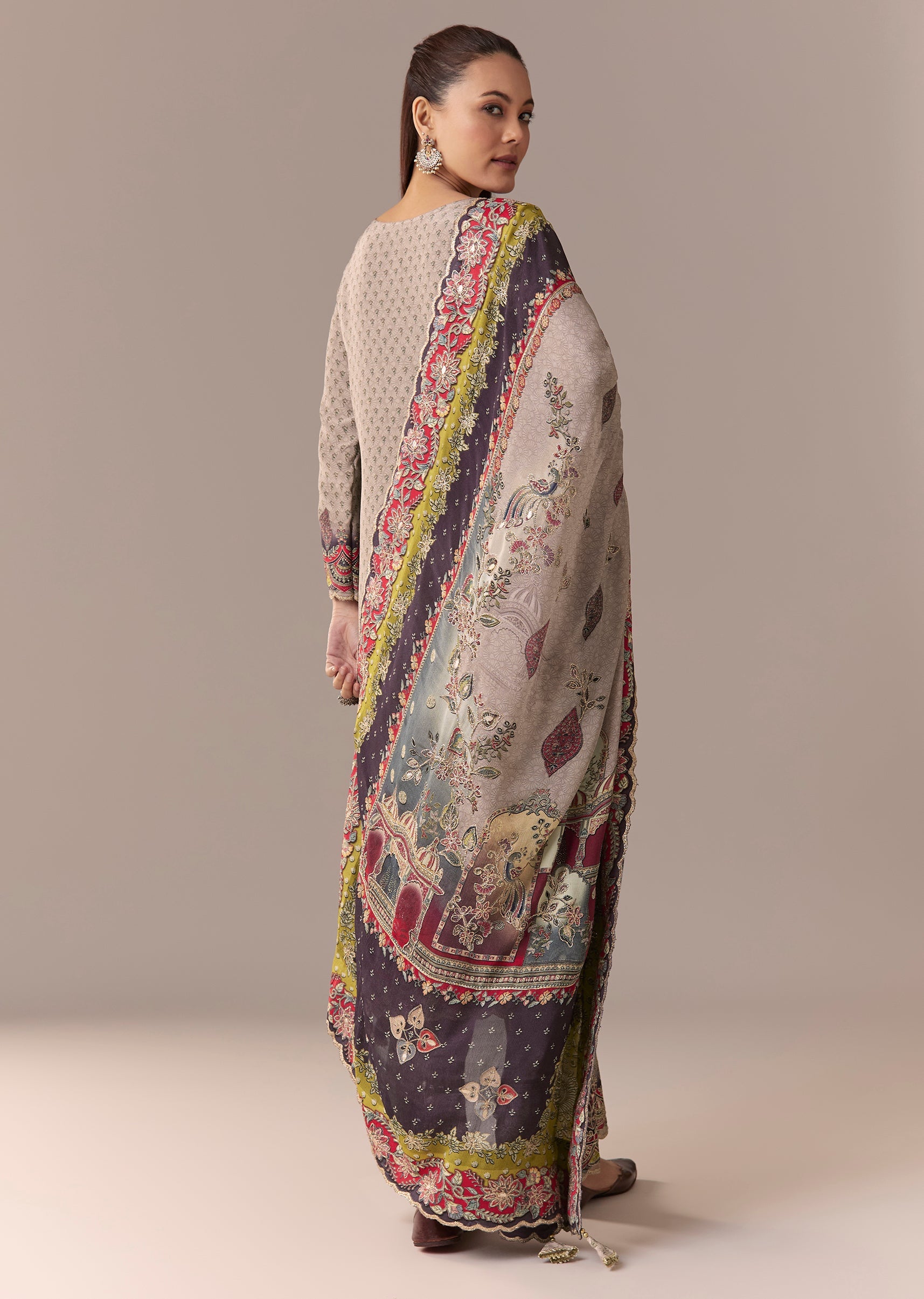 Pair with silver jhumkas and neutral heels for an elegant festive look.