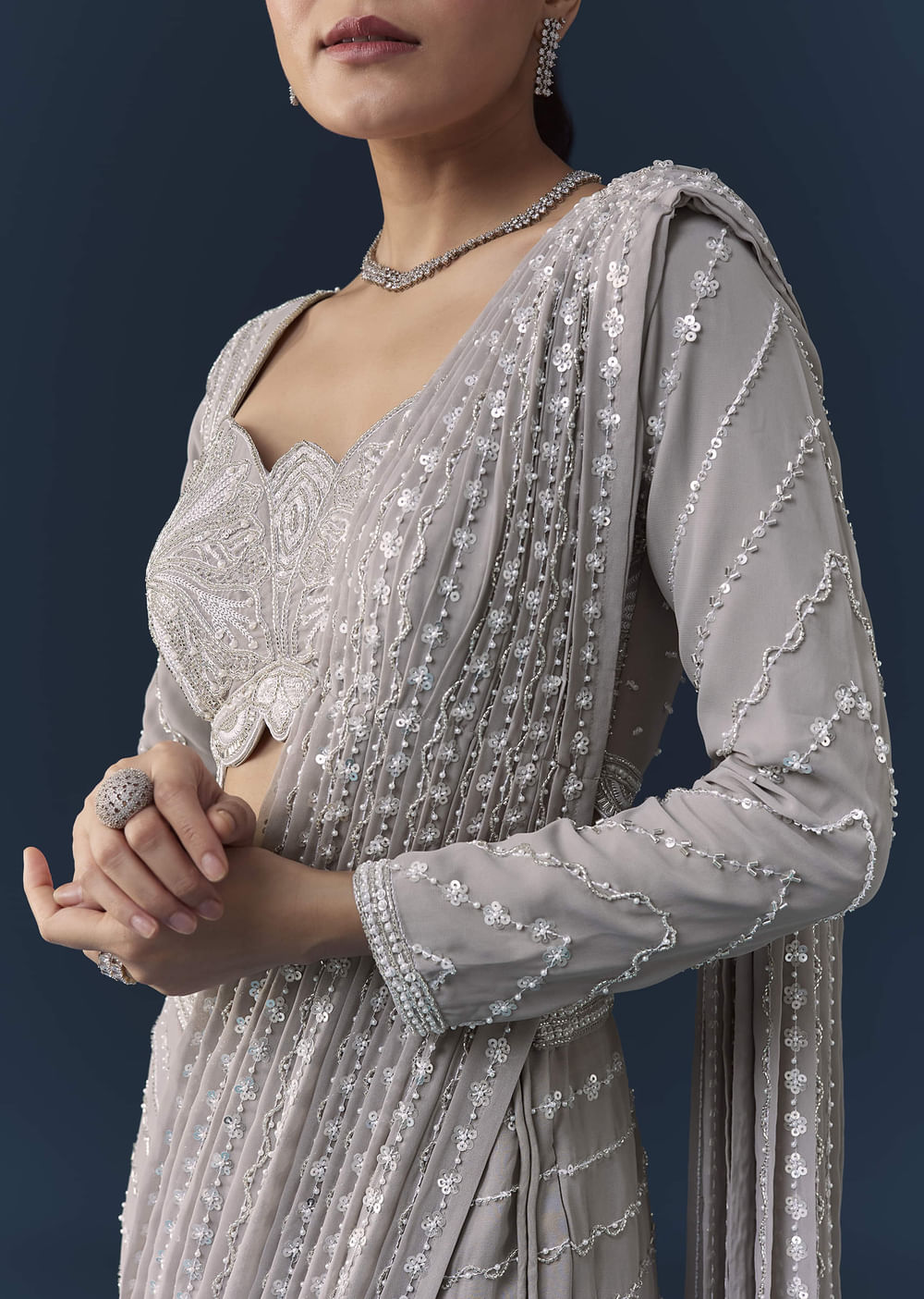 Grey Ready Pre Pleated Saree with Resham Blouse