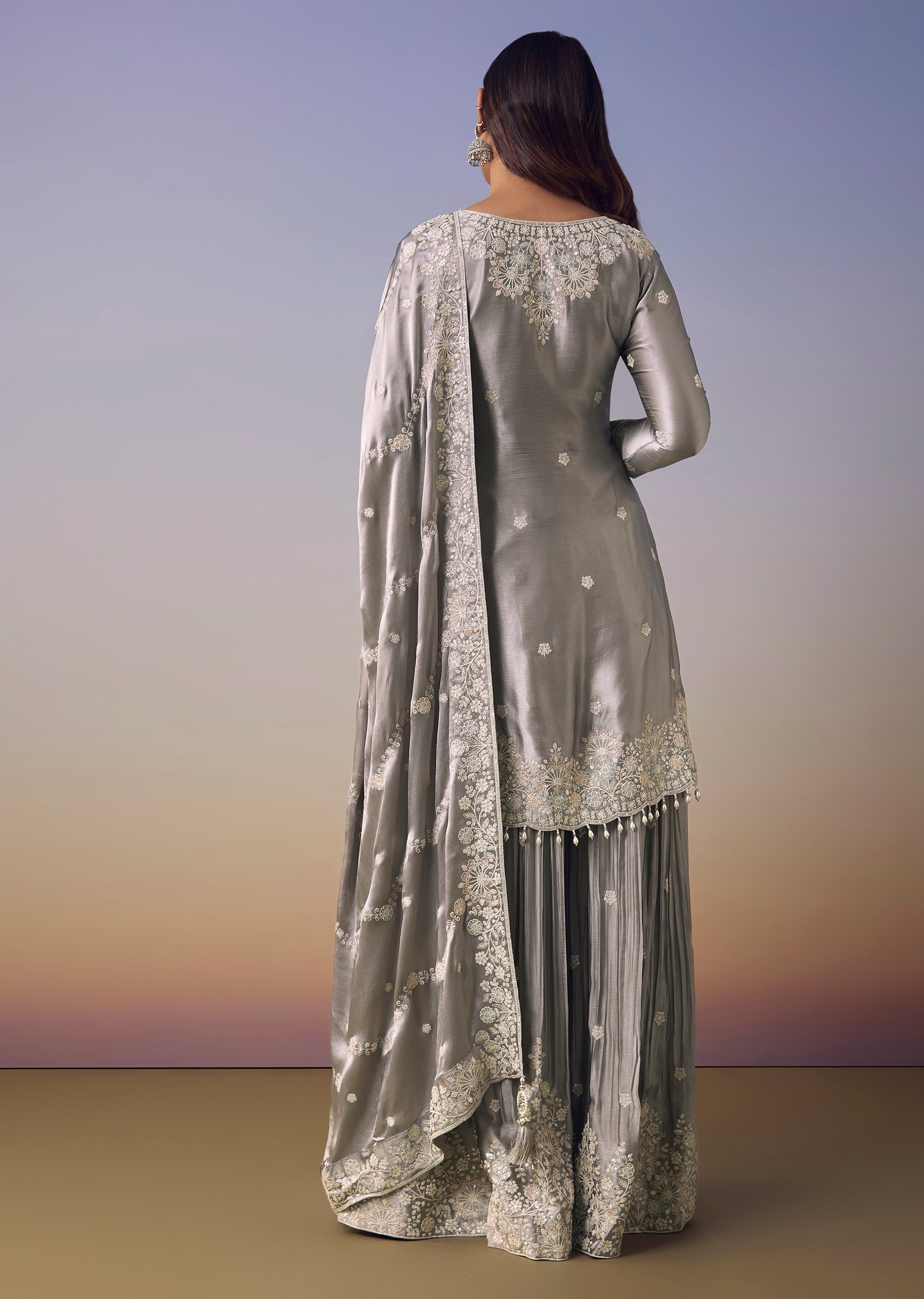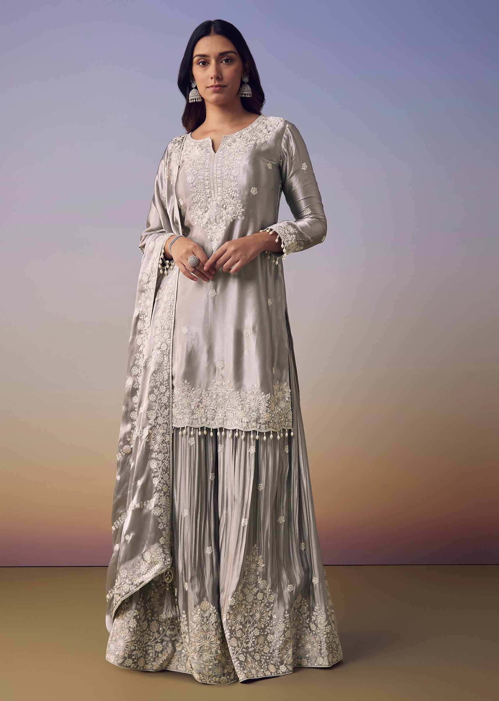 Step into understated elegance with this grey satin kurta set featuring refined thread embroidery and moti detailing that add a subtle festive sheen. The notched neckline and three fourth sleeves... More Product Details