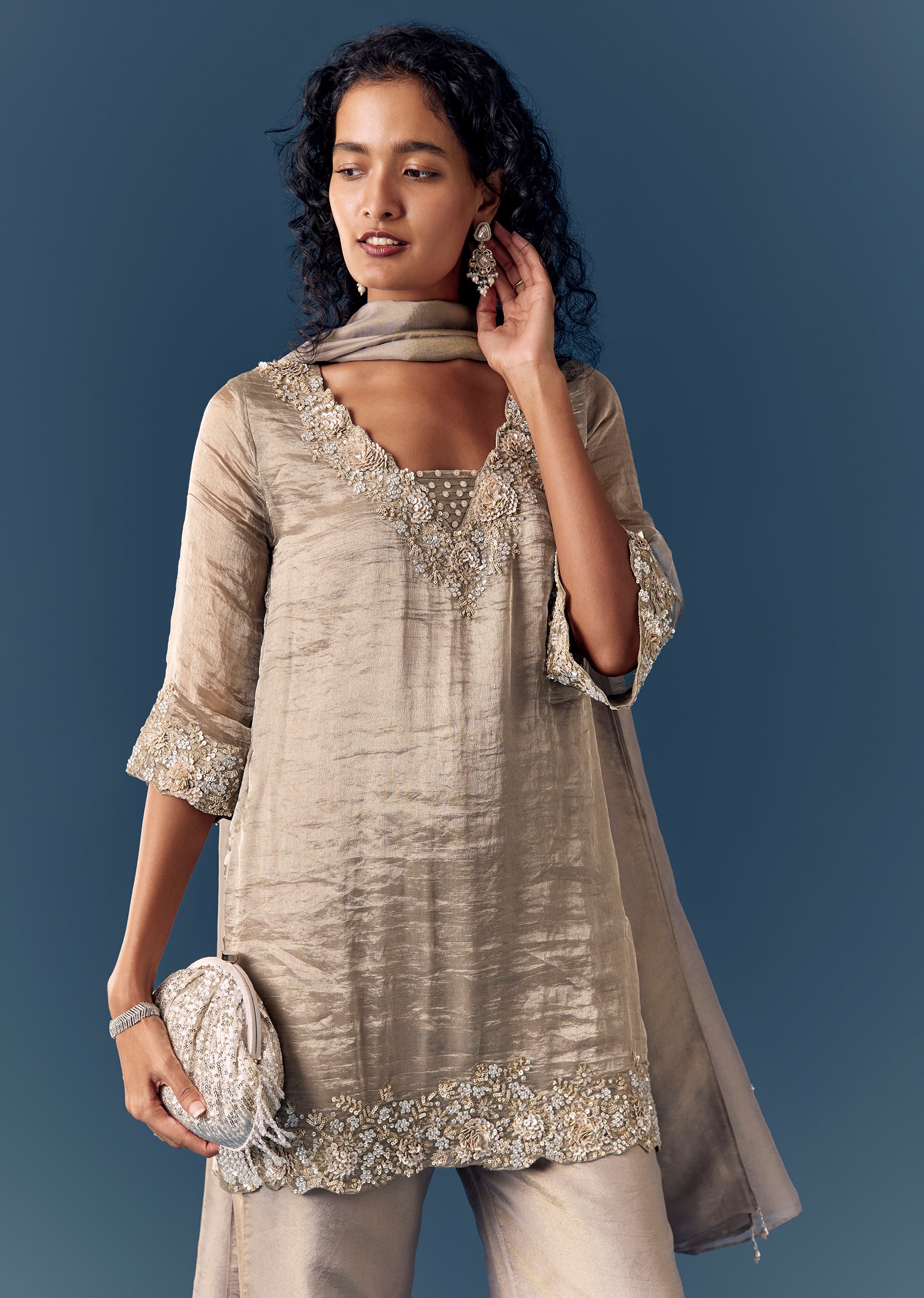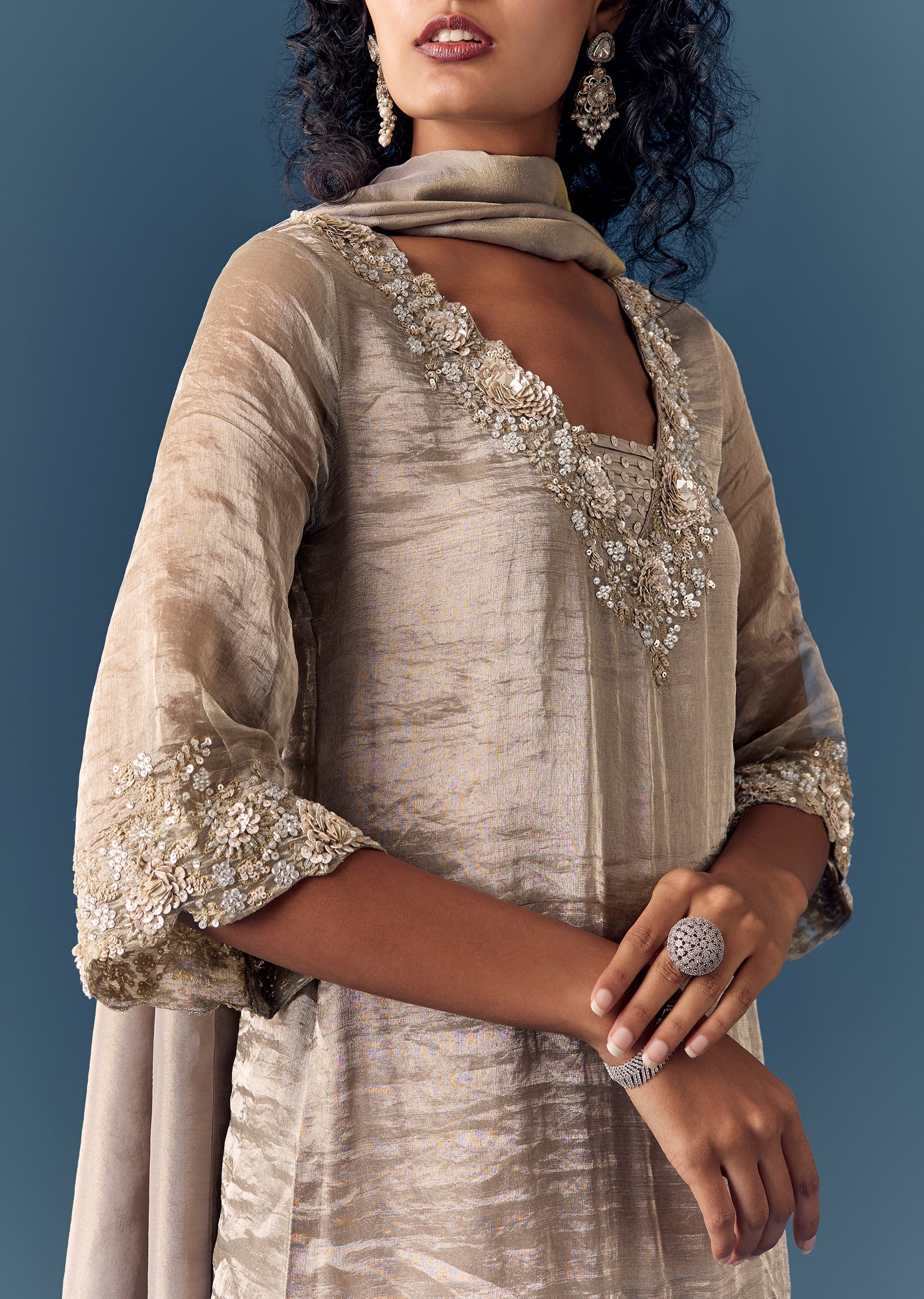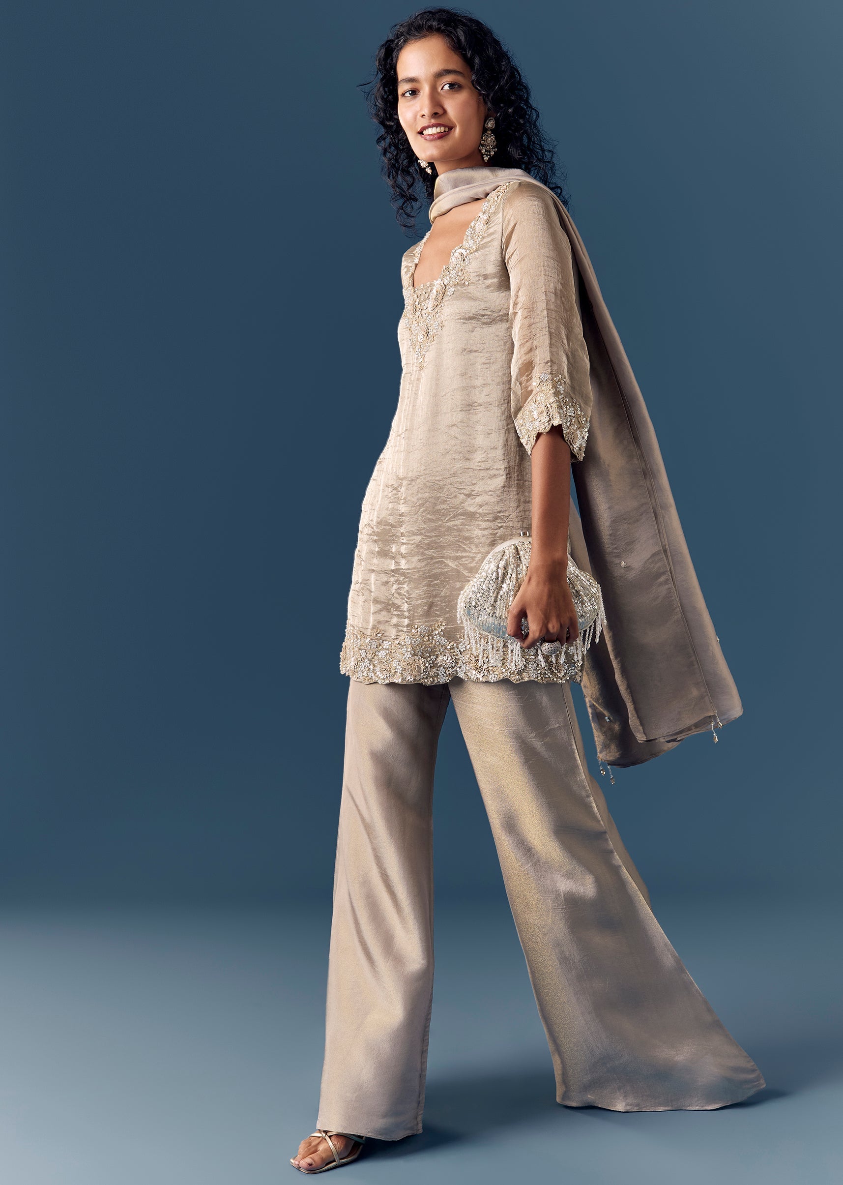 A chic pastel-grey palazzo set with a tissue kurta embellished in sequin work. V-neckline with flared sleeves, side slits and side zip. Comes with palazzos and dupatta—ideal for evening wedding... More Product Details