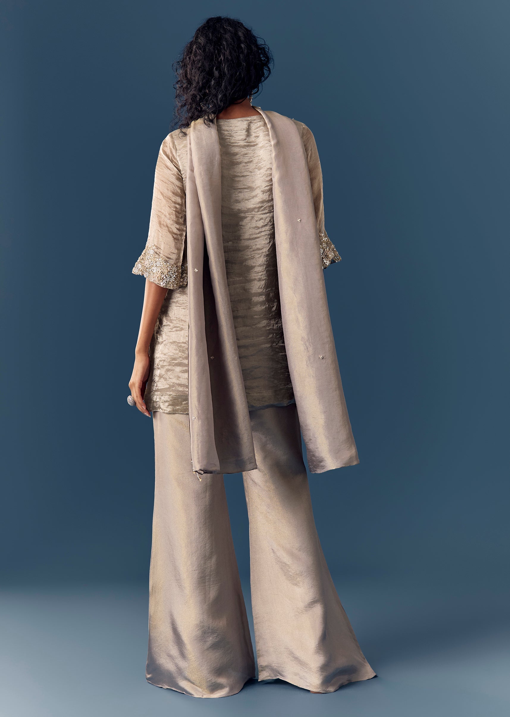 Grey Sequinned Tissue Kurta Palazzo Set With Dupatta