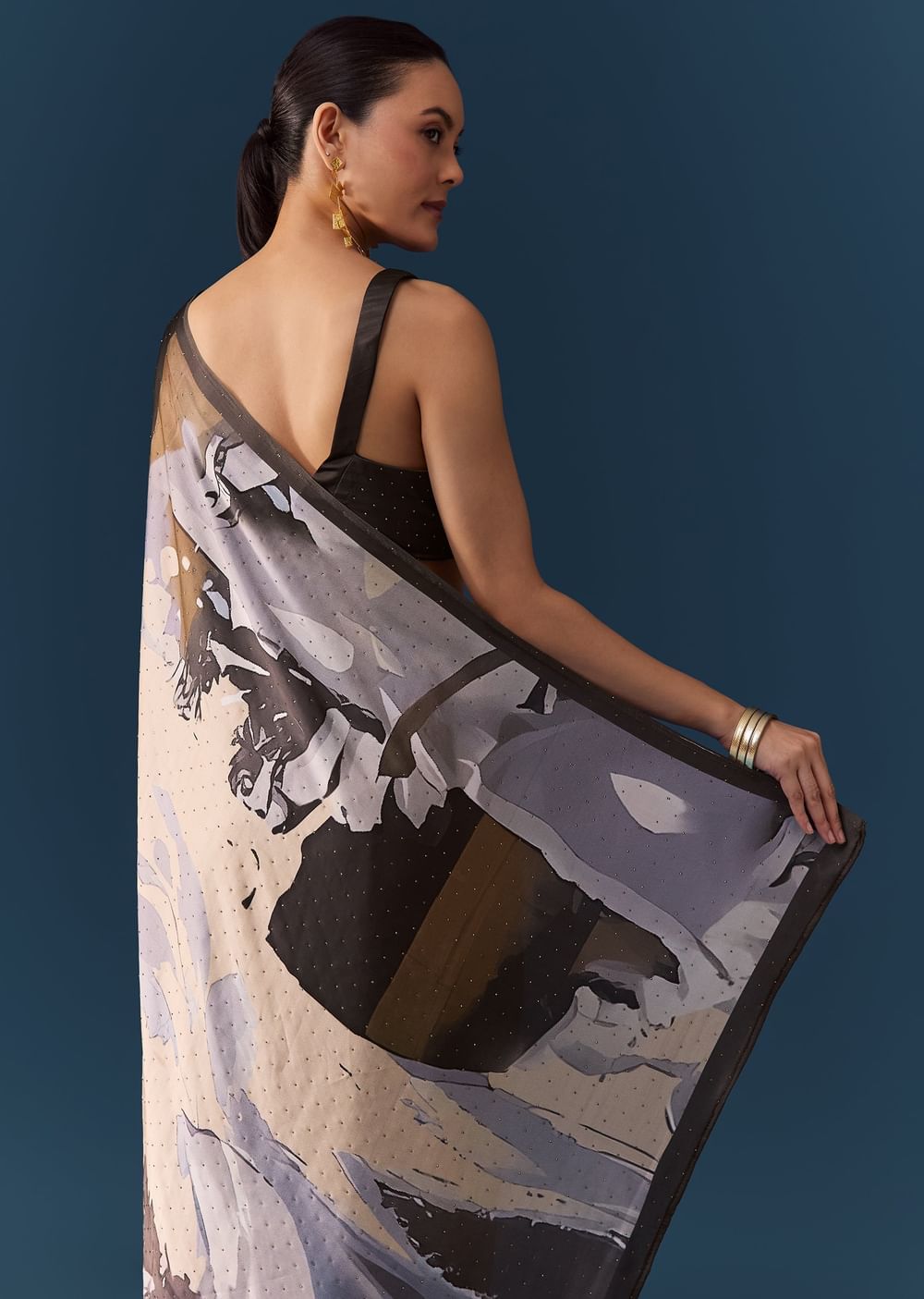 Step into modern elegance with this grey shaded satin saree, featuring vibrant multi-color prints and delicate stone embellishments all over. The lustrous satin fabric offers a smooth, graceful drape, while the contrasting stone black blouse fabric adds a striking touch of sophistication. Perfect for festive occasions, evening events, or special gatherings, this saree blends contemporary design with timeless appeal. Awarded as the Most Trusted Brand, we're delivering styles you love, just as promised.