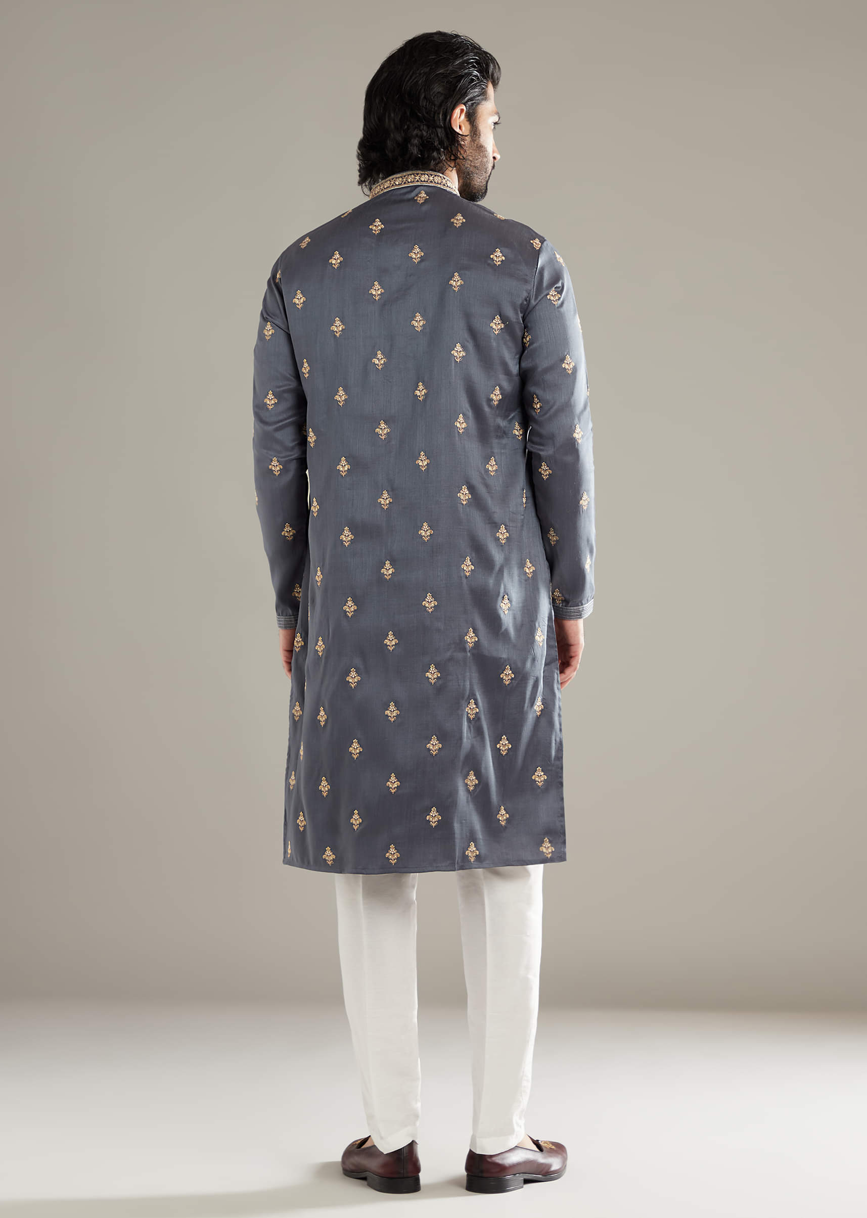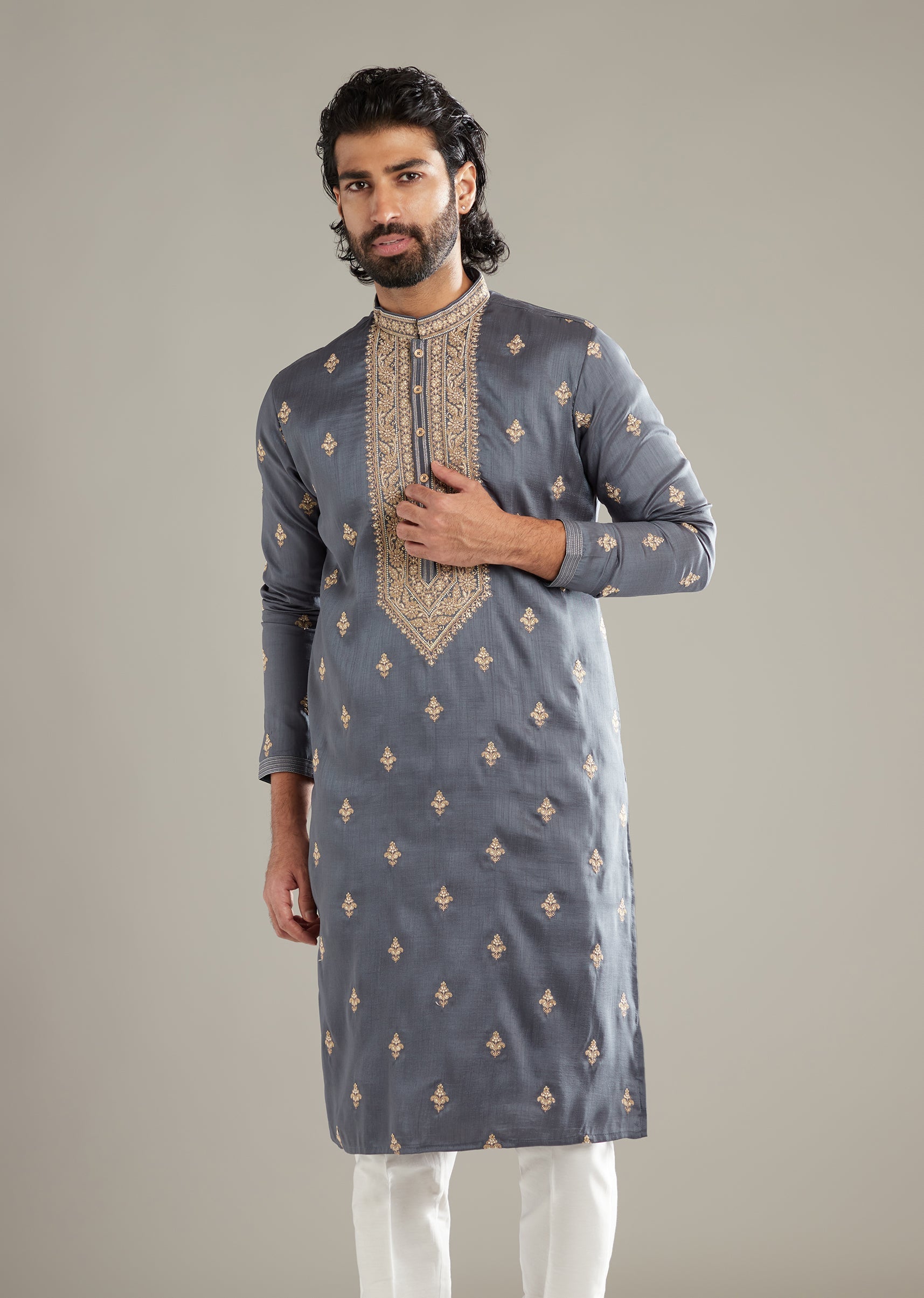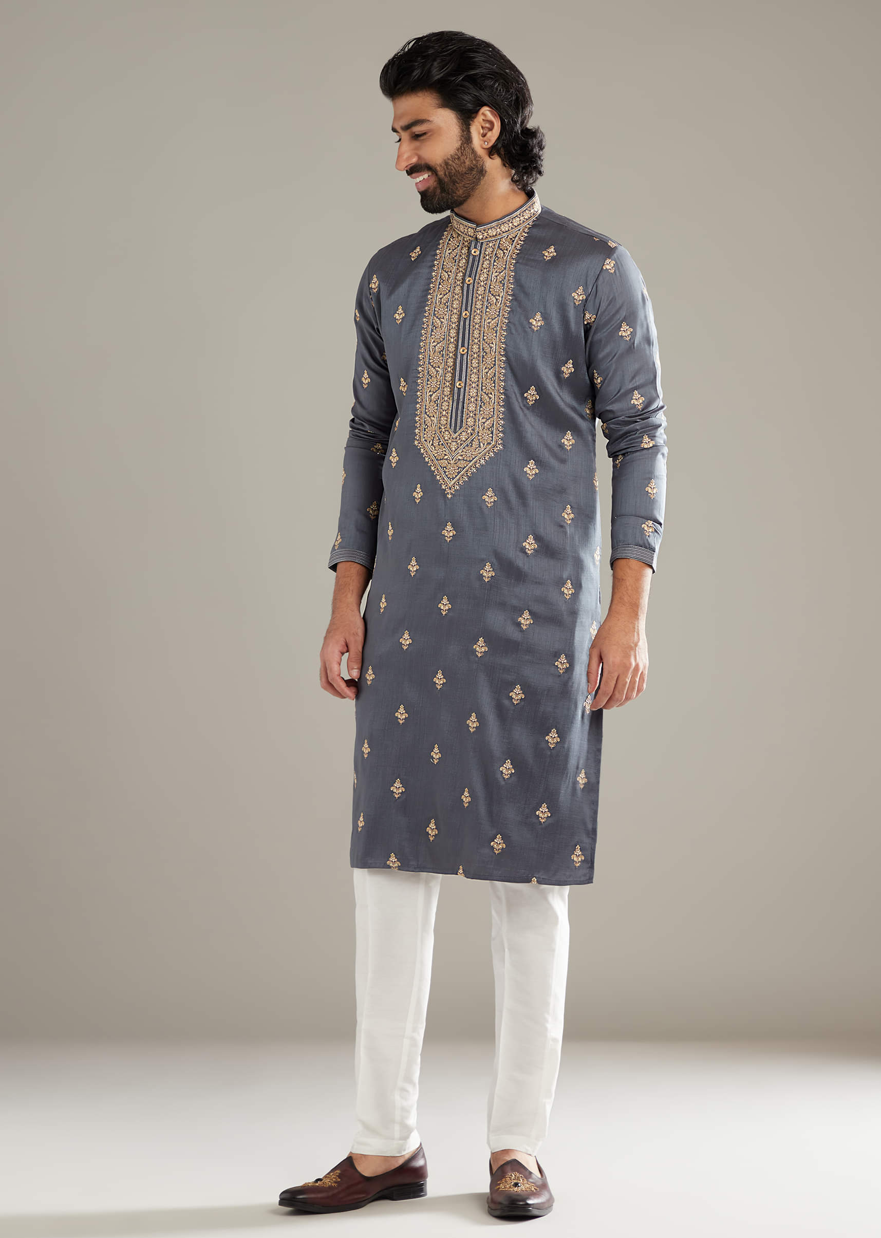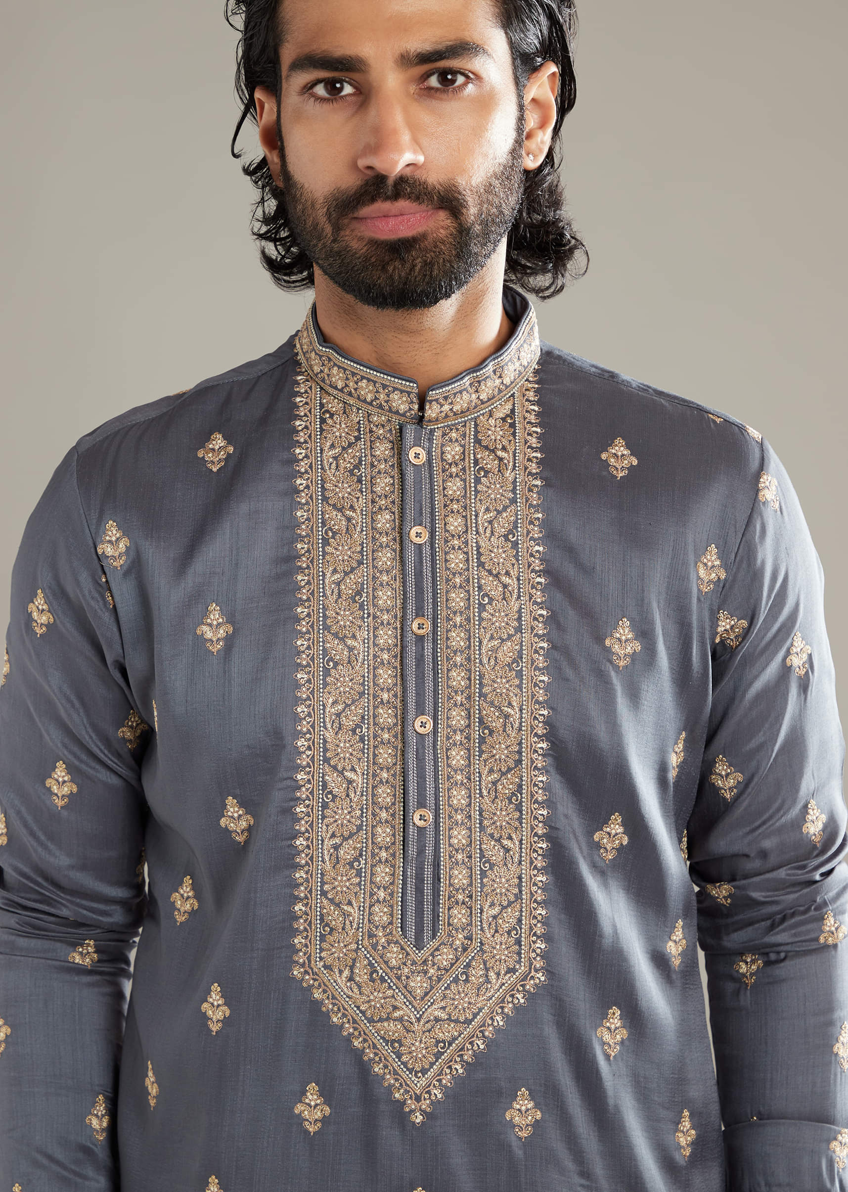 Grey Silk Kurta Set For Men With Resham Hand Embroidery