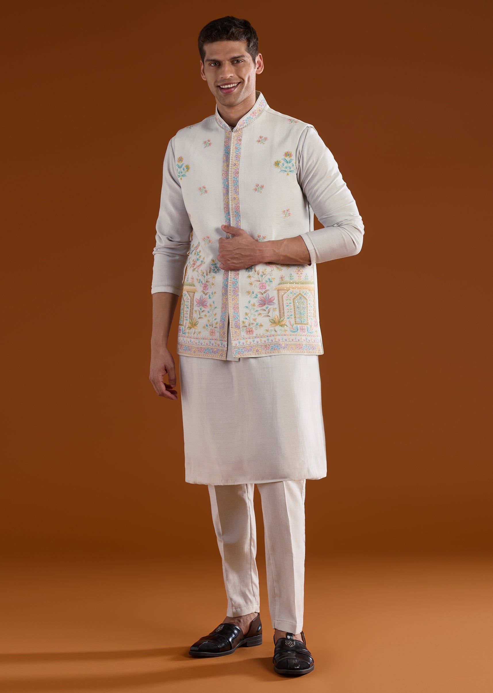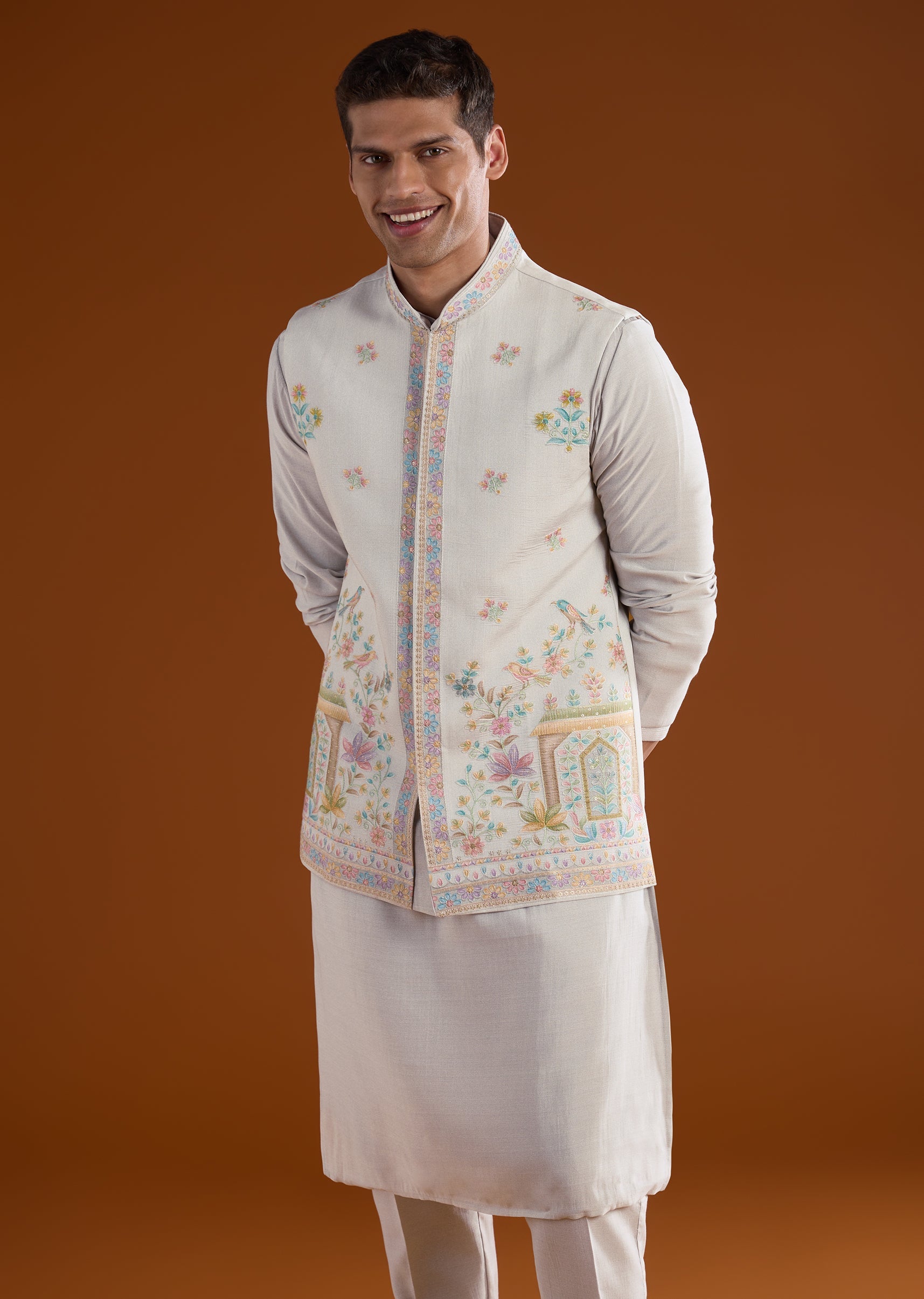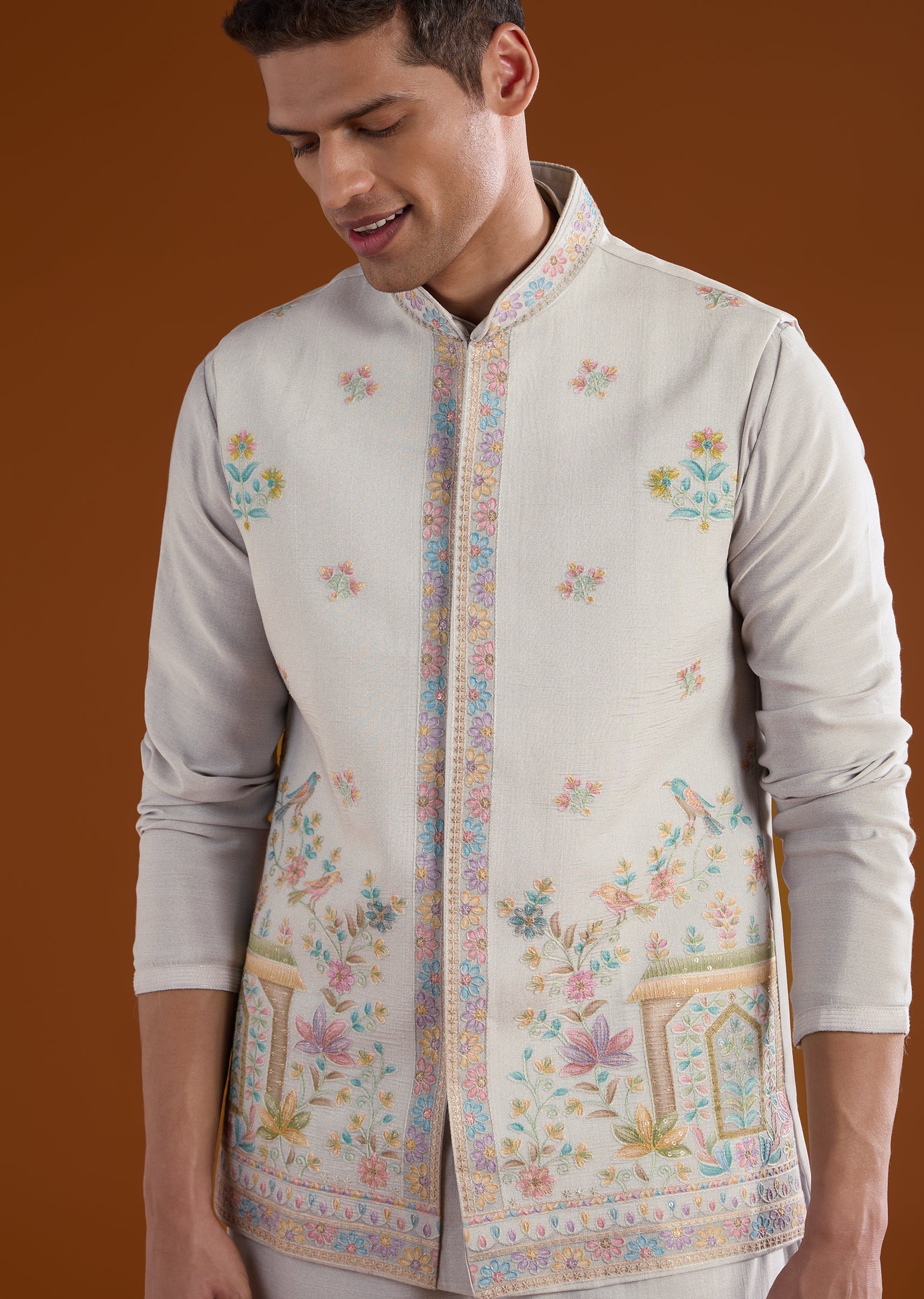 Grey Silk Mens Kurta Jacket Set With Thread And Motif Work