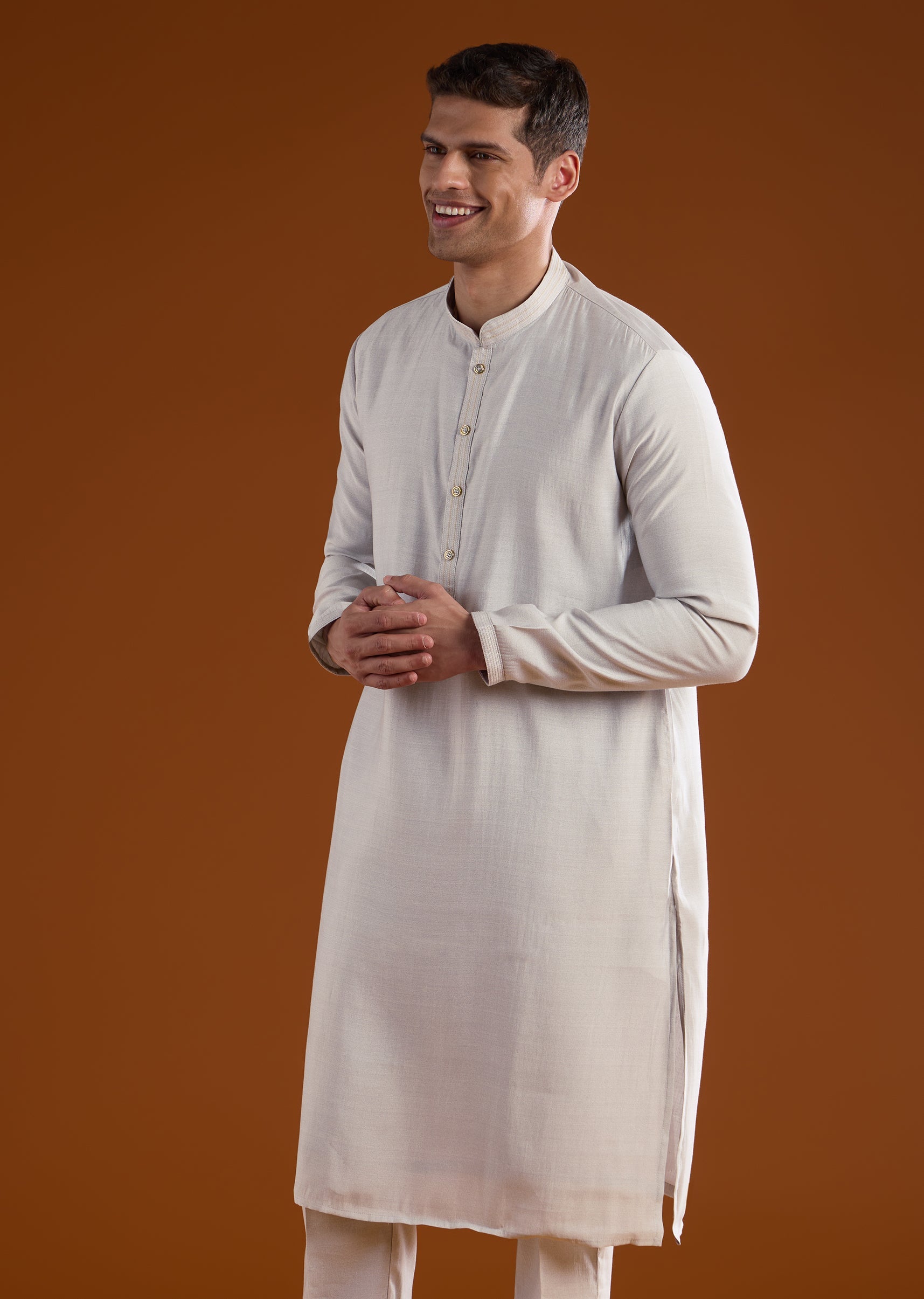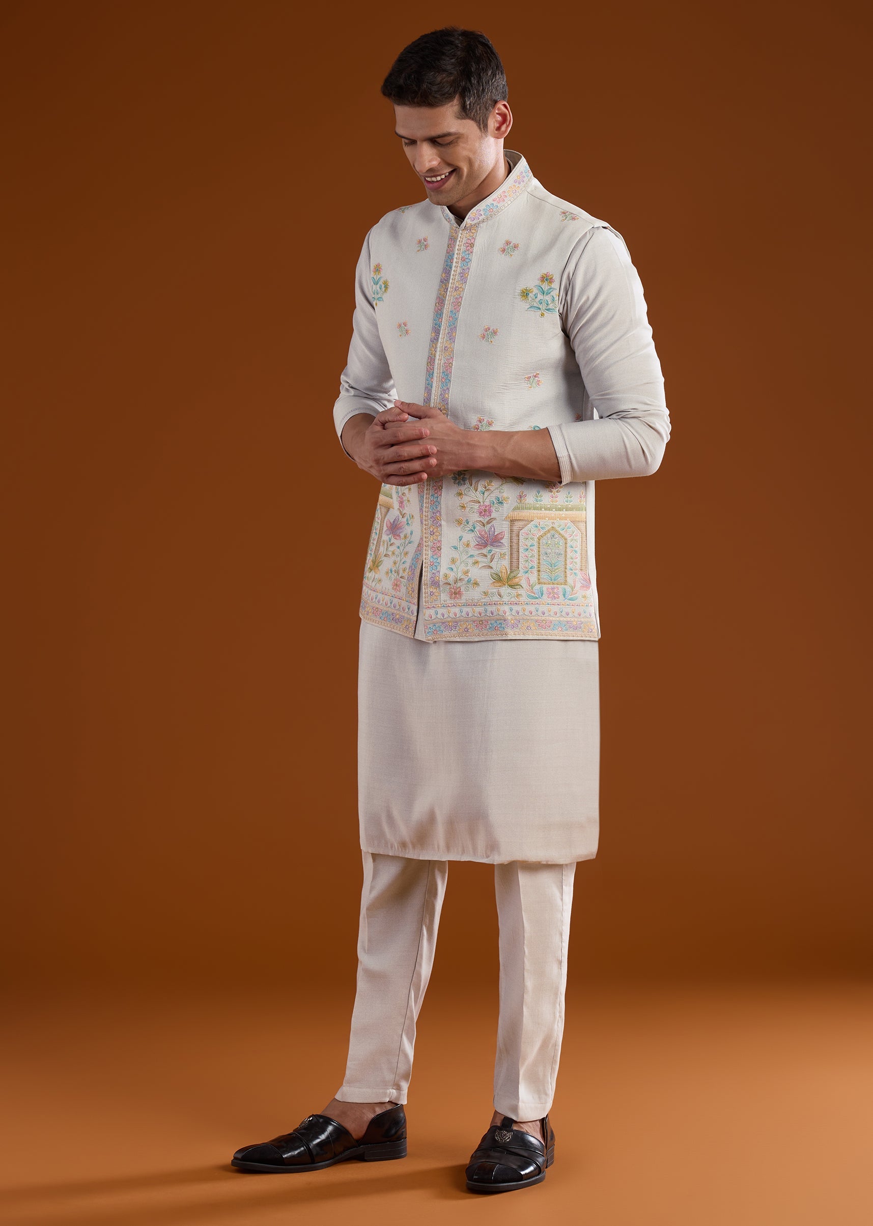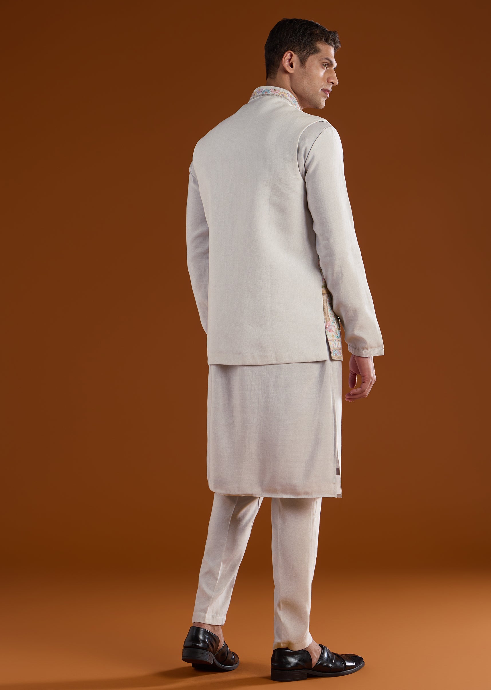 Grey Silk Mens Kurta Jacket Set With Thread And Motif Work