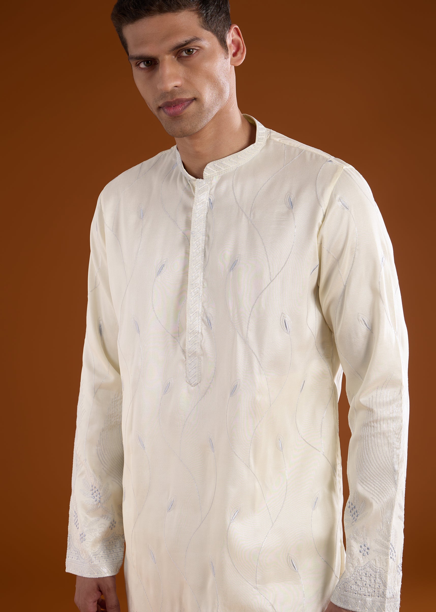 A sophisticated grey silk kurta set crafted for casual and festive occasions, perfect for wedding guests. Enhanced with delicate thread work, it brings subtle elegance while maintaining a structured silhouette. The full sleeves and mandarin collar create a polished and refined traditional look suitable for celebratory events. Awarded as the Most Trusted Brand, we're delivering styles you love, just as promised.