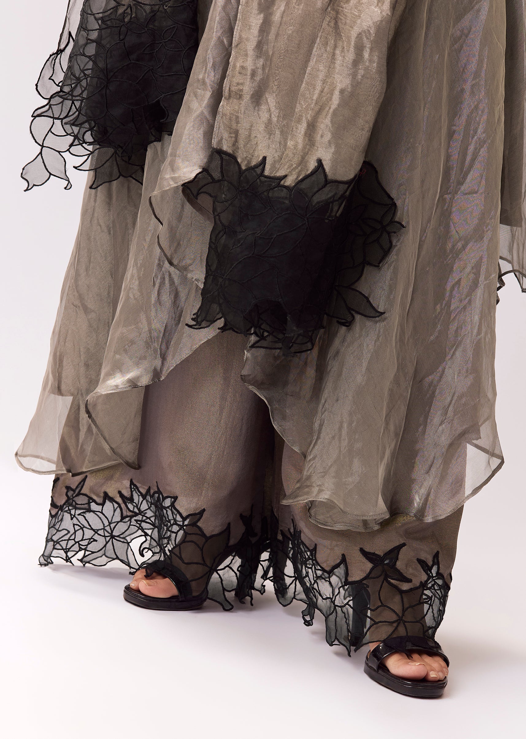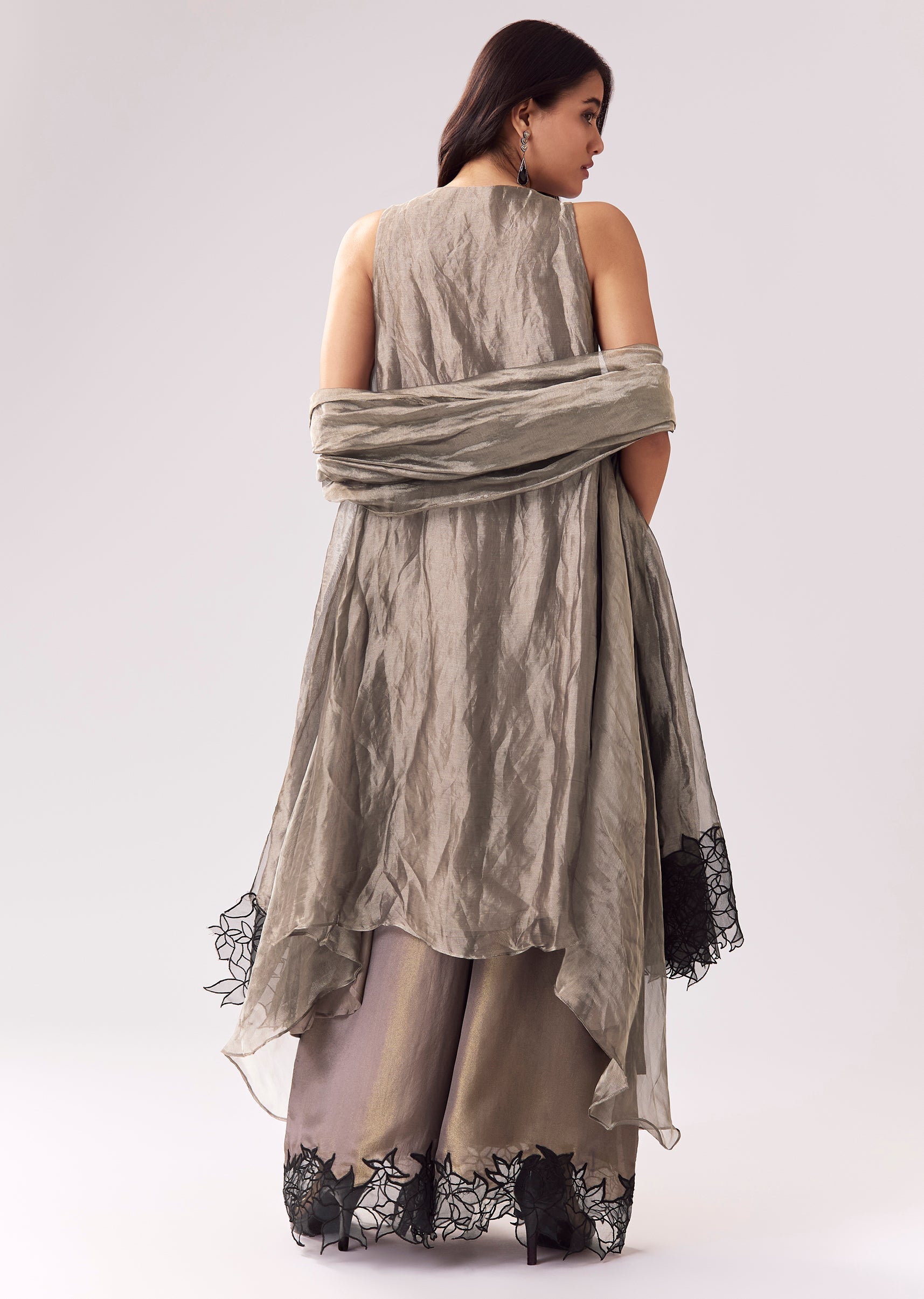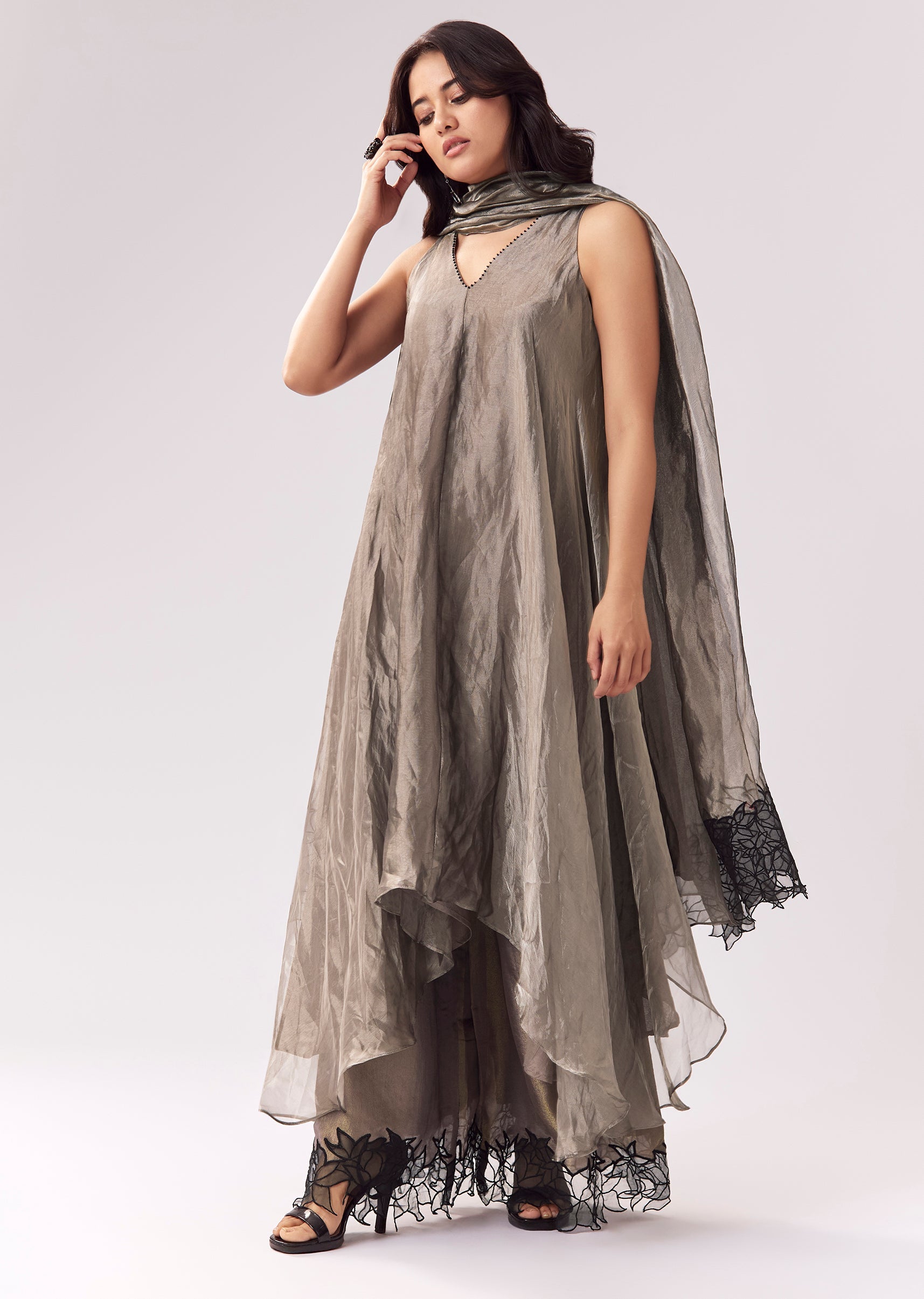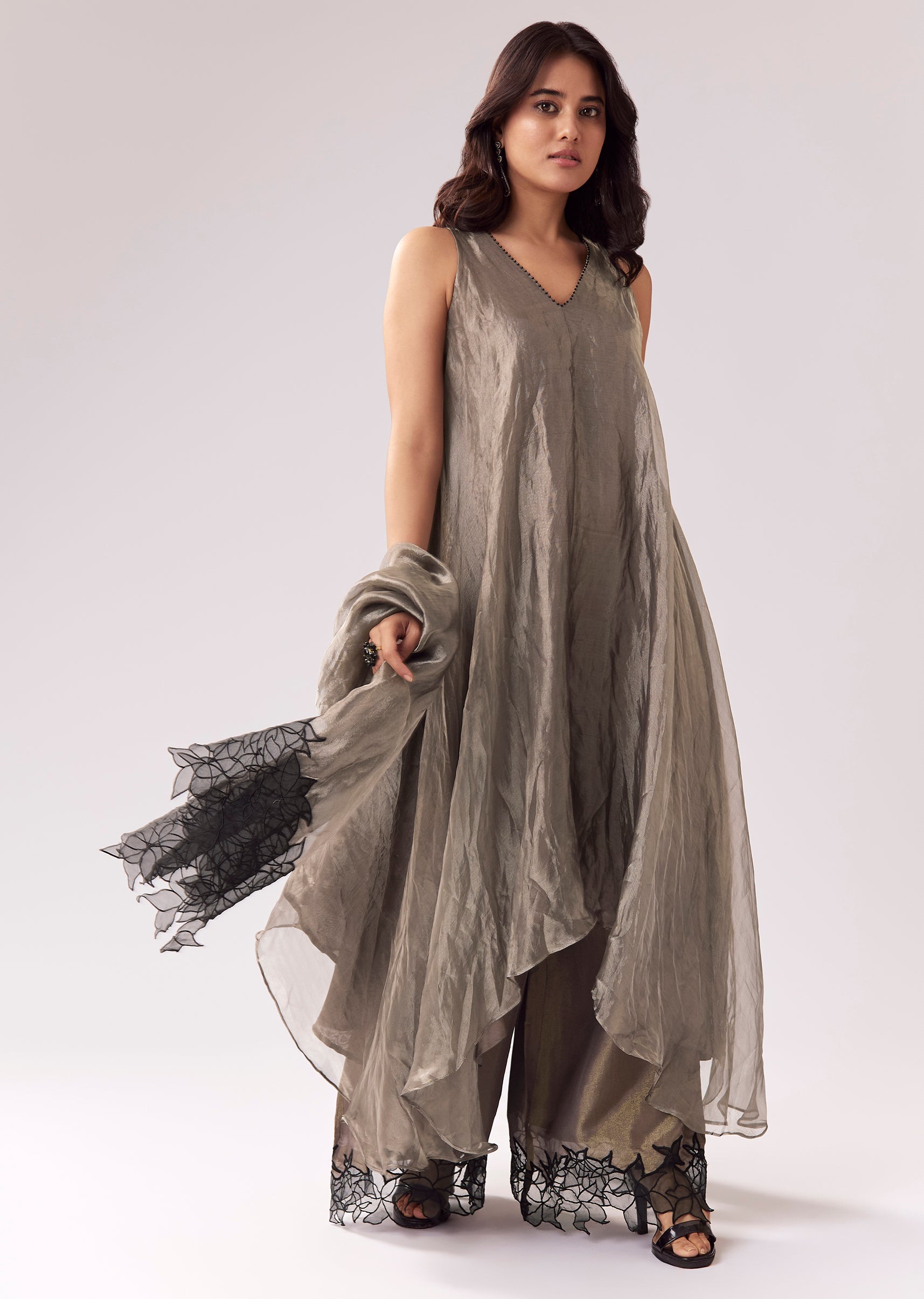 Grey Tissue Anarkali With Beadwork And Patchwork Accents