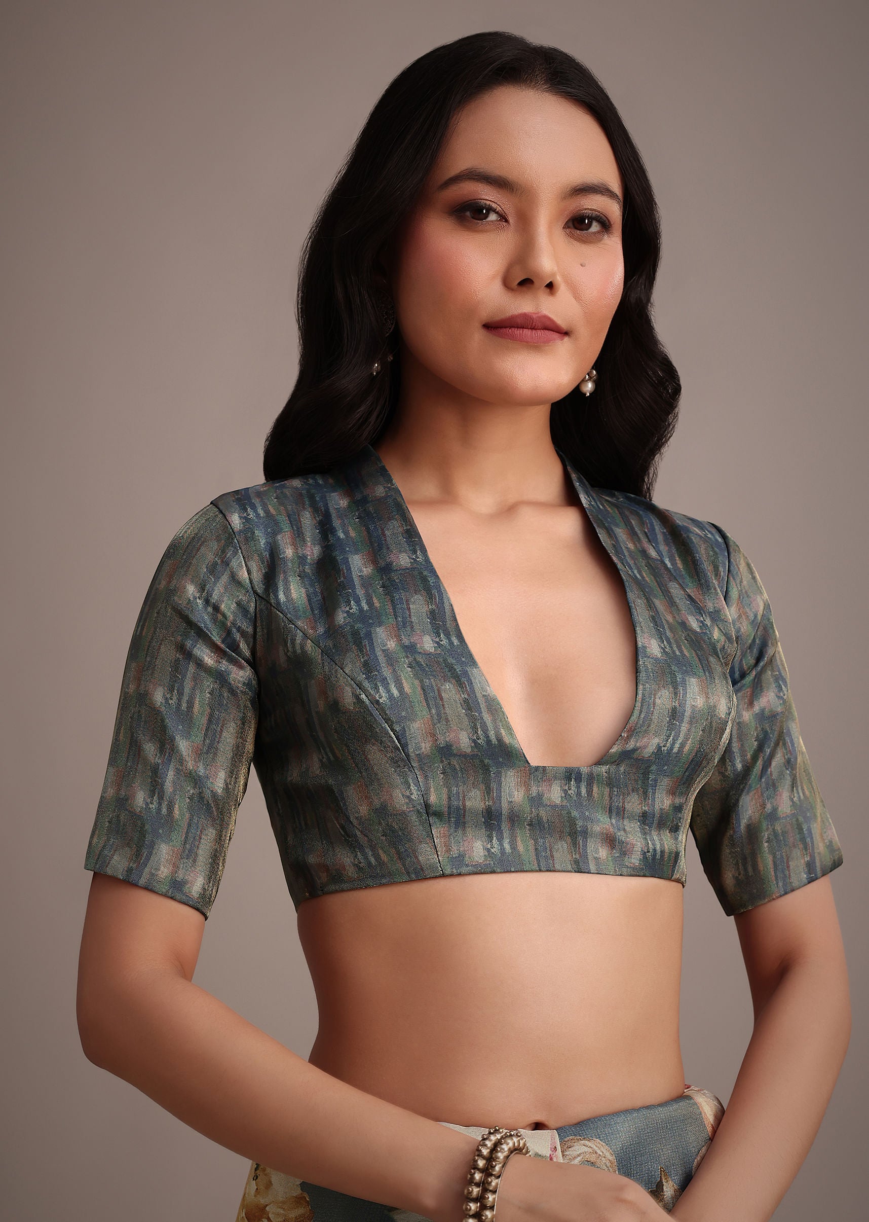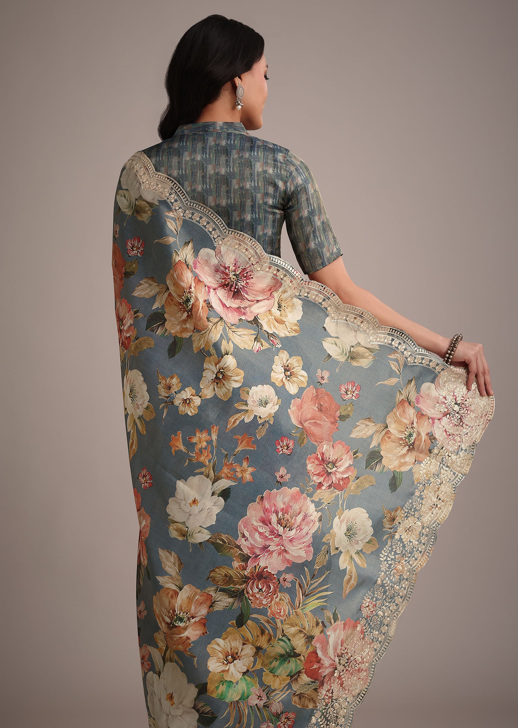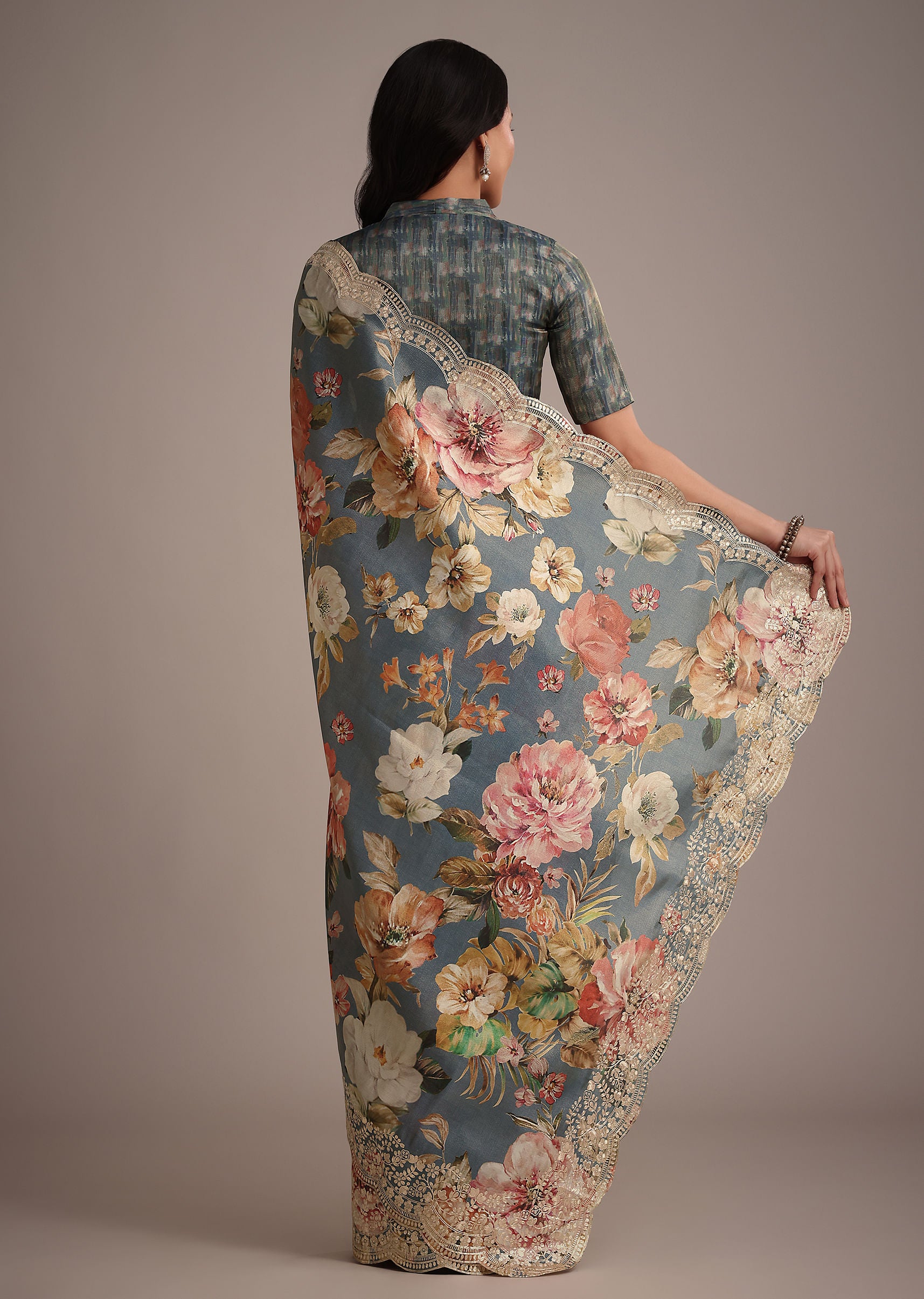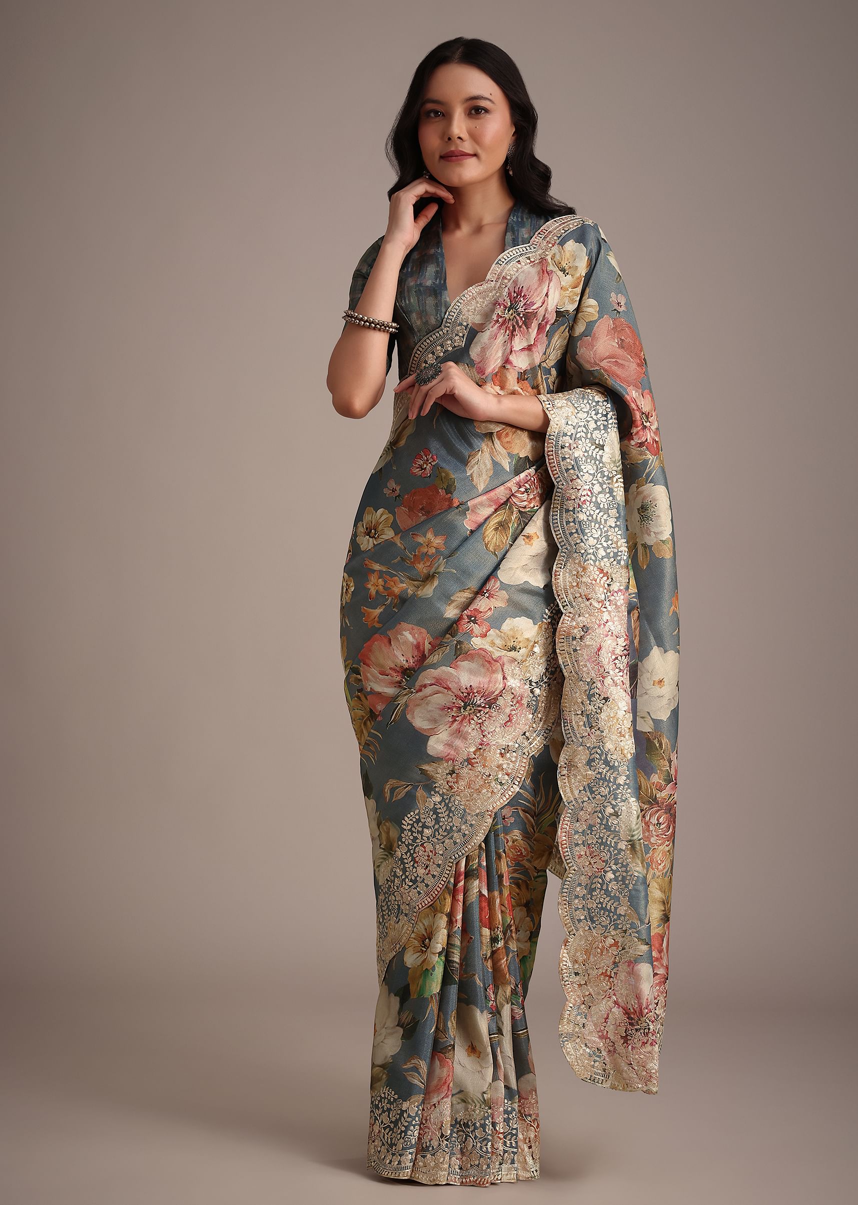 The muted elegance of grey tissue muslin is enhanced with digital prints and a pitta work border giving this saree a refined sophisticated charm. Pair it with oxidized jewelry for an edgy look. Awarded as the Most Trusted Brand, we're delivering styles you love, just as promised.