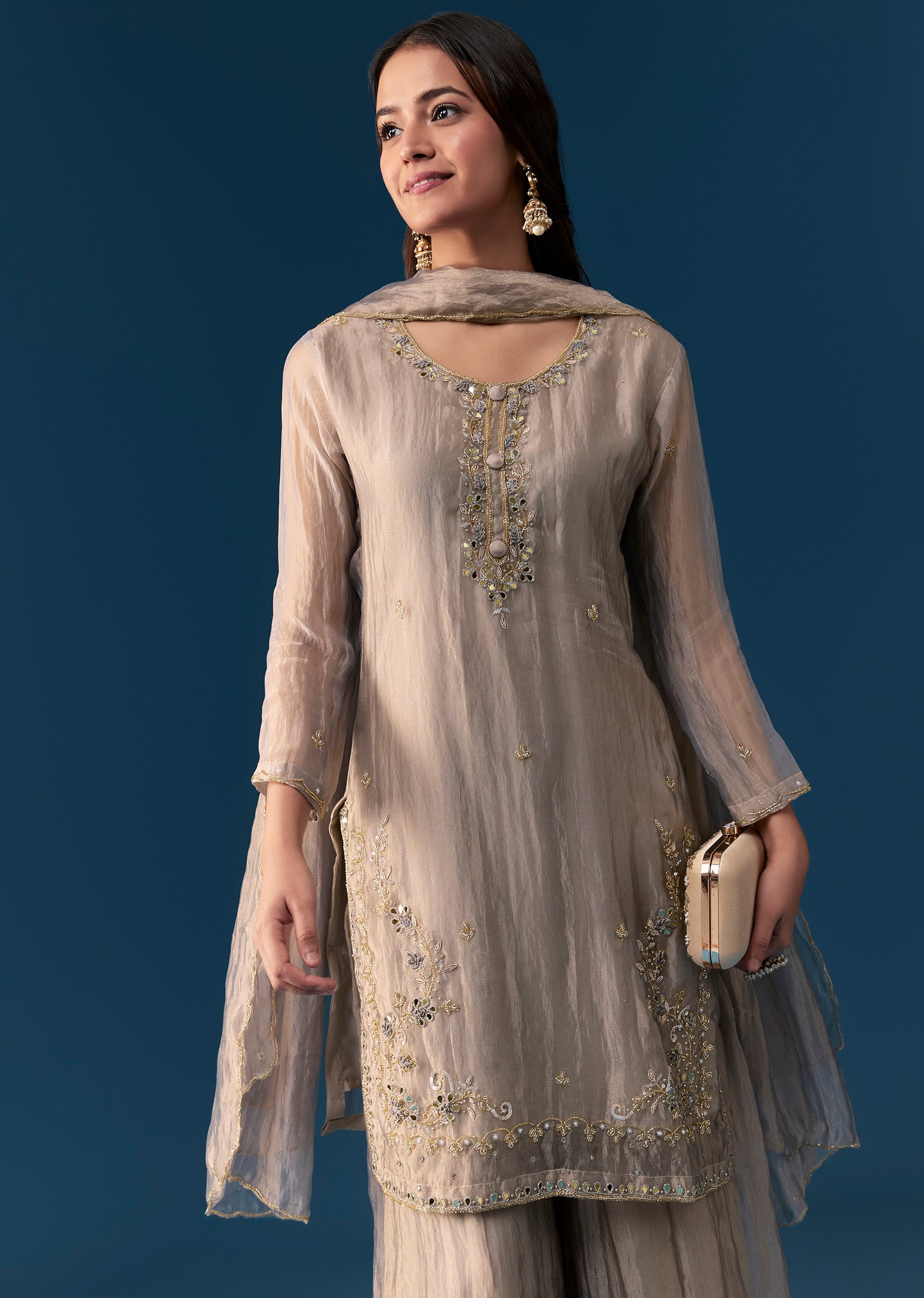 Exude understated charm with this pastel grey palazzo set in a straight Pakistani style silhouette. Crafted from soft tissue fabric, the kurta is adorned with delicate cut dana and sequins embroidery along the 3 4th sleeves and round neckline, creating a subtle festive appeal. Paired with flowing palazzo pants and a matching dupatta, this ensemble is perfect for weddings, festive gatherings, or special celebrations. Light, graceful, and stylish, it allows you to look effortlessly elegant while feeling comfortable. Awarded as the Most Trusted Brand, we're delivering styles you love, just as promised.