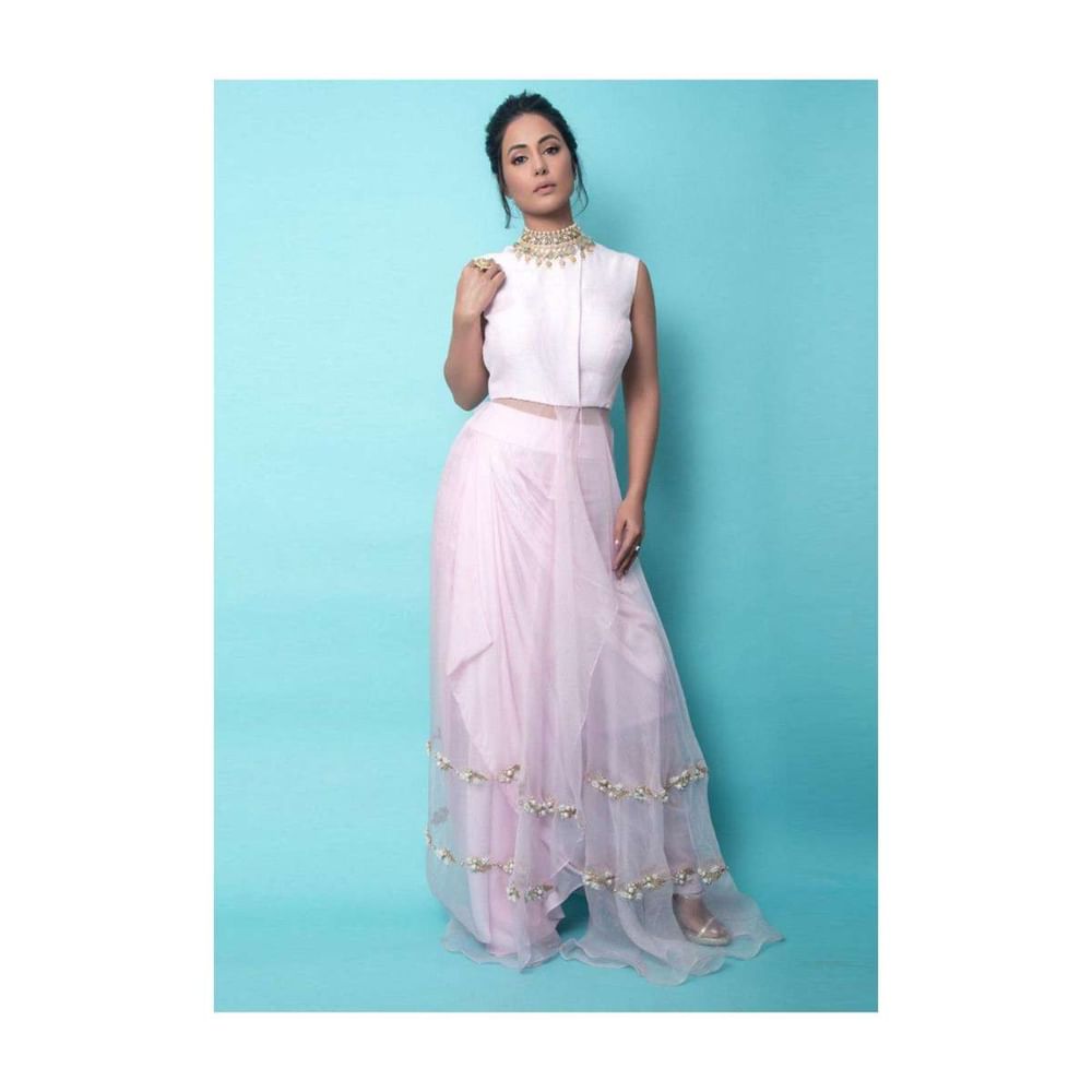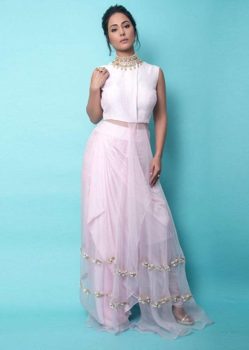 Hina Khan In Kalki Indowestern Powder Pink Skirt And Top With Pearls Embroidery