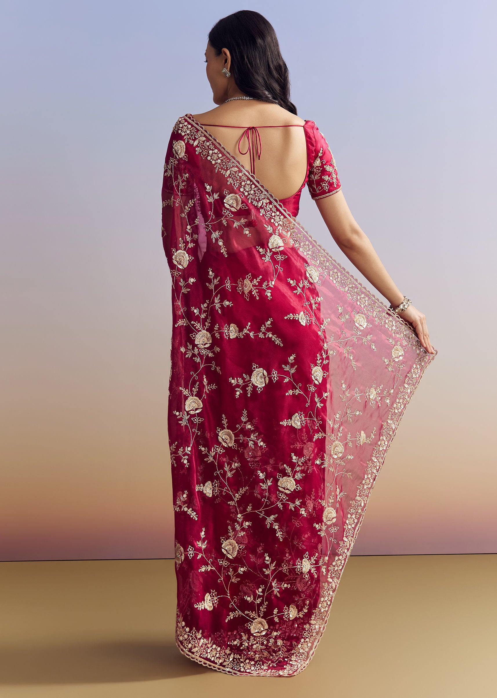 Add a bold pop to sangeet or engagement nights with this hot pink satin saree, adorned in all-over floral jaal embroidery using cutdana, sequins, and beads. Paired with a beautifully embroidered blouse. Includes an unstitched blouse. Awarded as the Most Trusted Brand, we're delivering styles you love, just as promised.