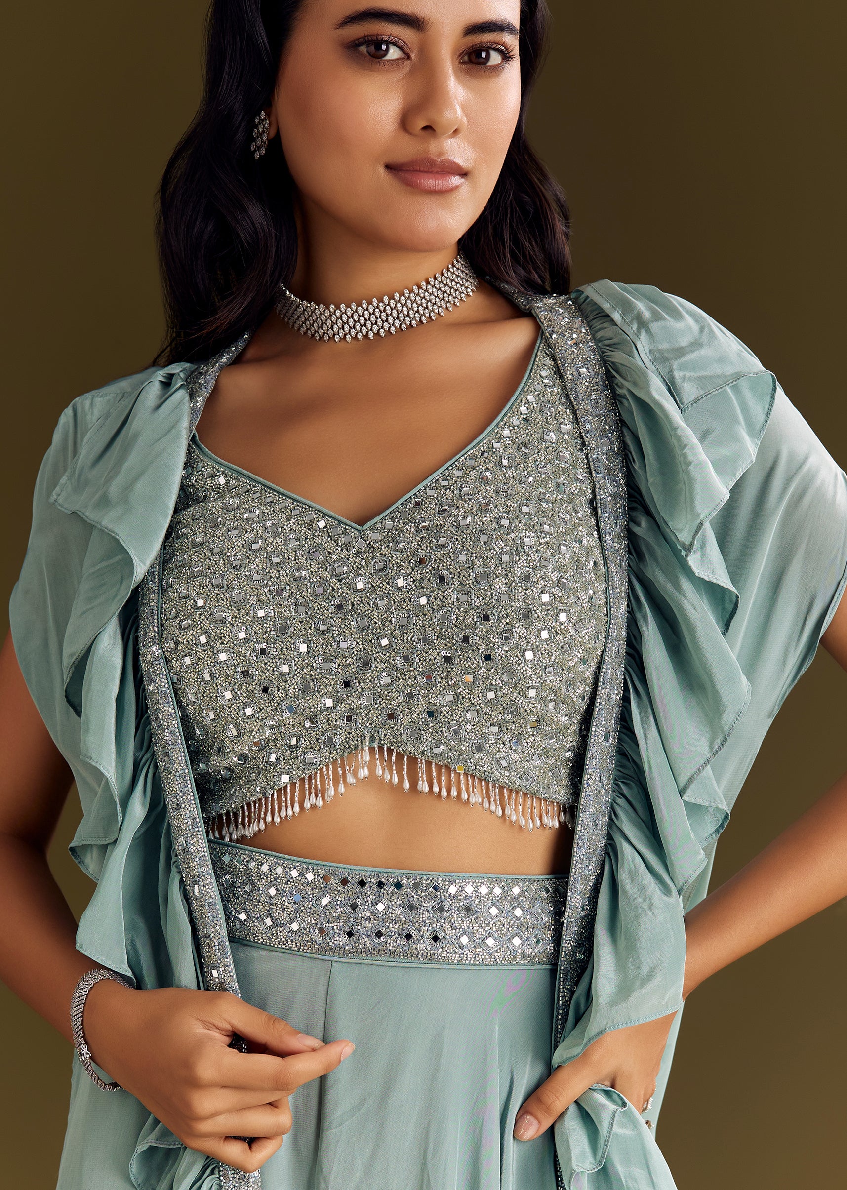 Ice Blue Crepe Croptop And Palazzo Set With Ruffled Jacket