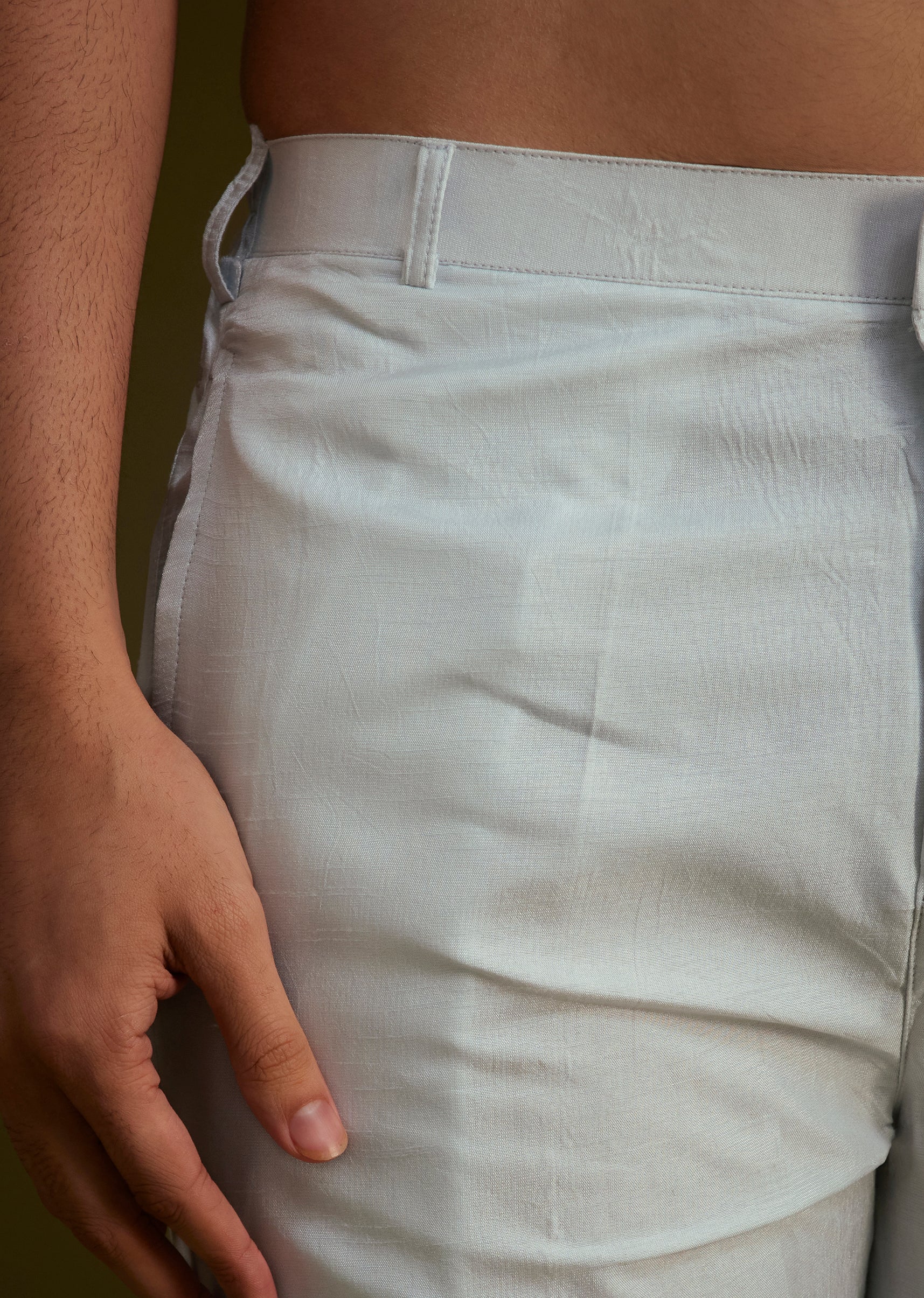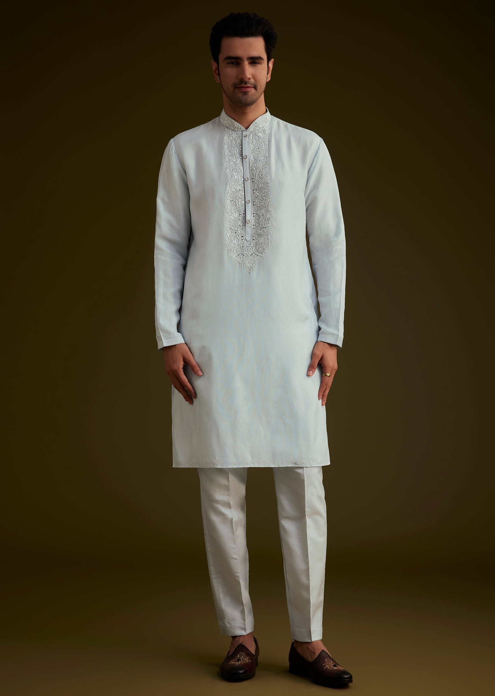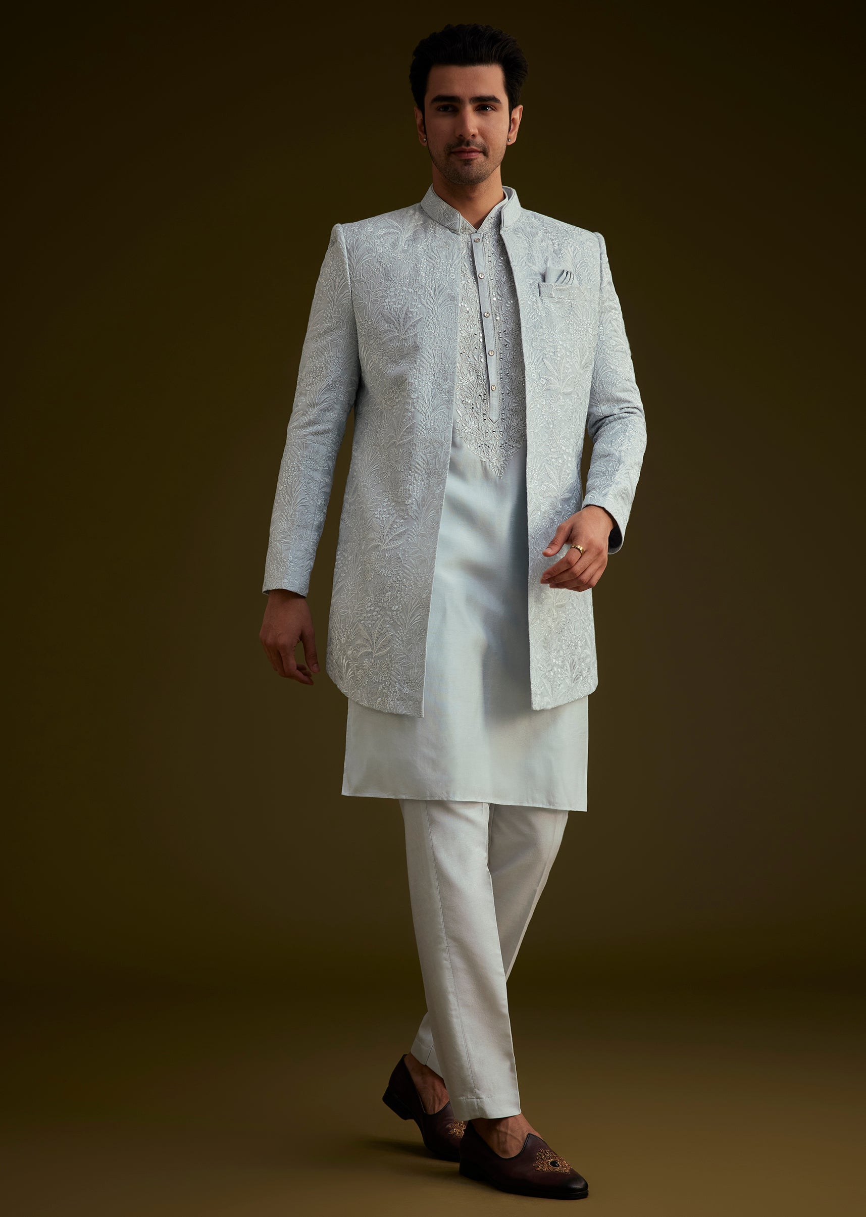 Ice Blue Silk Sherwani Set With Floral Resham And Mirror Work