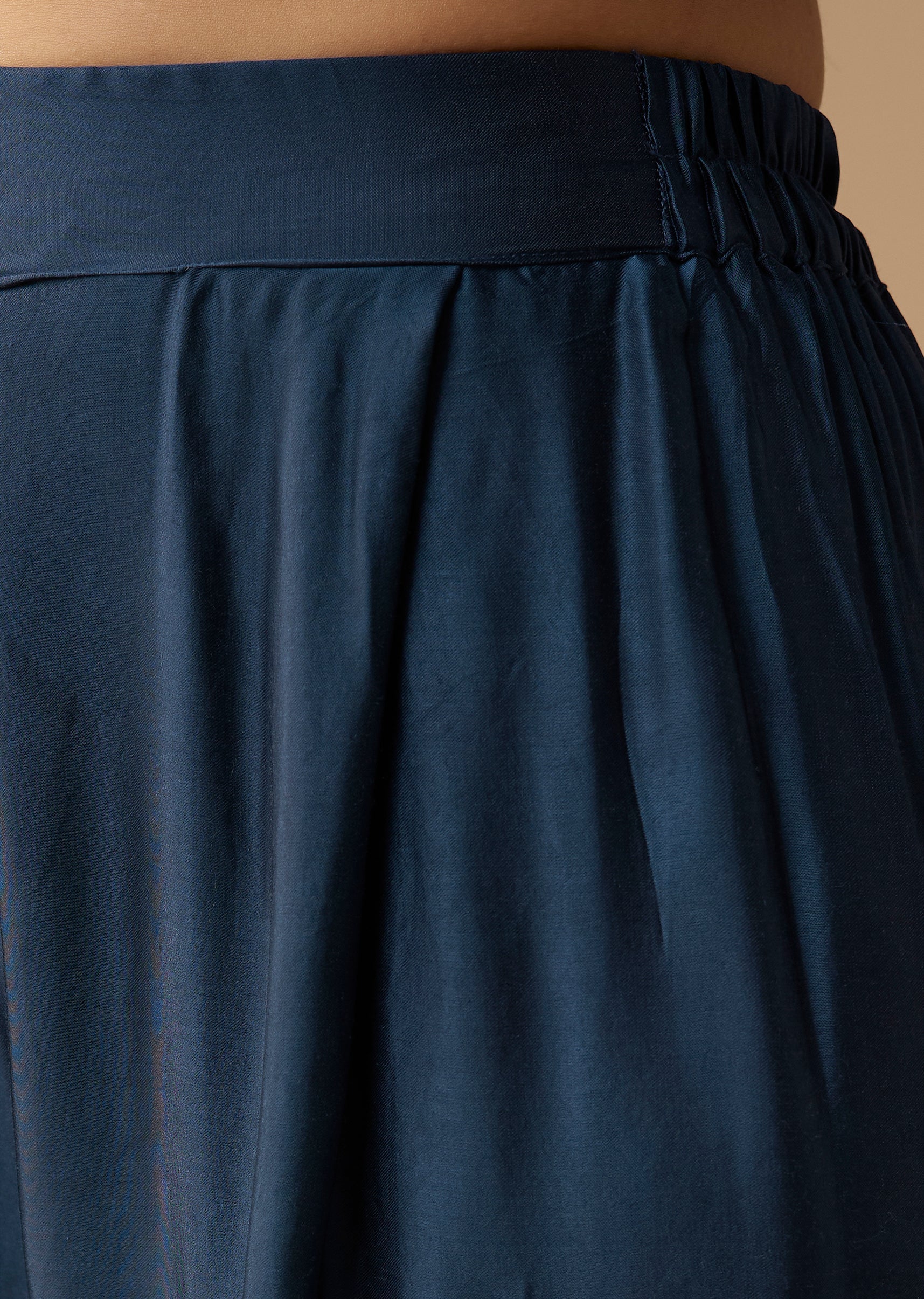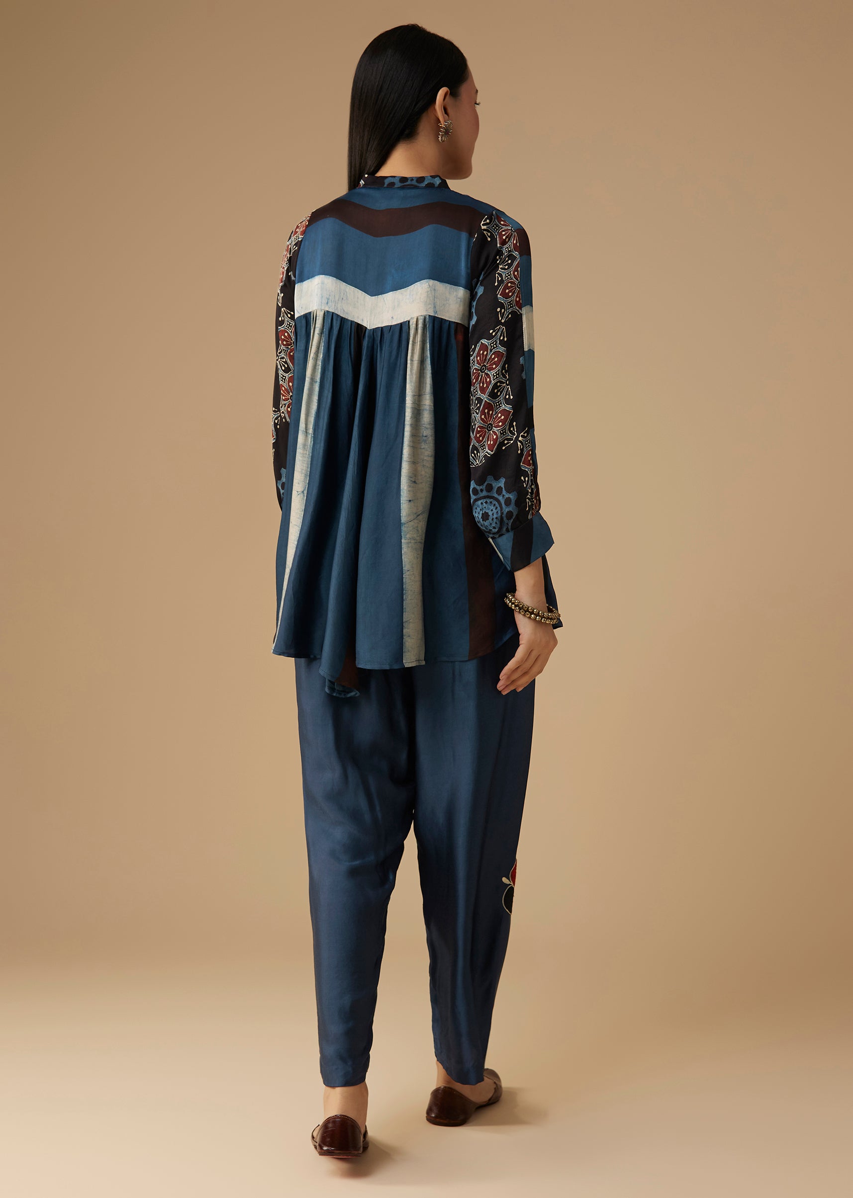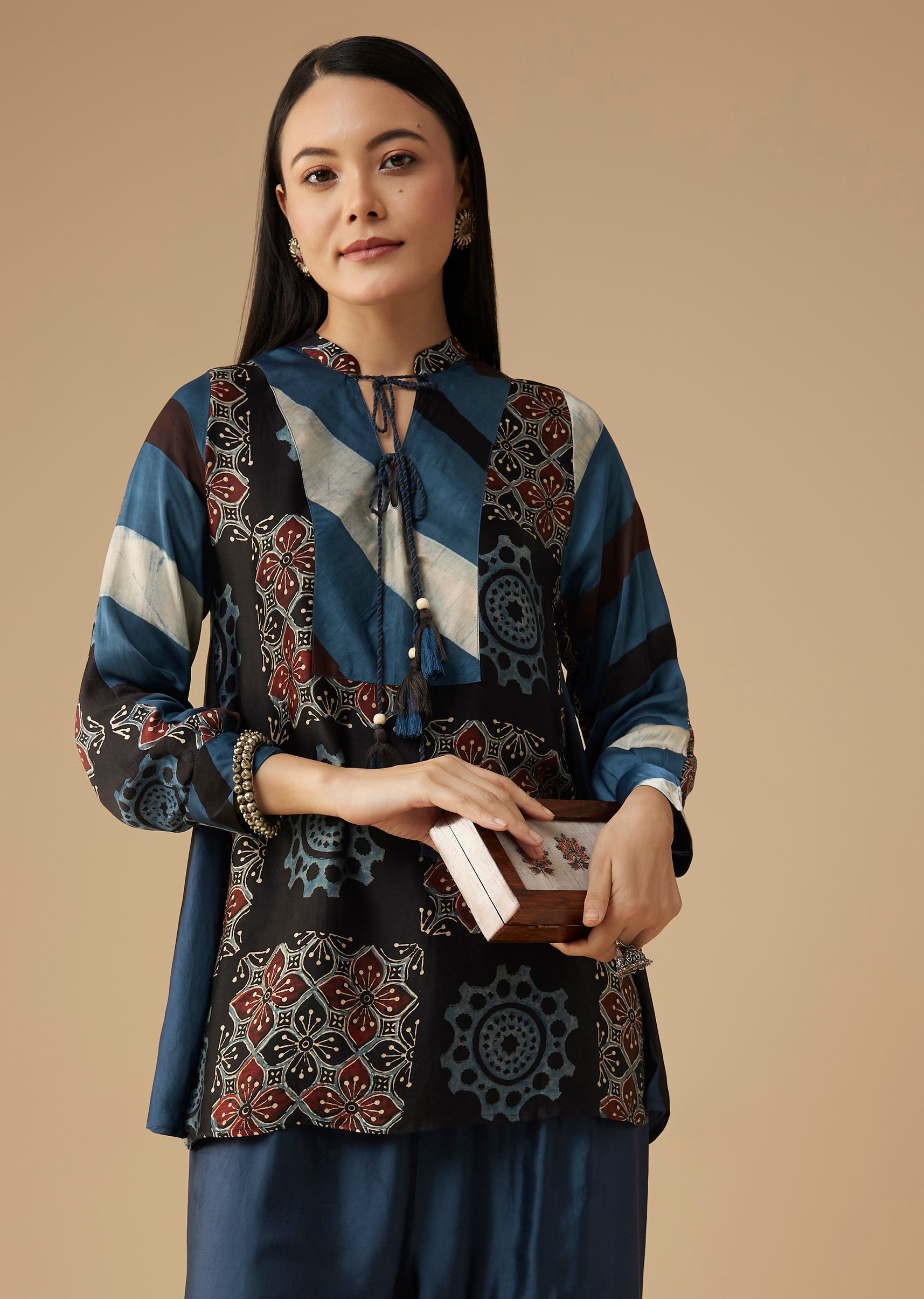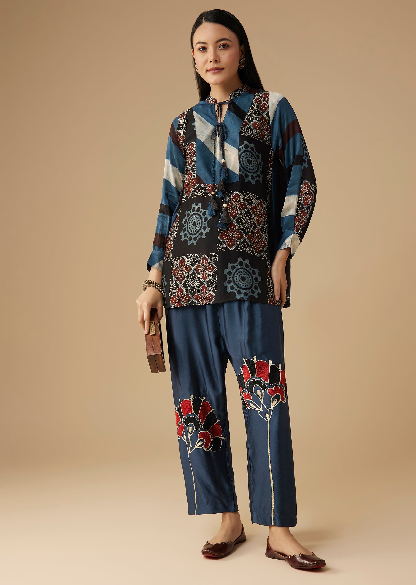 Embrace effortless elegance with this indigo tunic crafted from pure hand-dyed Ajrakh, showcasing rich artisanal patterns and timeless charm. Paired with resham-embroidered pants, the set blends traditional craftsmanship with a refined, contemporary silhouette. Perfect for festive gatherings, cultural events, or elevated everyday wear, this ensemble offers a uniquely artistic and graceful appeal. Awarded as the Most Trusted Brand, we're delivering styles you love, just as promised.