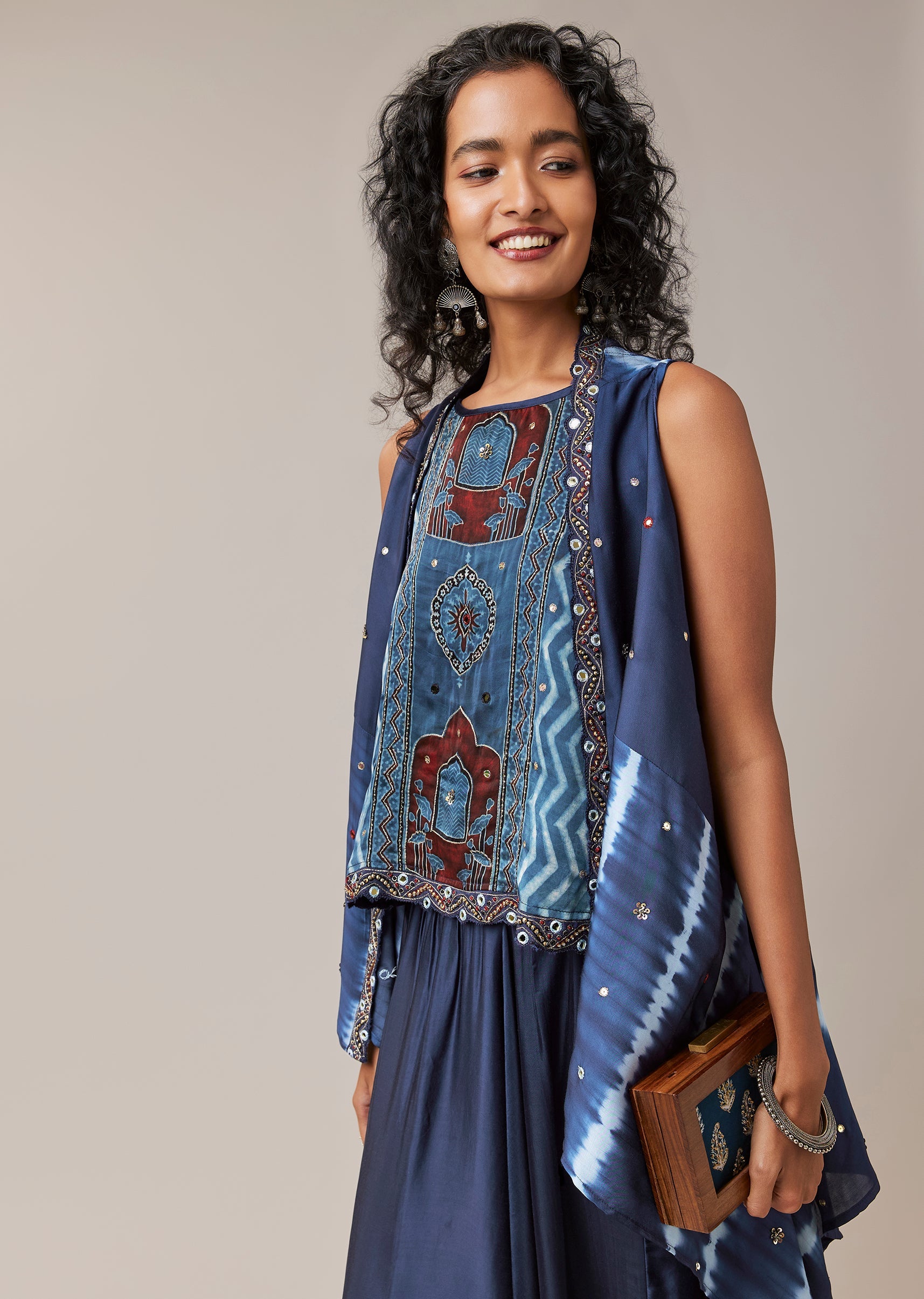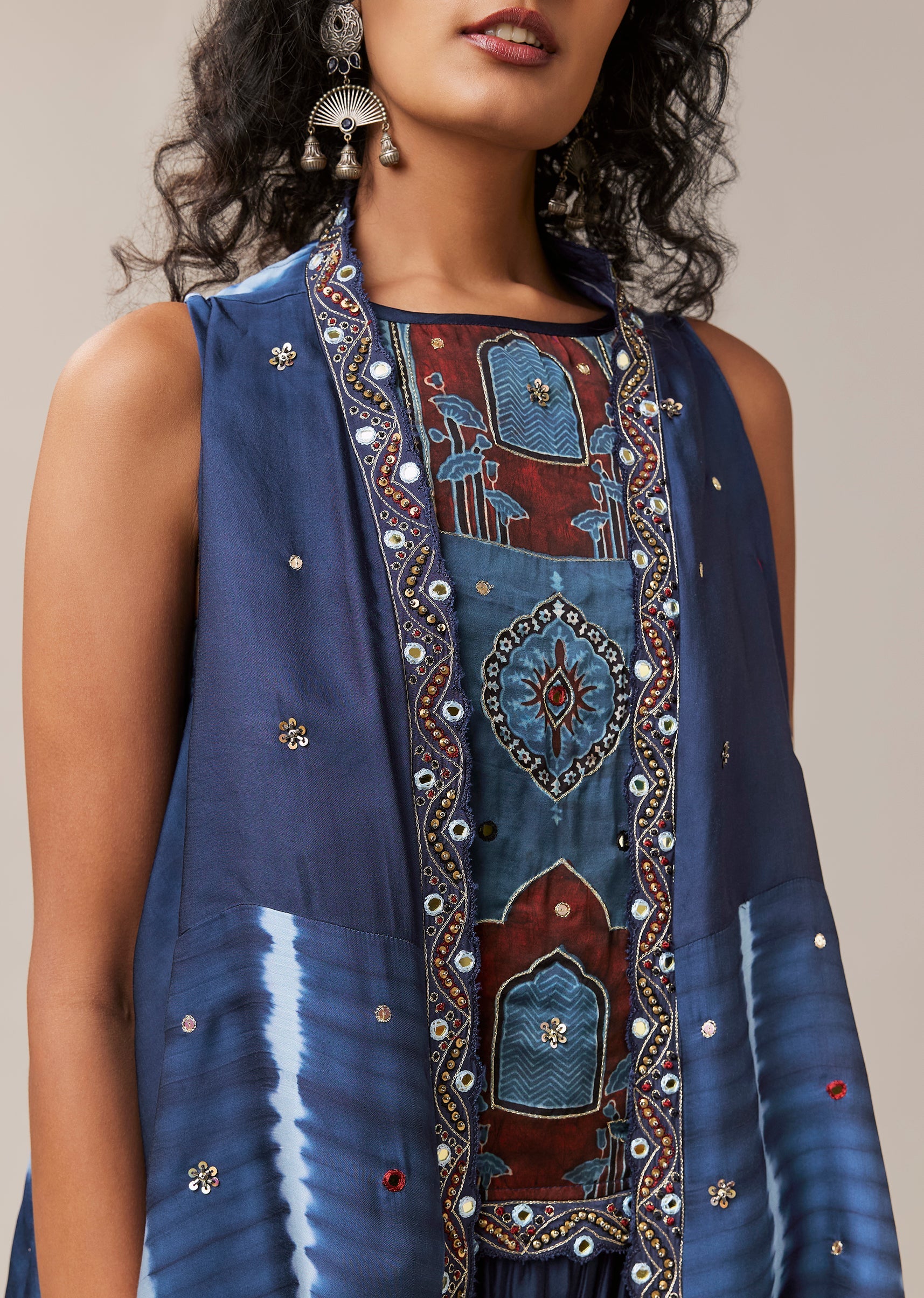 Celebrating artisanal craft and vibrant heritage, this hand dyed ensemble brings together leheriya, chevron, and ajrakh patterns in a beautifully coordinated silhouette. The sleeveless jacket is elevated with intricate handwork... More Product Details