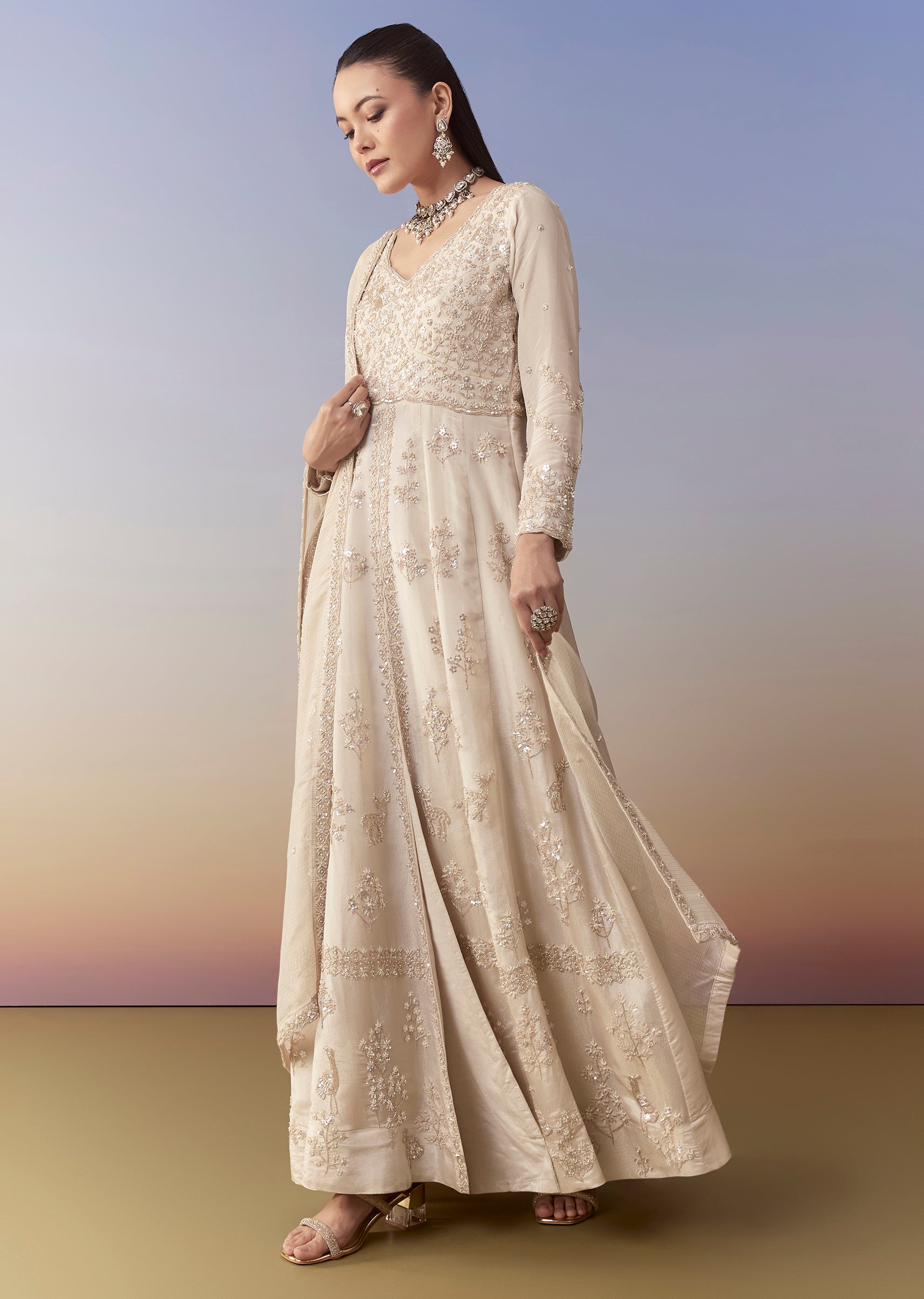 Exude graceful sophistication with this ivory front-slit anarkali set, adorned with intricate cutdana and sequin work that adds a soft, festive shimmer. The flowing tissue dupatta and matching palazzo enhance... More Product Details