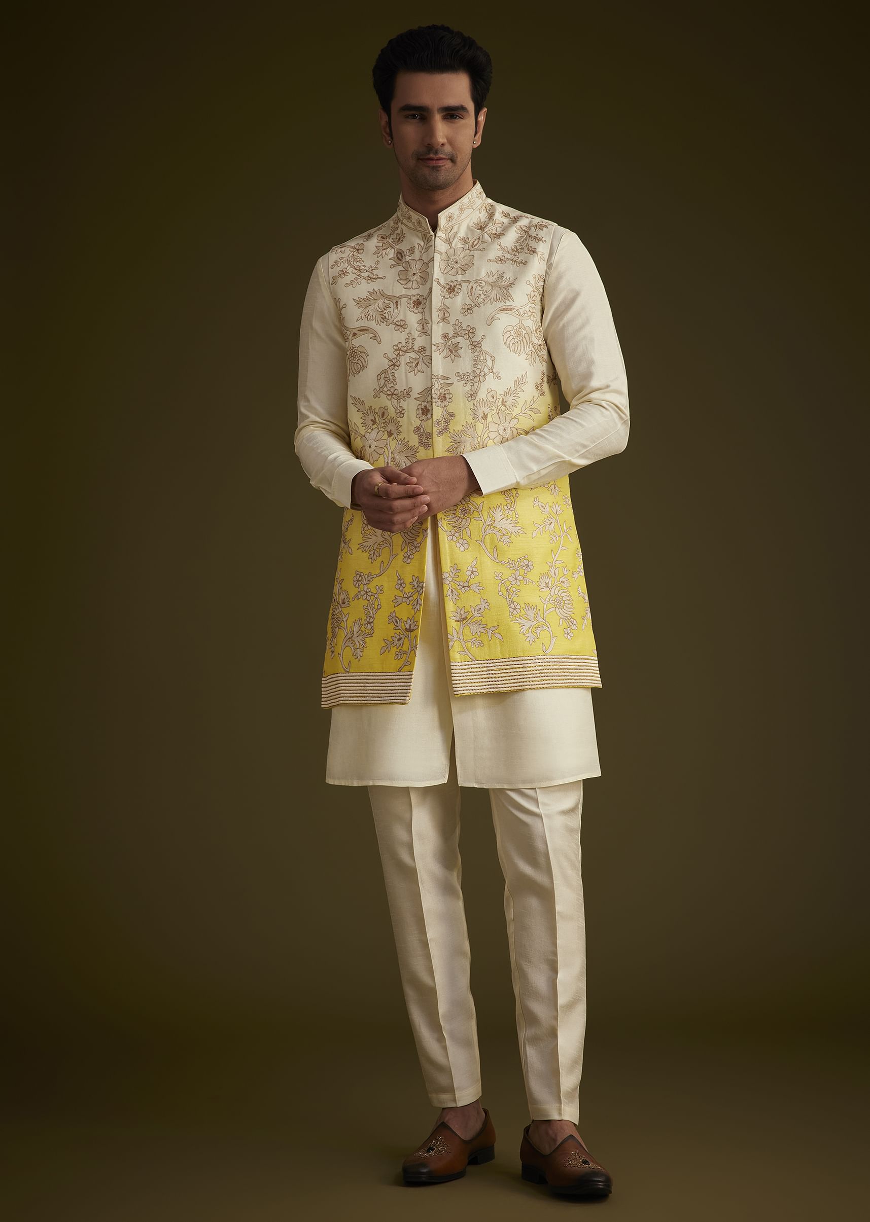 - Elevate Your Style With This Ivory And Yellow Ombre Silk Jacket Set, Showcasing Exquisite Zari Embroidery Across The Jacket.