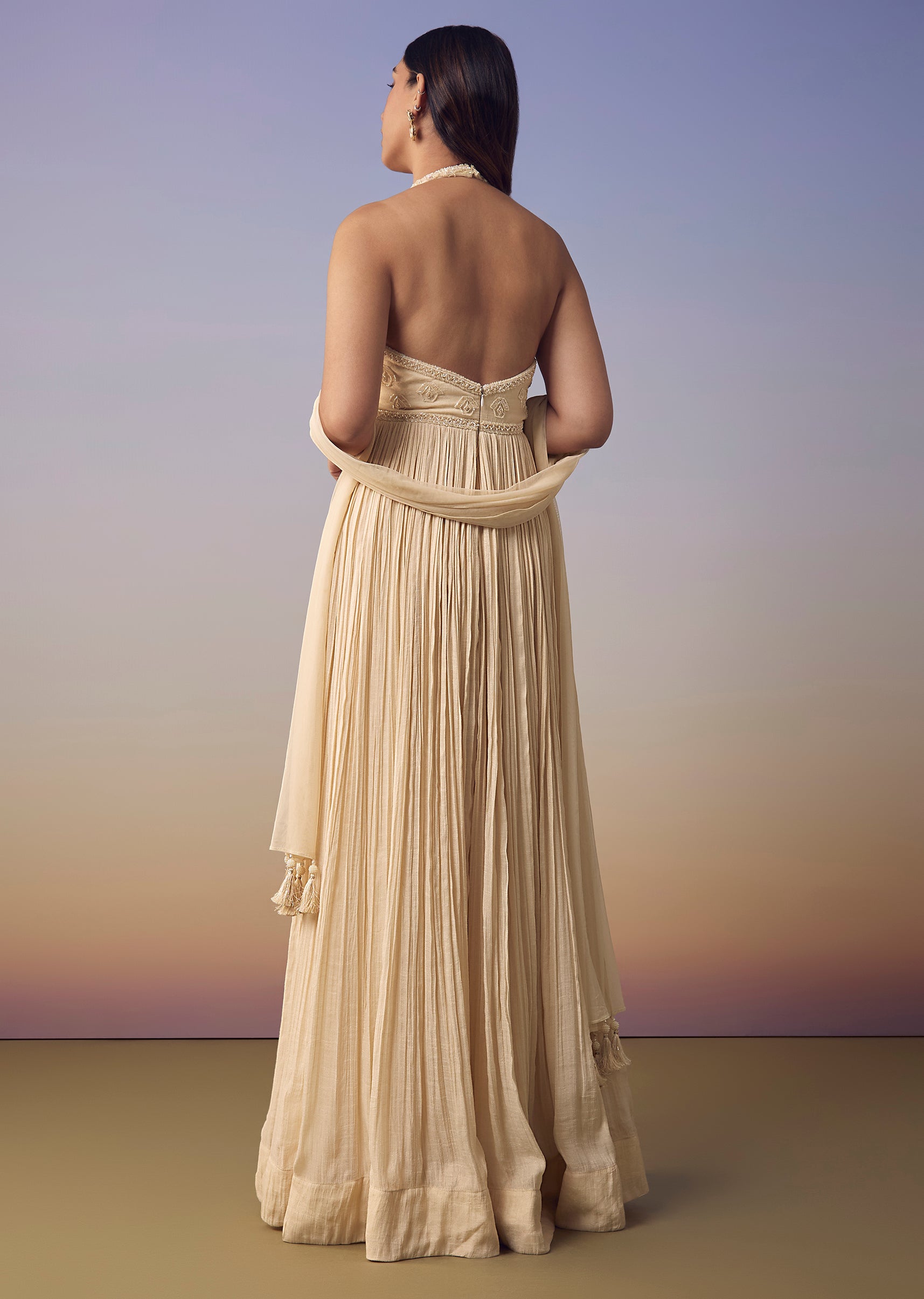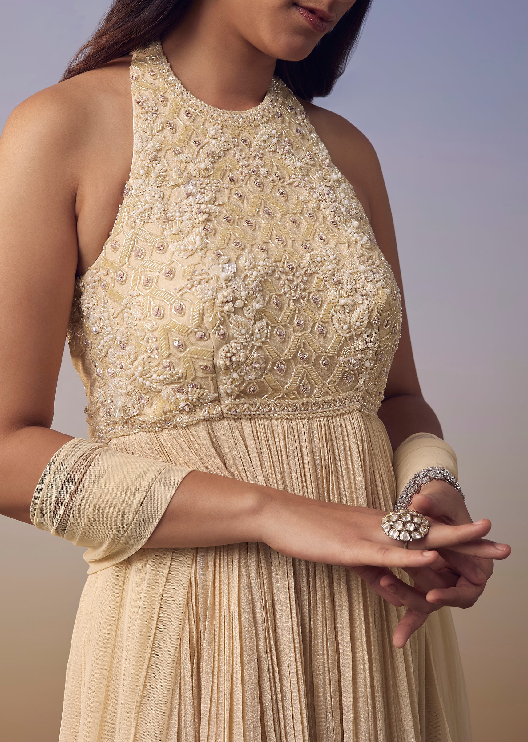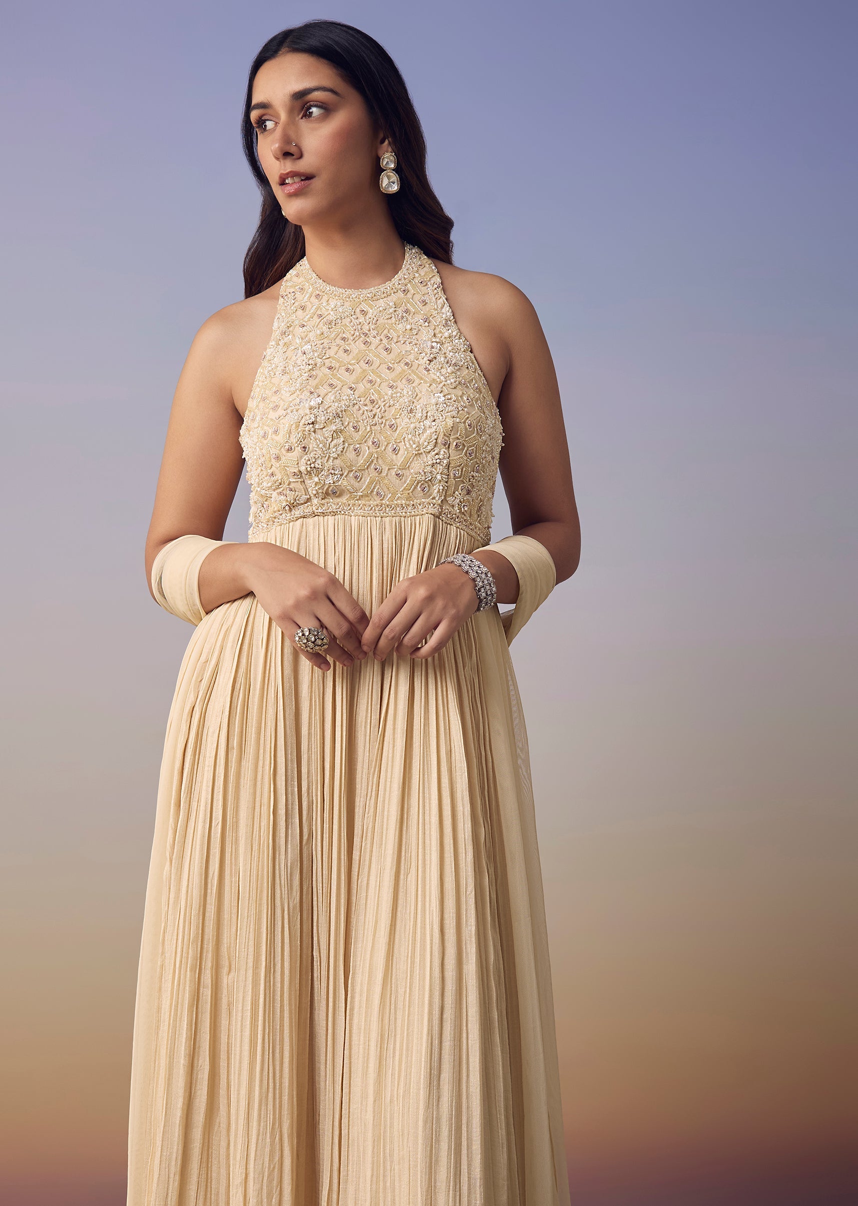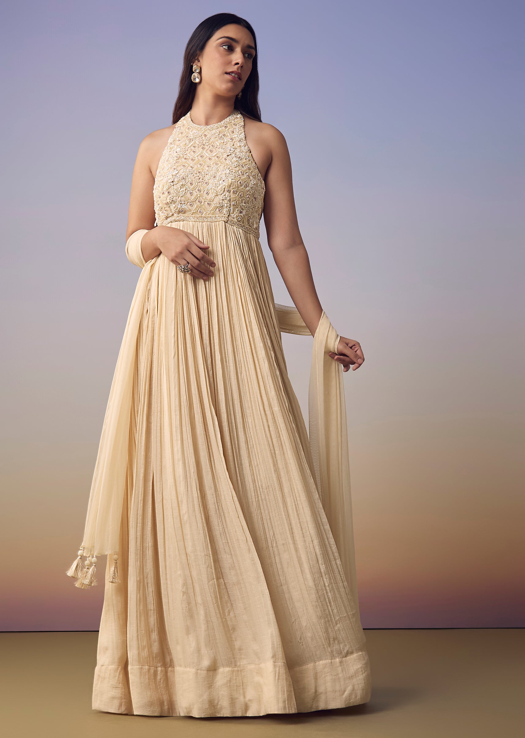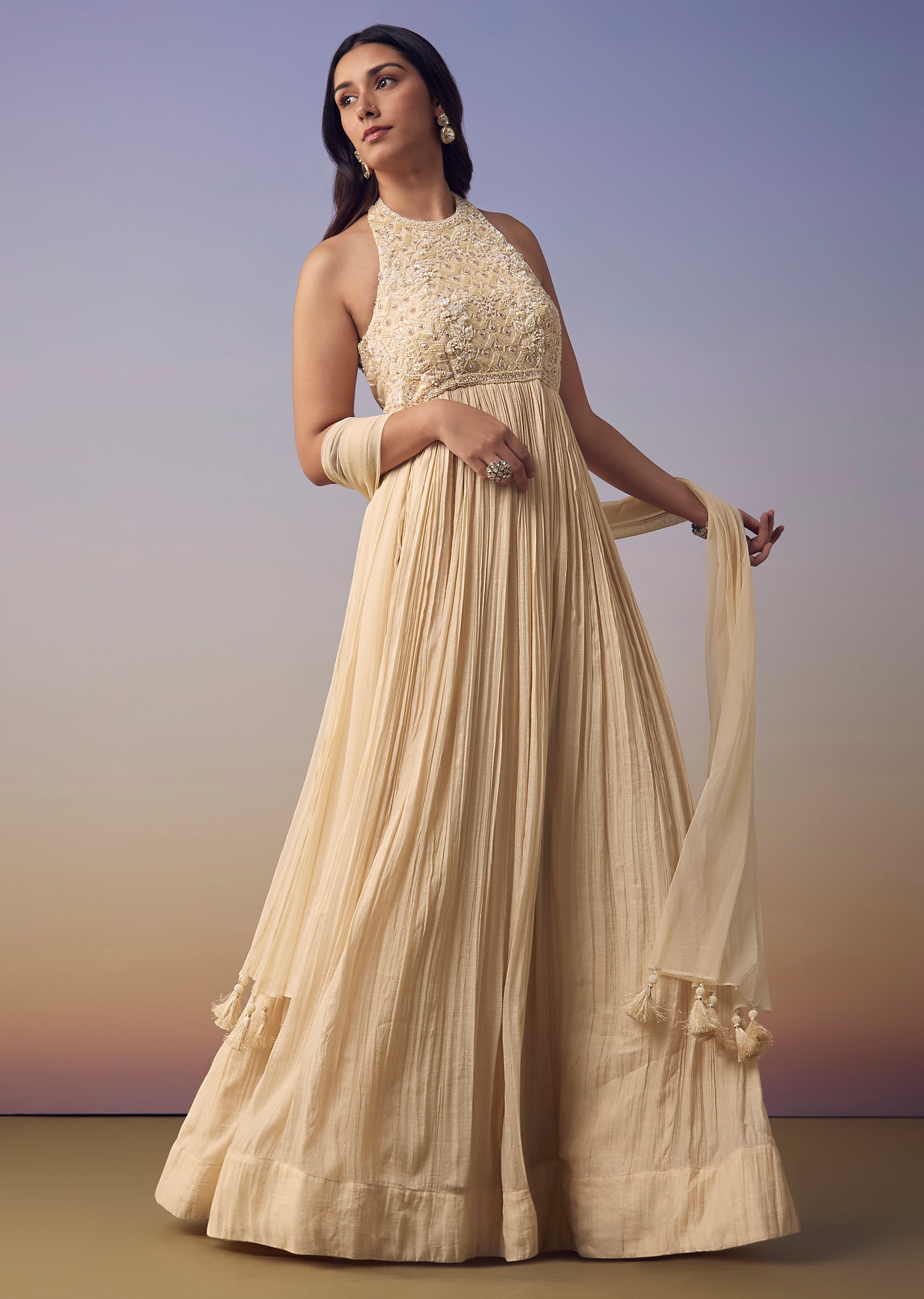 Bring modern grace to your look with this ivory floor length anarkali crafted in luxurious tissue fabric and adorned with moti accents, cut dana detailing, and fine embroidery for a... More Product Details