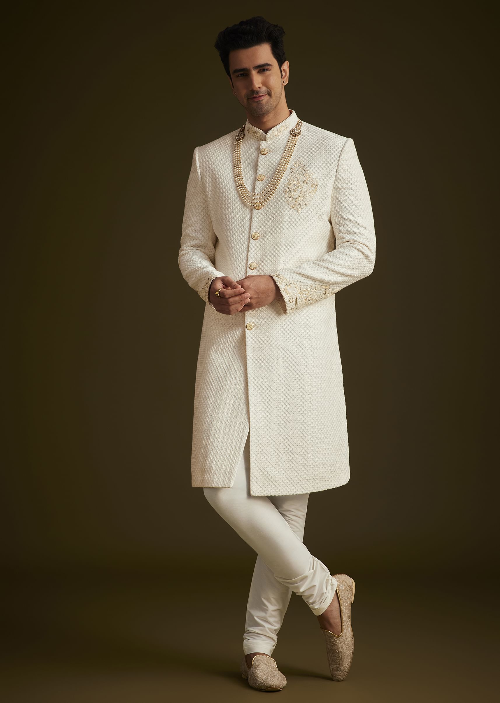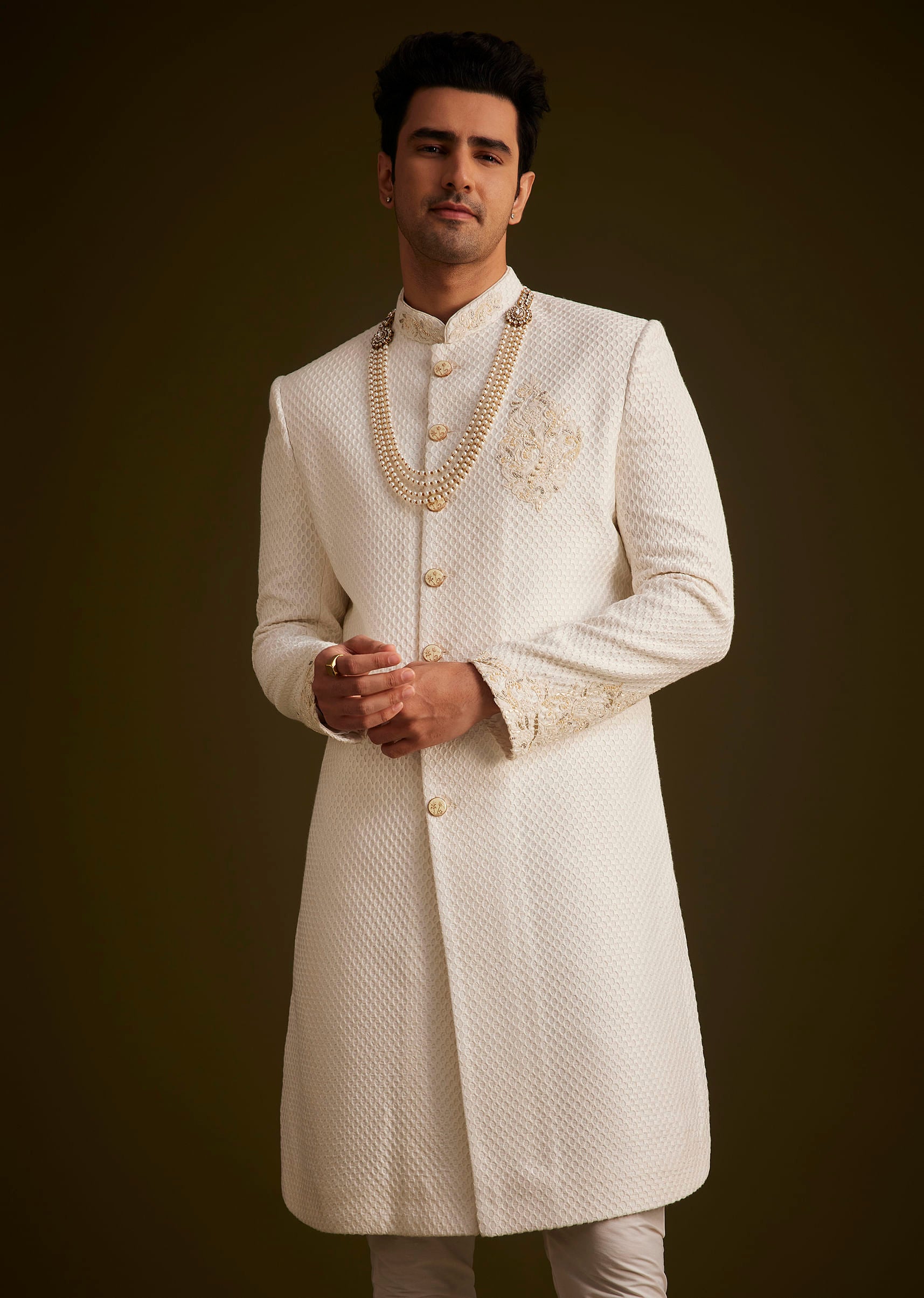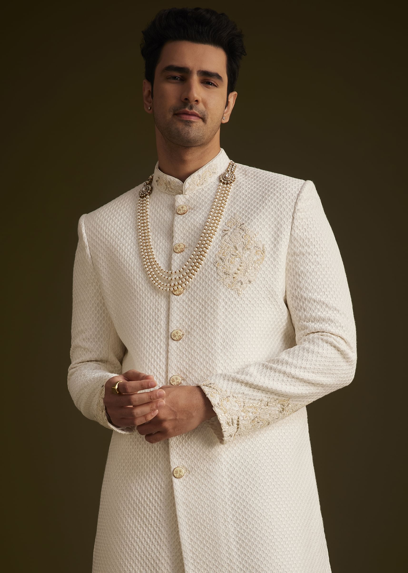 Ivory Embroidered Sherwani Set With Pearl Detailing
