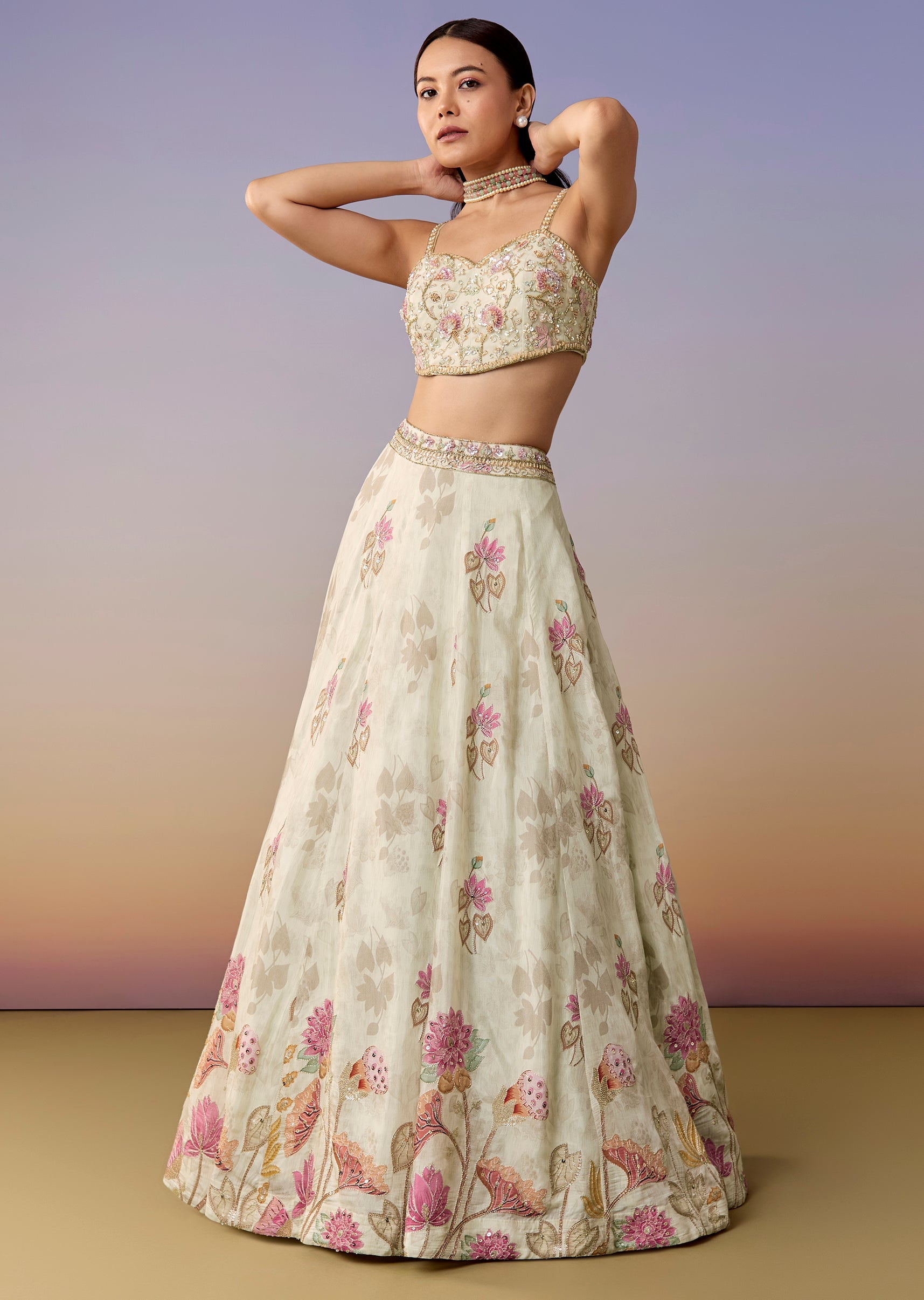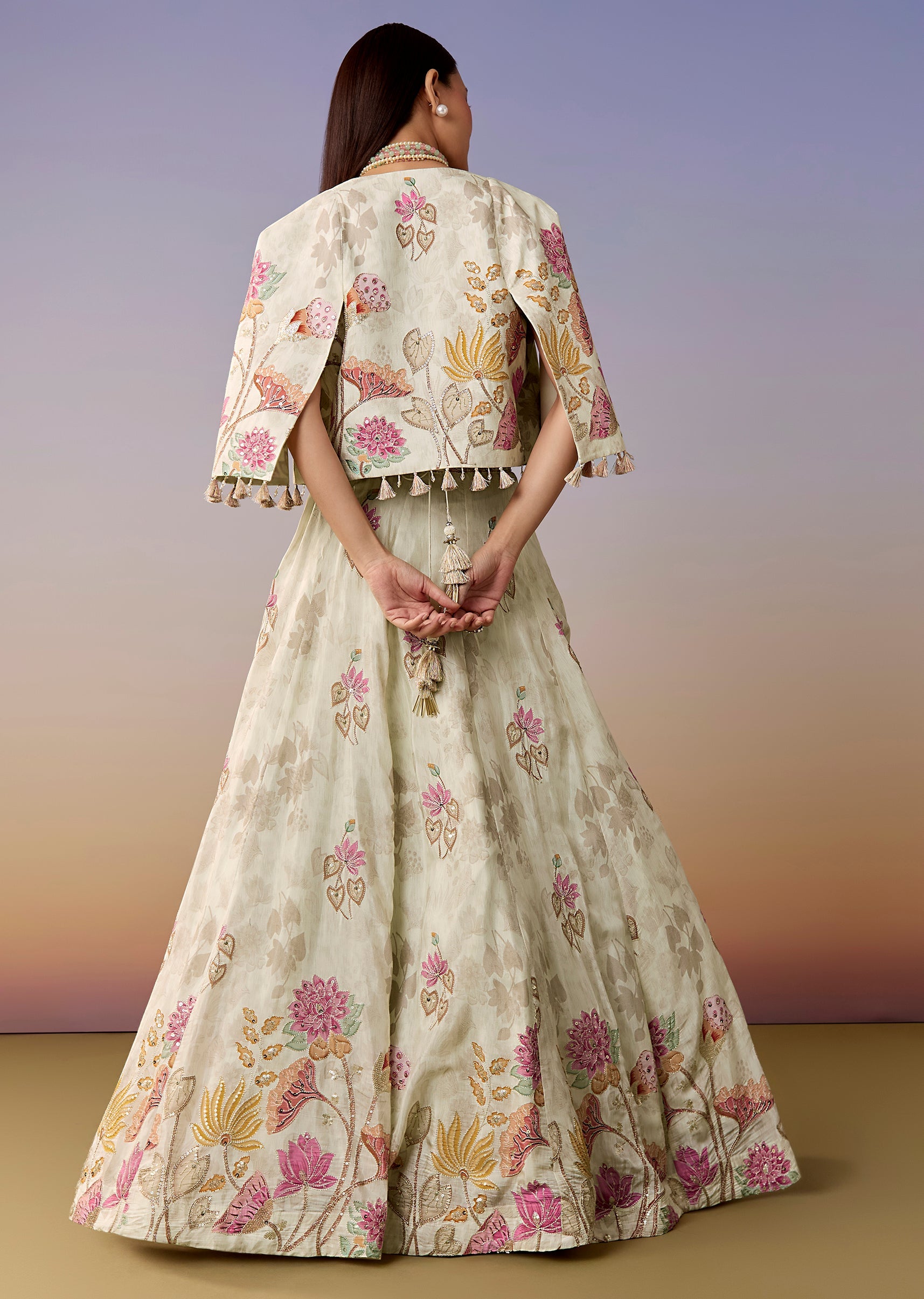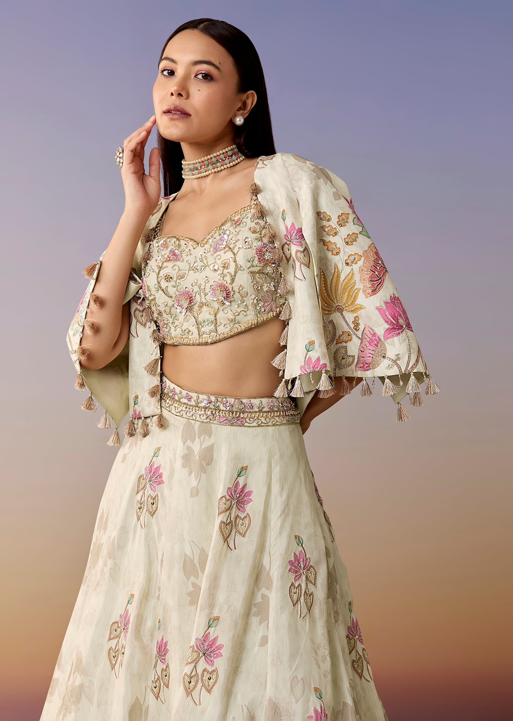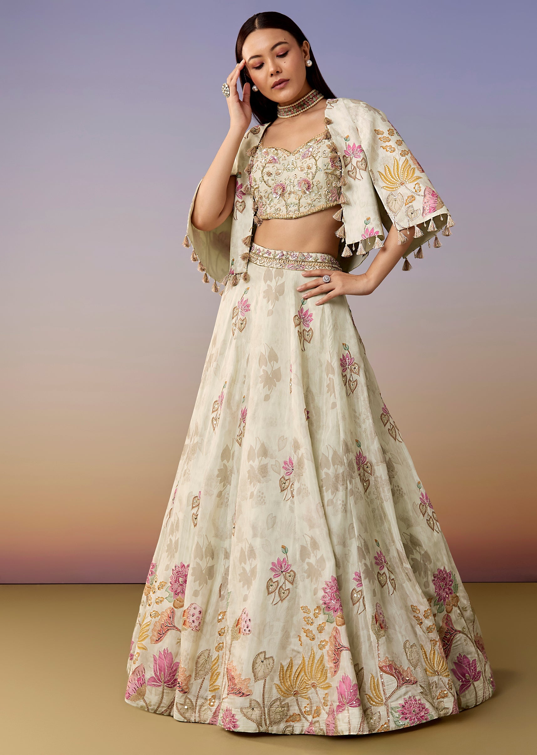A pastel-multi floral printed crepe lehenga set featuring a sweetheart sequin-work choli, flared lehenga, and a statement cape instead of a dupatta. A fresh pick for haldi, mehendi, and sangeet.... More Product Details