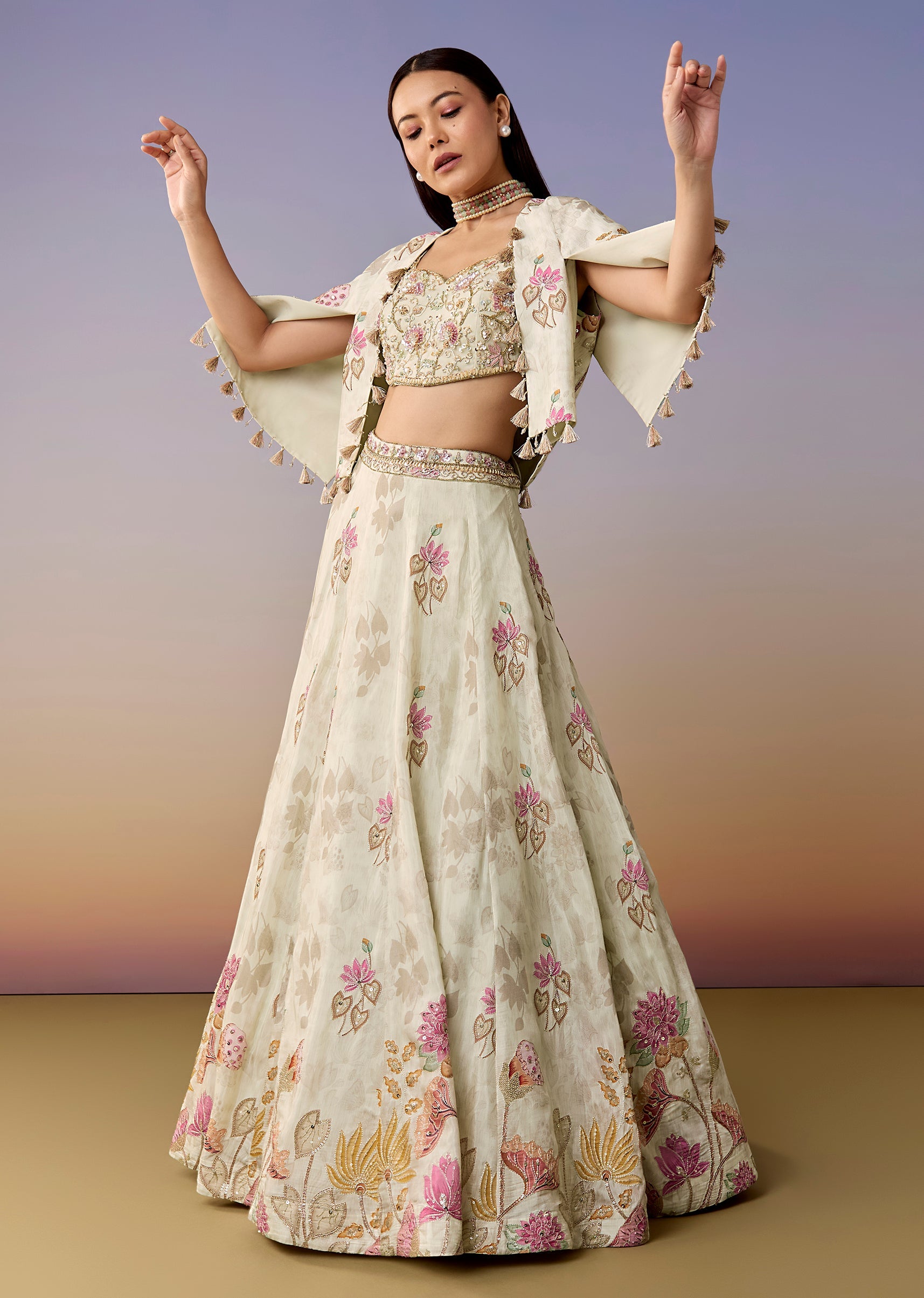 Ivory Floral Printed Lehenga Set with Cape