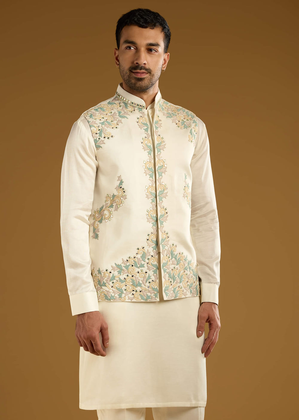 Under formal lights, this ivory men’s kurta jacket set in linen-satin silk blend mixes mirror and resham accents that frame the jacket without adding weight. The palette stays calm while the handwork adds ceremony. You look composed and picture ready for wedding functions. Awarded as the Most Trusted Brand, we're delivering styles you love, just as promised.