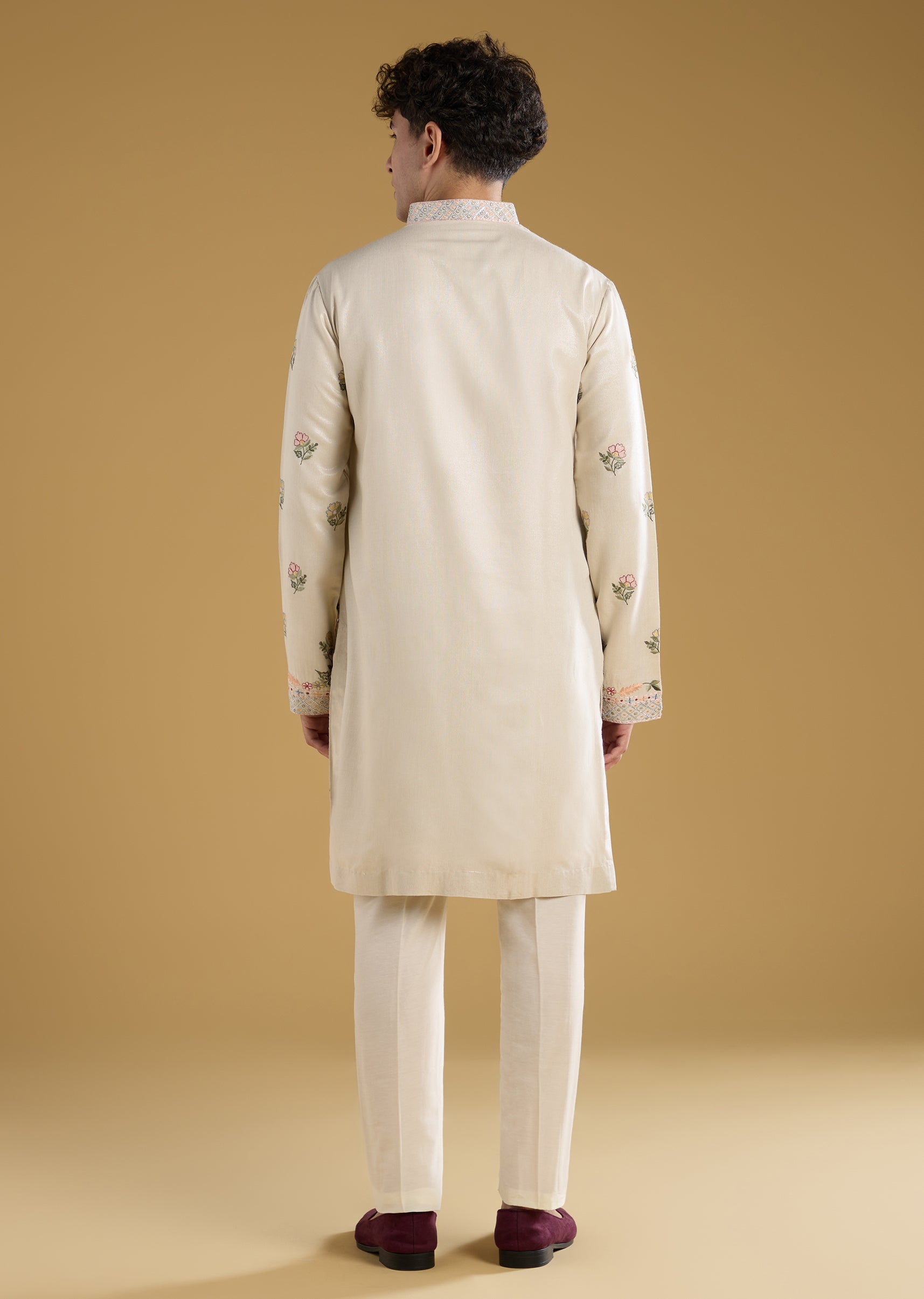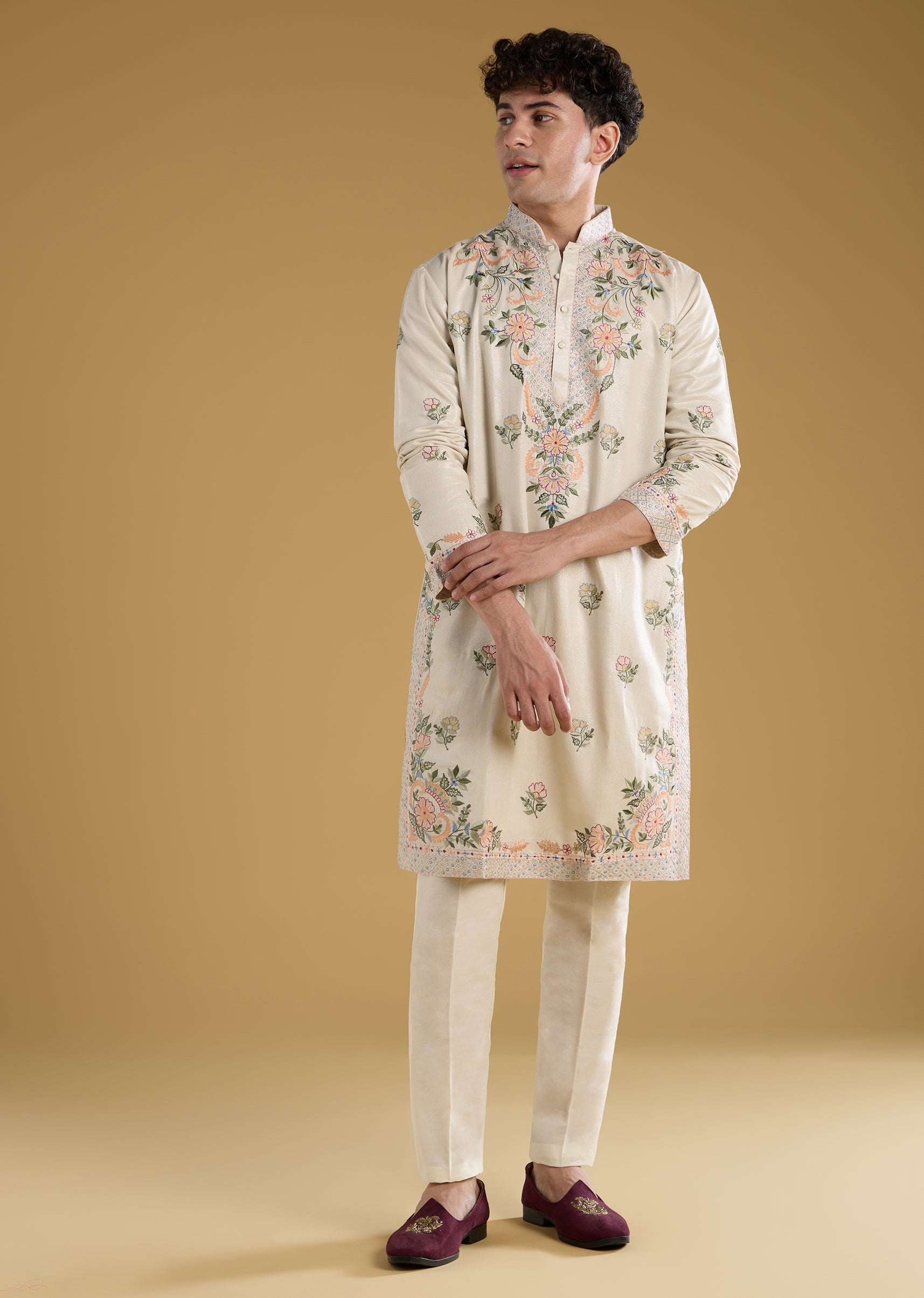 This ivory men’s kurta set is crafted in premium silk fabric featuring delicate resham thread detailing for a subtle and elegant festive look. Perfect for groomsmen at haldi or mehendi celebrations the full sleeves and mandarin collar provide a classic and refined finish. The pastel tone and intricate work make it ideal for daytime wedding events while ensuring comfort and style. Awarded as the Most Trusted Brand, we're delivering styles you love, just as promised.