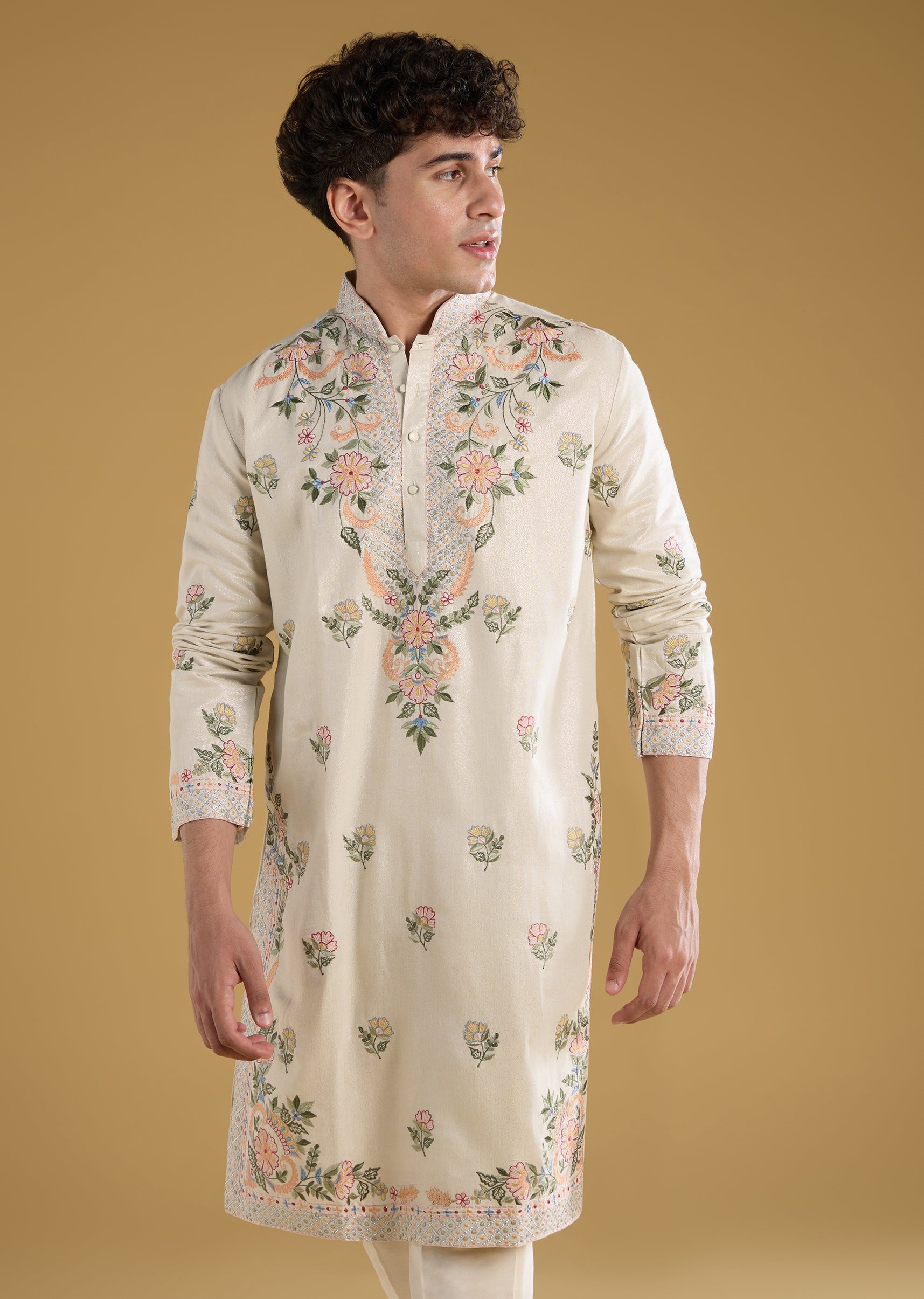 Ivory Mens Kurta Set With Resham Detail