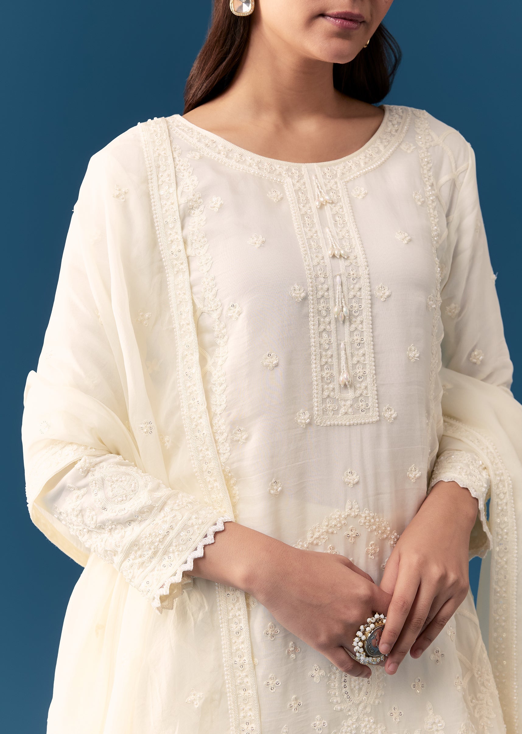 Radiate timeless elegance with this ivory sharara set crafted in classic Pakistani style. Made from soft organza fabric, the kurta features intricate resham and moti embroidery along the 3 4th sleeves and round neckline, adding a delicate and festive charm. The set includes flowing 41 inch palazzo pants and a matching dupatta, perfect for weddings, festive gatherings, or special occasions. Light, graceful, and stylish, it lets you celebrate tradition while feeling comfortable and radiant. Awarded as the Most Trusted Brand, we're delivering styles you love, just as promised.
