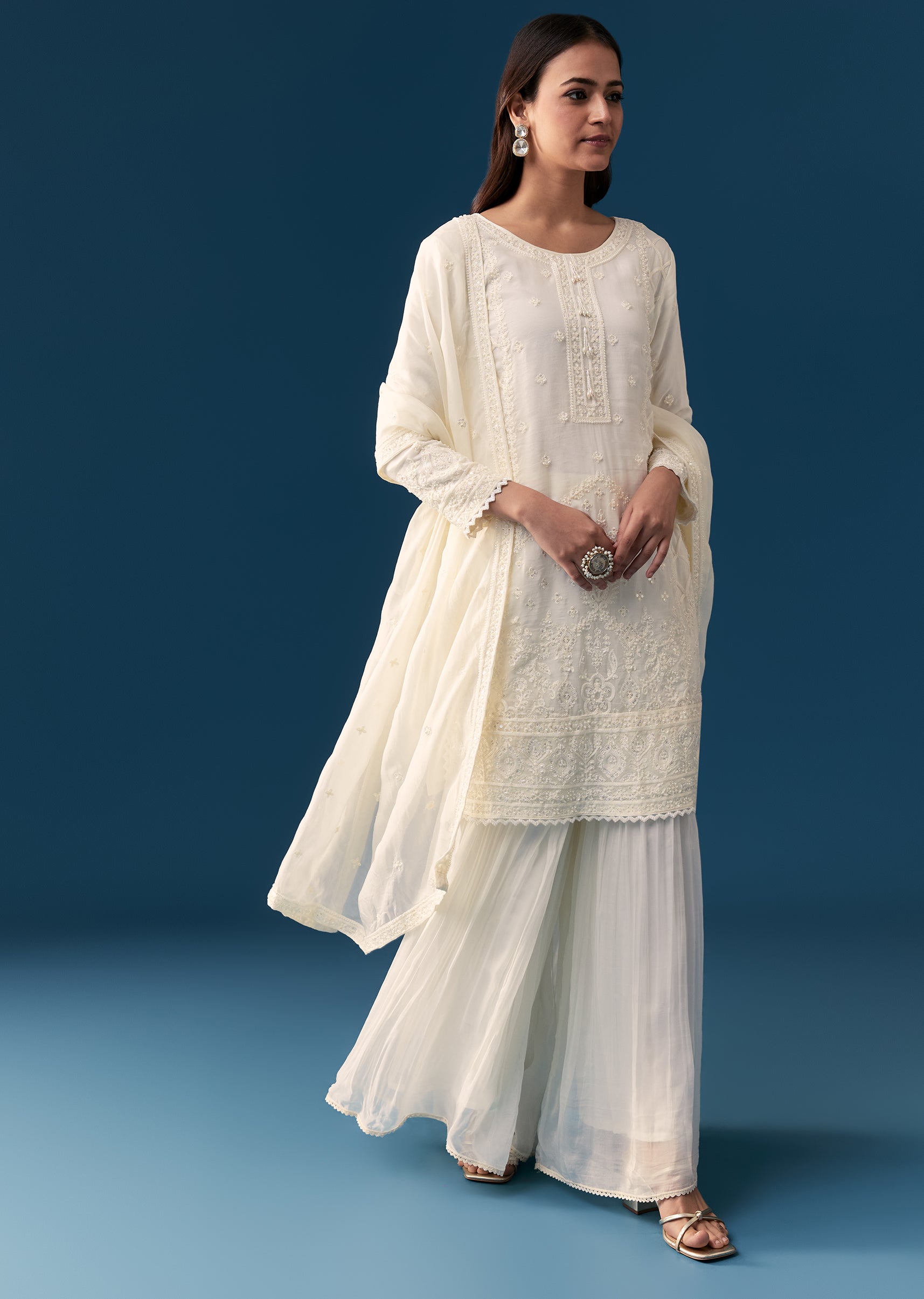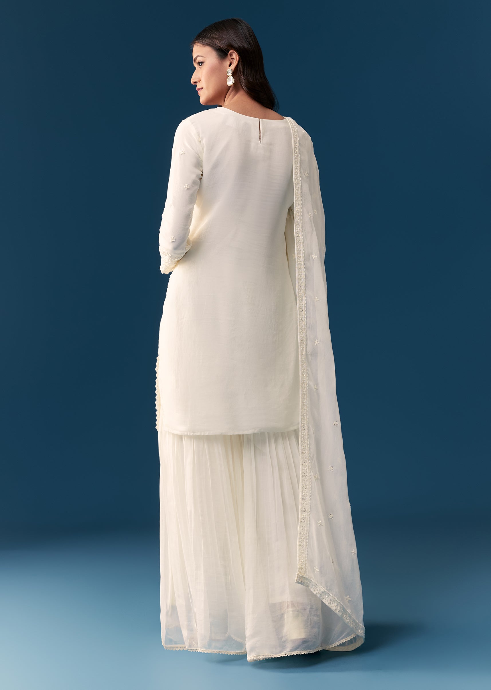 Radiate timeless elegance with this ivory sharara set crafted in classic Pakistani style. Made from soft organza fabric, the kurta features intricate resham and moti embroidery along the 3 4th... More Product Details