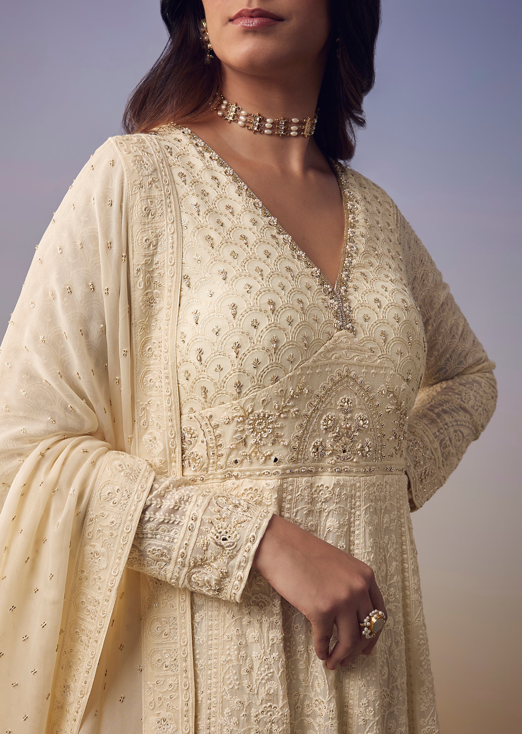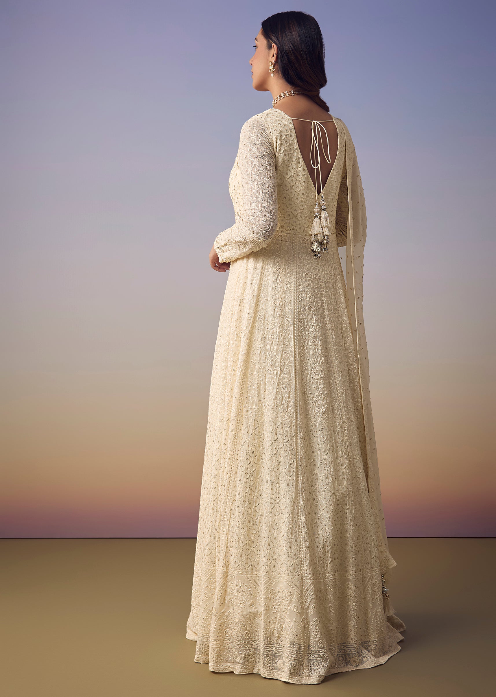 Embrace soft glamour with this ivory floor length anarkali crafted in flowing georgette and adorned with shimmering sequins and delicate thread work that add subtle festive brilliance. The full sleeve... More Product Details