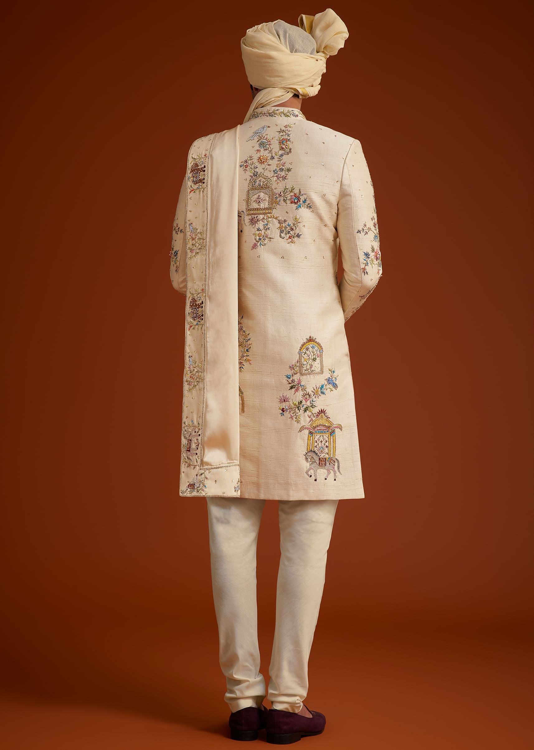 - This ivory sherwani is a masterpiece of elegance, adorned with intricate multicolored floral embroidery that exudes regal charm.