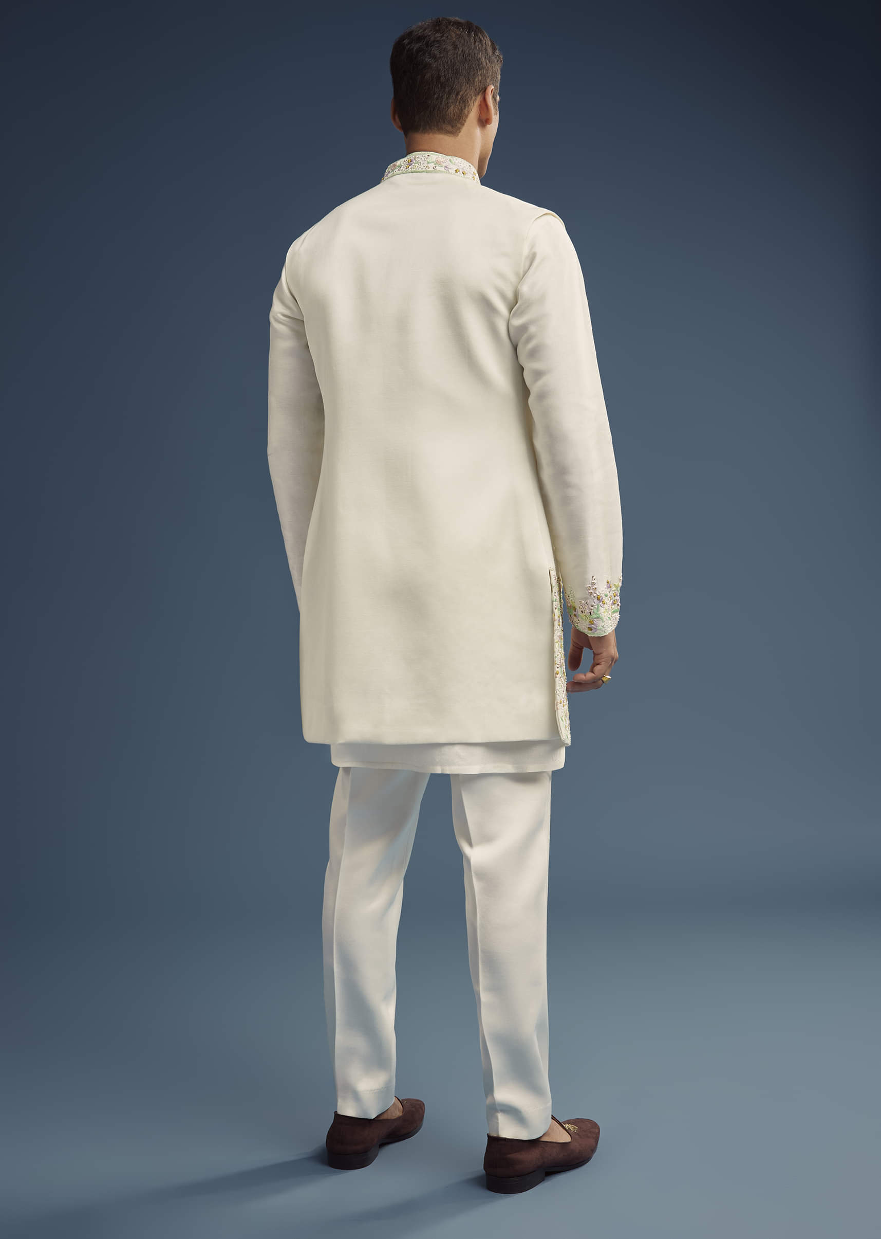 Ivory Silk Kurta Jacket Set For Men With Zardosi Work