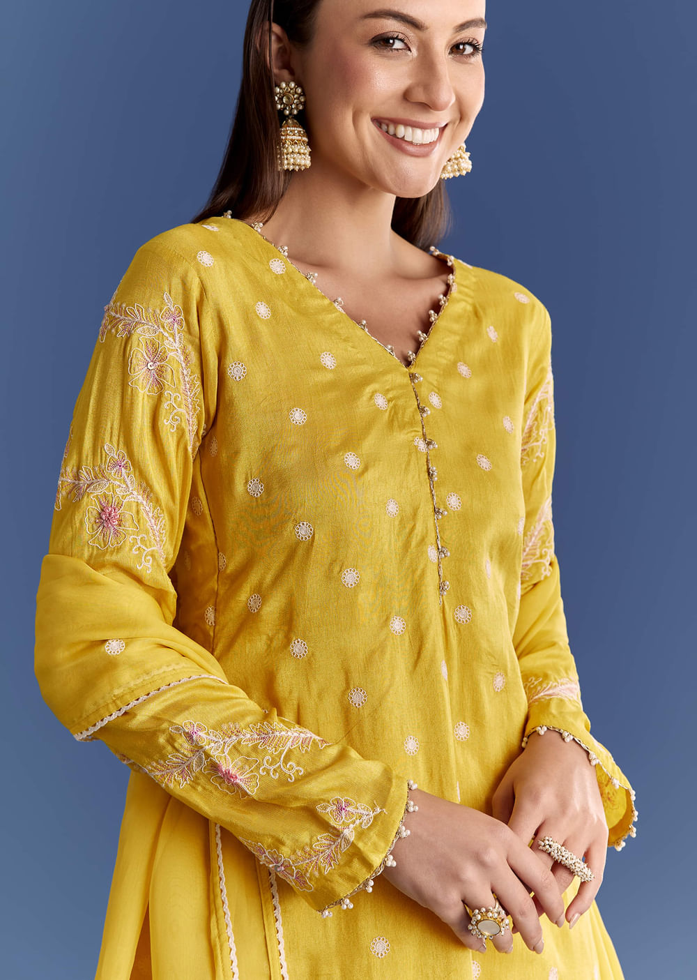 The dupatta sits best when lightly pleated across the shoulder.