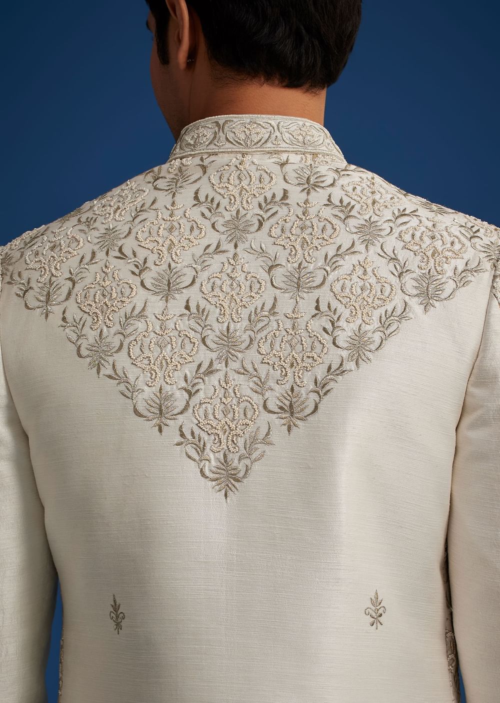 Drape yourself in timeless opulence with this ivory silk sherwani, adorned with intricate resham zari and zardosi embroidery. The delicate pearl and sadi work accentuate the regal charm, making it... More Product Details
