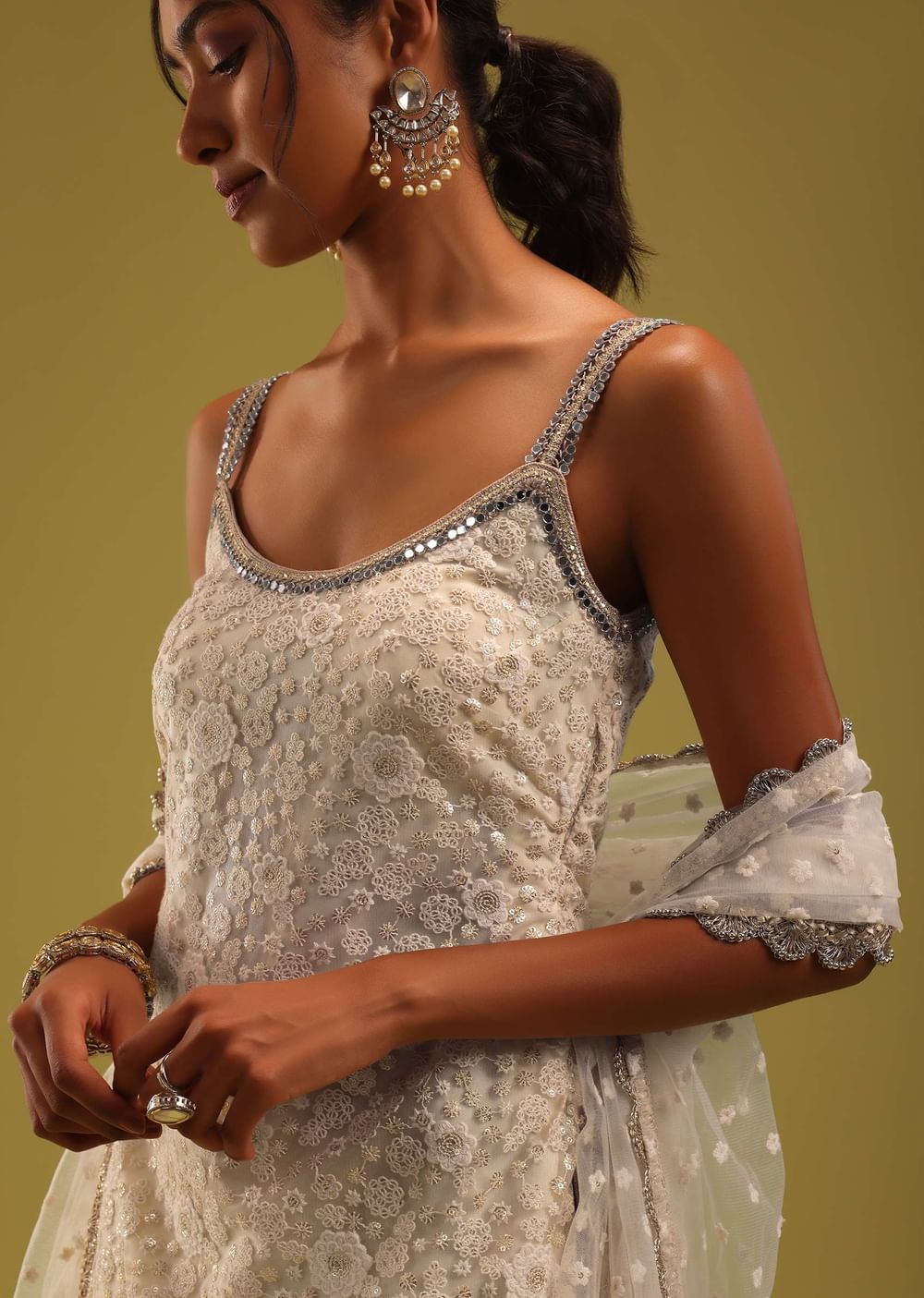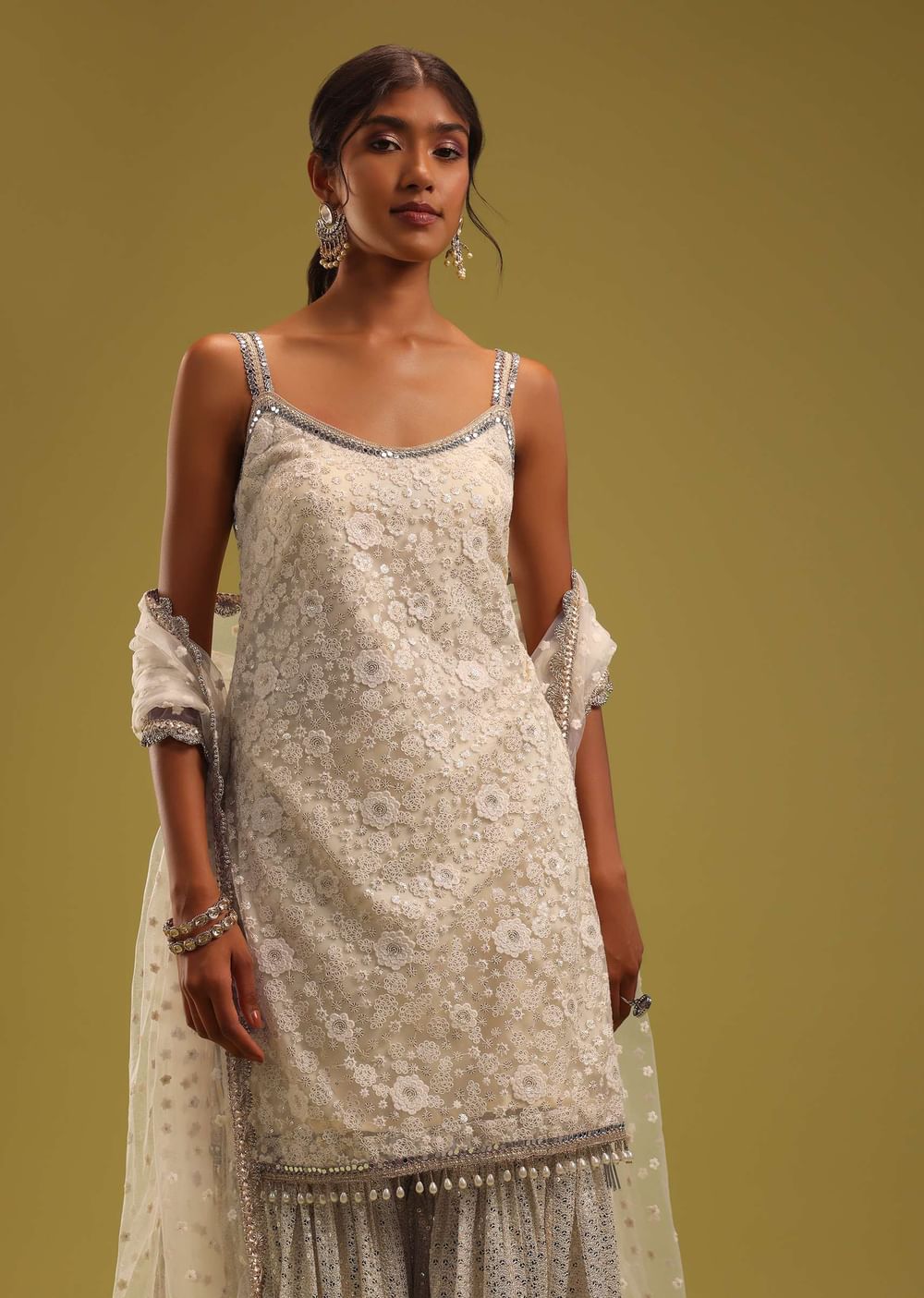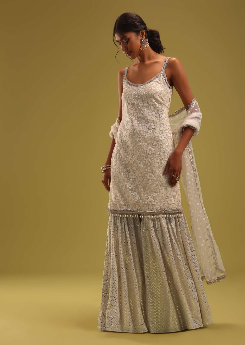 Step into a world of ethereal charm with our ivory white net kurti and georgette sharara set, a mesmerizing ensemble that embodies grace. Meticulously adorned with intricate Lucknowi embroidery, featuring... More Product Details