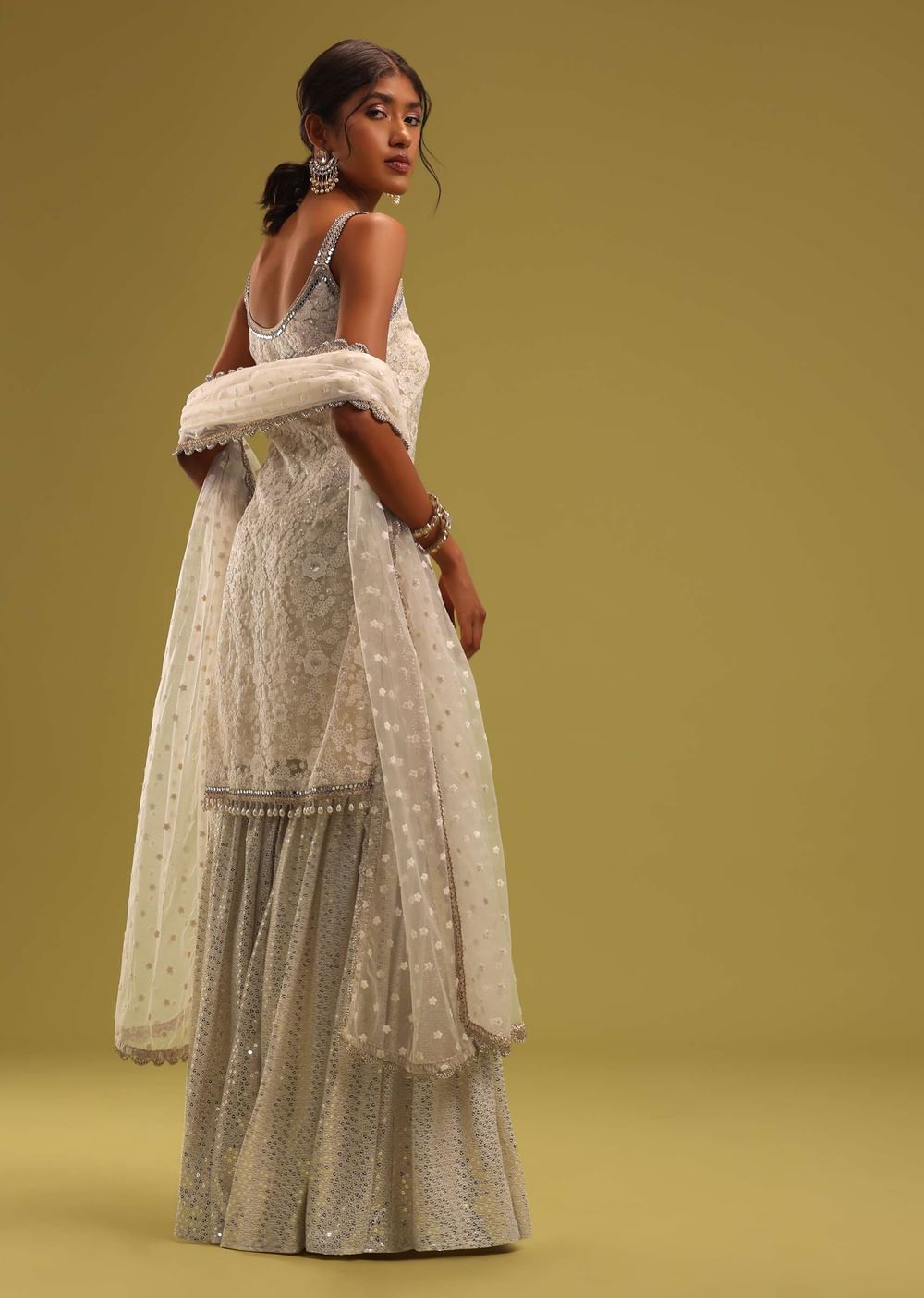 Ivory White Lucknowi Embroidered Net Kurti And Georgette Sharara Set