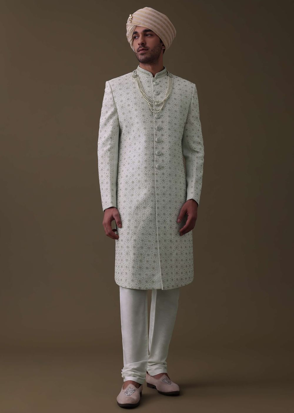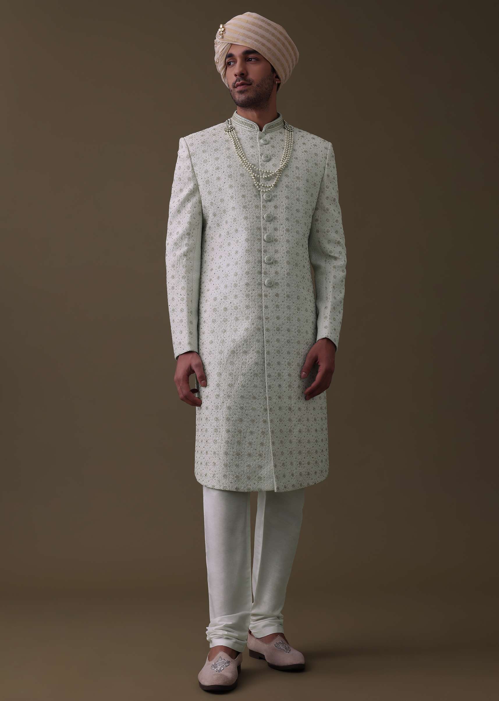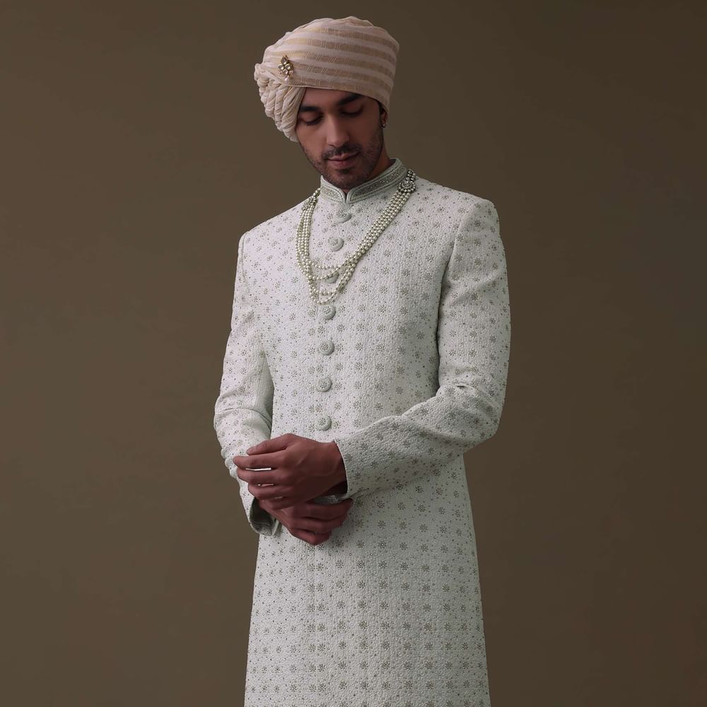 Introducing our elegant ivory white sherwani set.The detailed cut dana work on the sherwani adds a unique and luxurious touch.The sherwani comes in a mandarin collar neckline with full sleeves.The set comes with a matching churidar and a mala.EVENT - Perfect for weddings.NOTE - Buttons and accessories may vary in color, shape and size.Change folds regularly. Awarded as the Most Trusted Brand, we're delivering styles you love, just as promised.